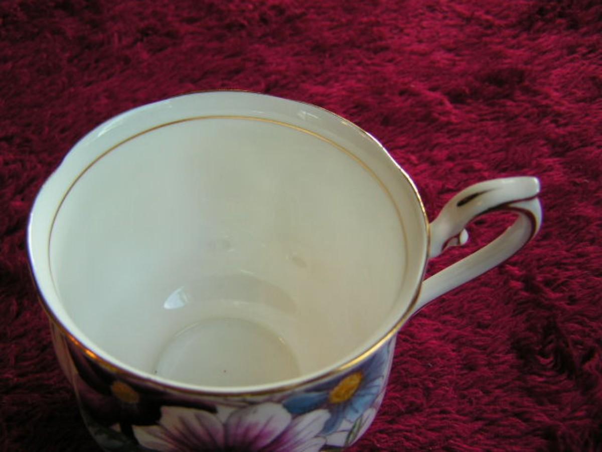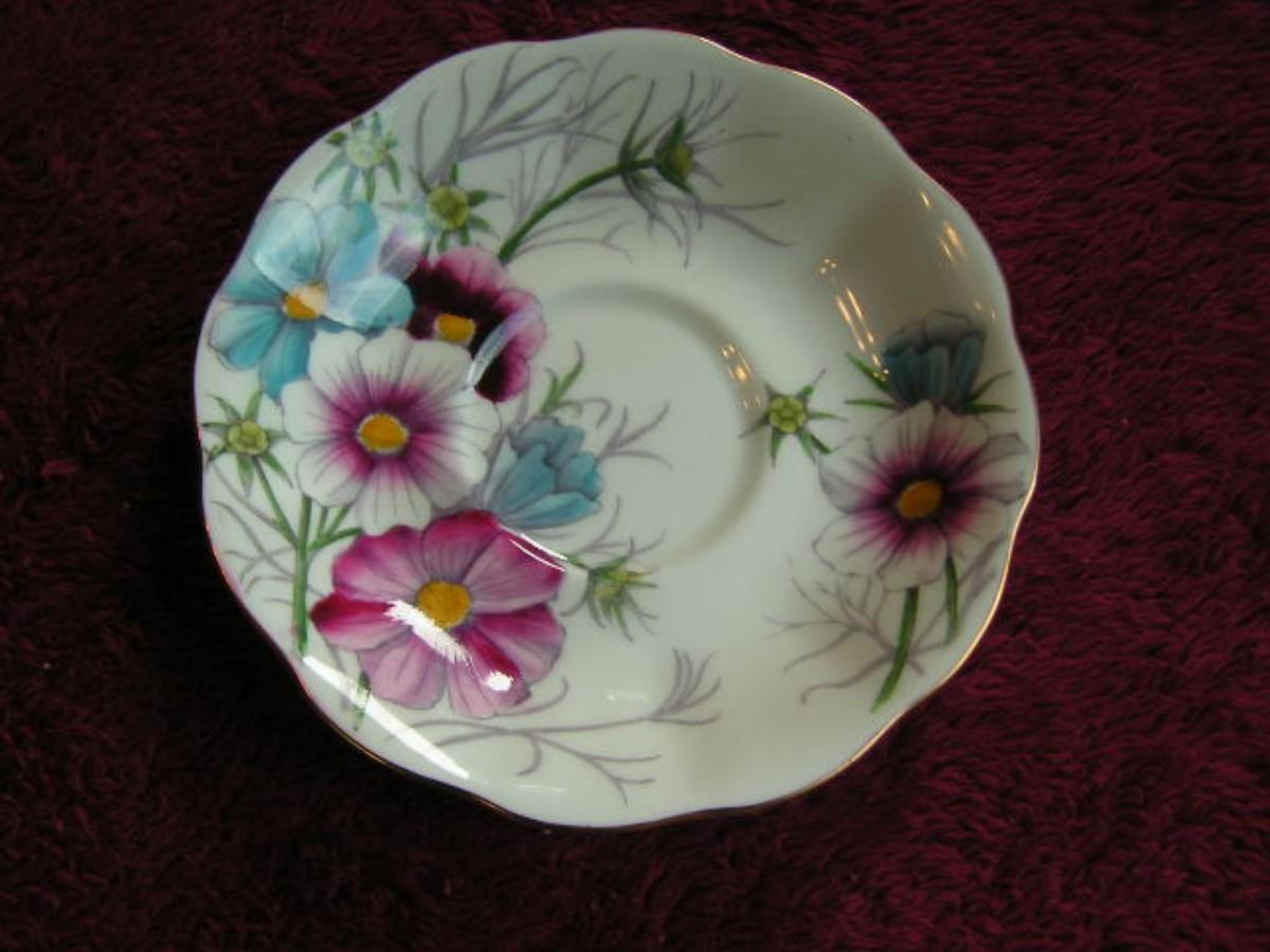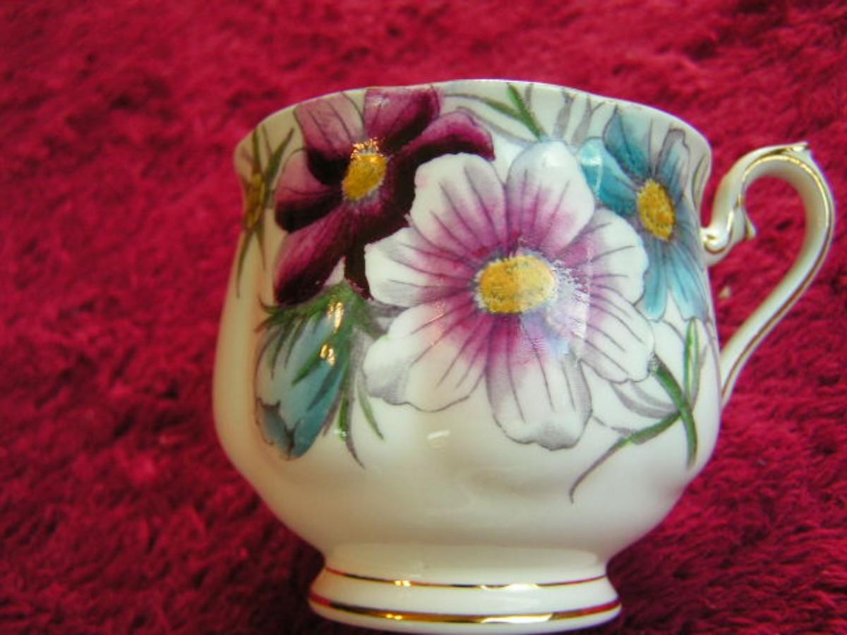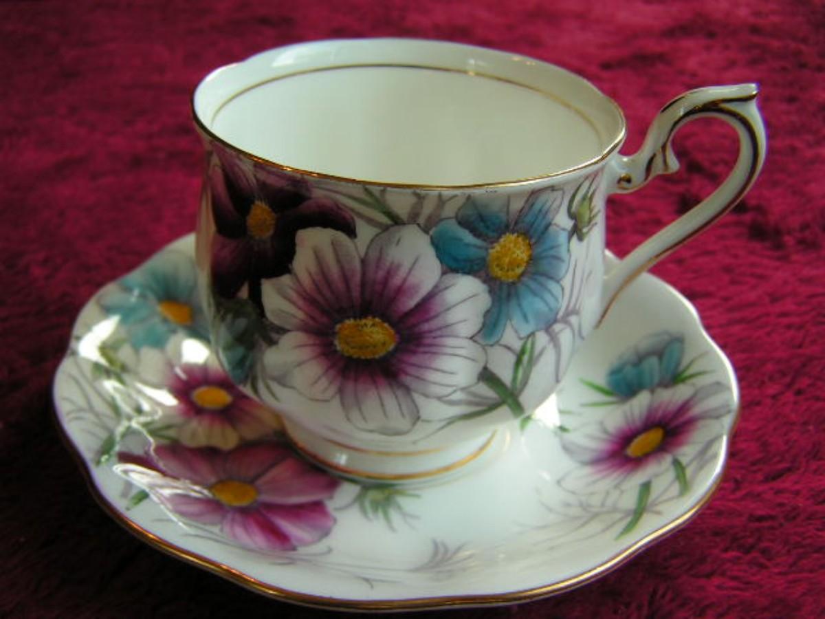 Vintage “Royal Albert” bone china (porcelain) teacup & saucer set. “Flower of the month series” “Cosmos”. Hand painted, made in England. Gold trimmed