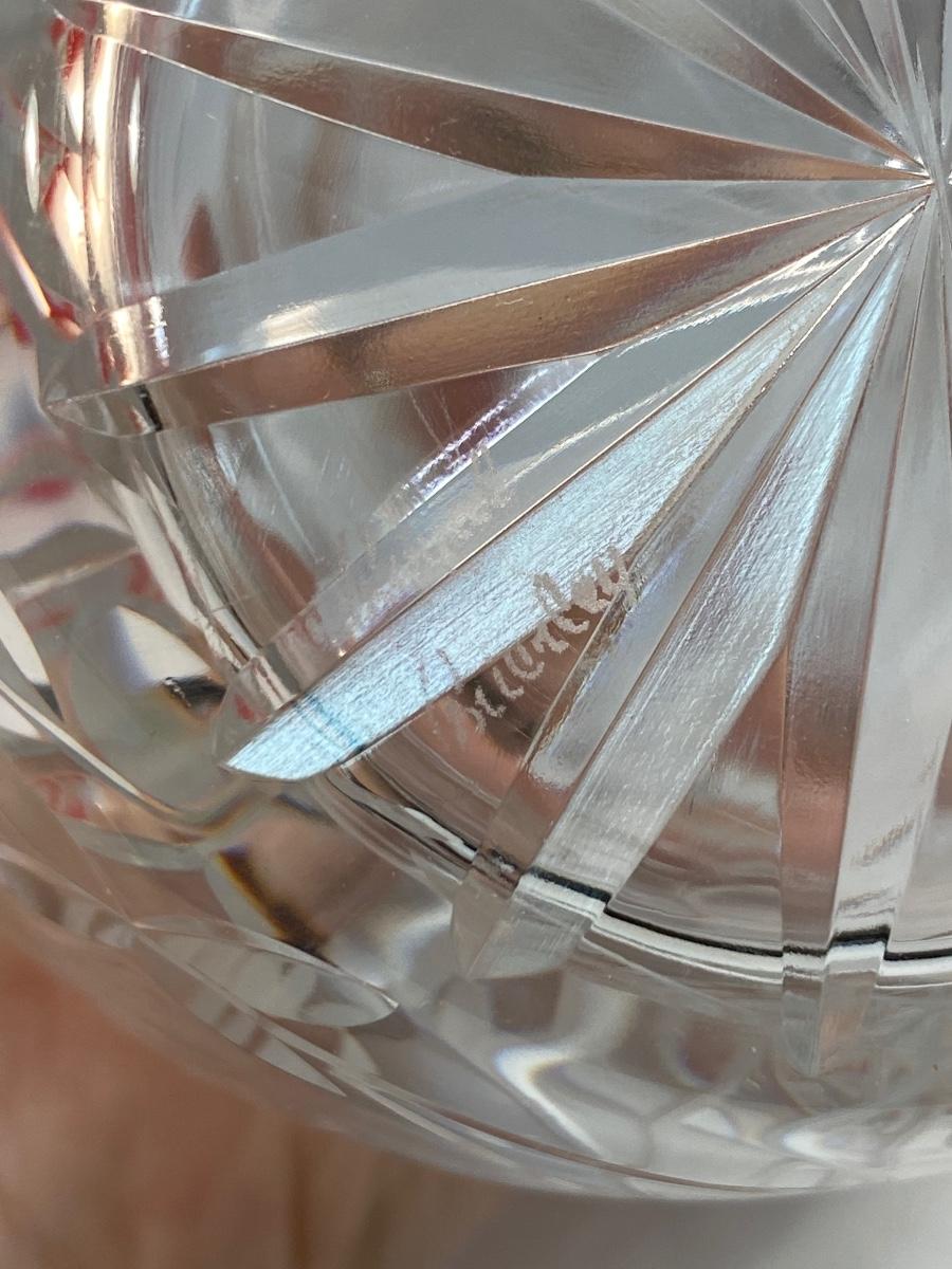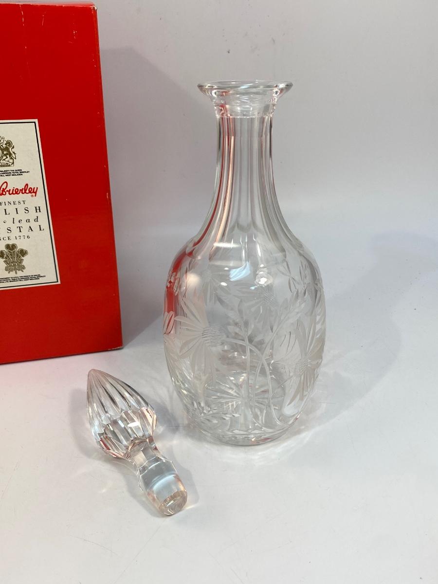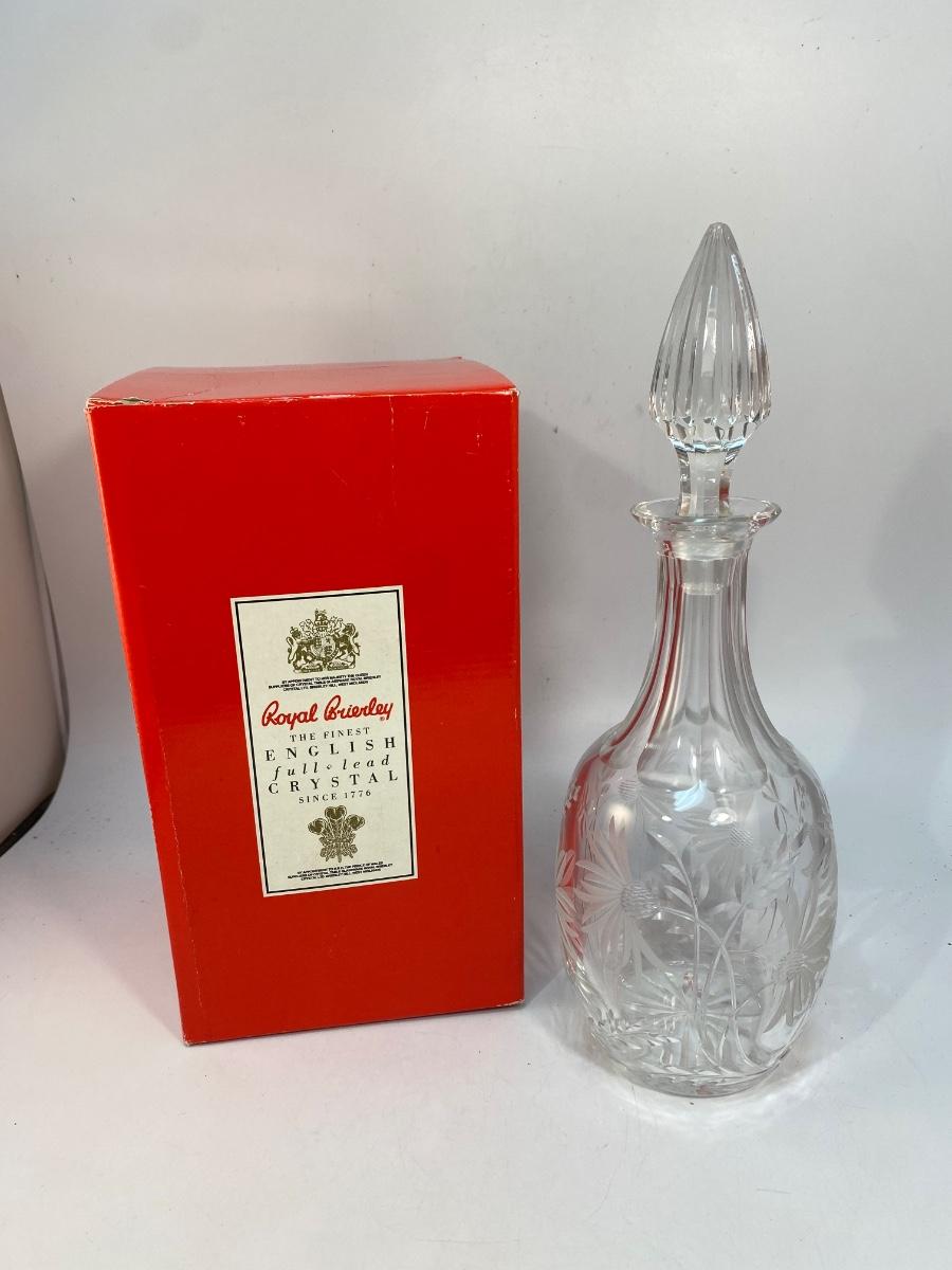 Vintage Royal Brierley English Lead Crystal Decanter Bottle Floral Etched in Box. In very good condition. No chips. Comes in original box. Flower etched design. Stamped Royal Brierley on the bottom of bottle. About 13" tall with stopper.