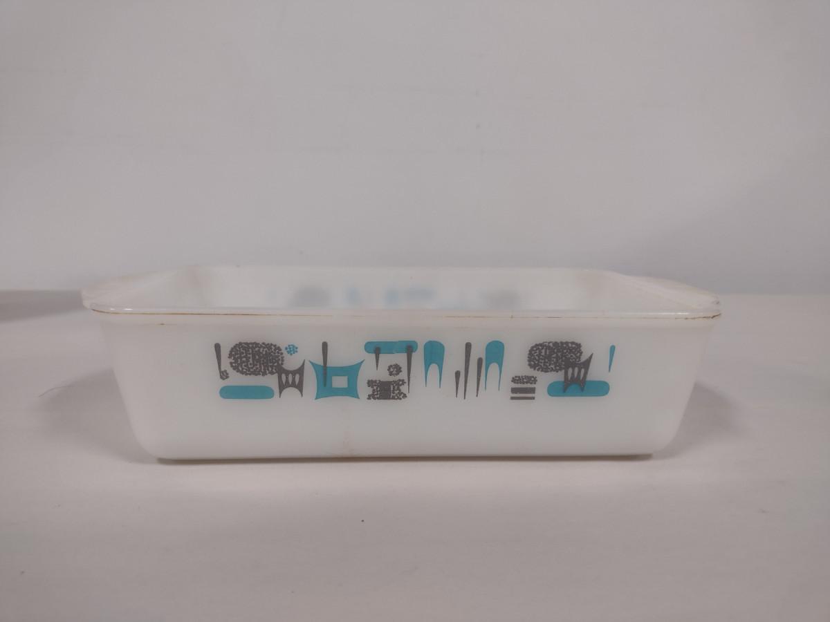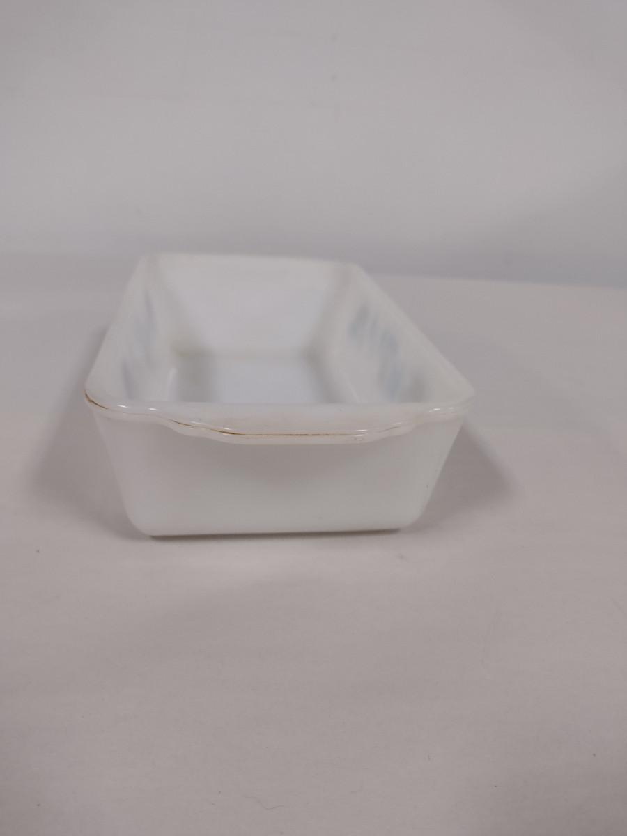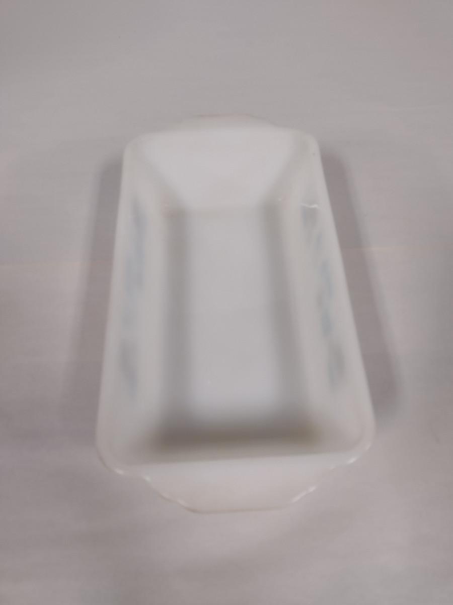 Vintage Royal China Milk Glass Bread Pan- Blue Heaven Pattern (Choice A). Item needs cleaning- has baked on residue.