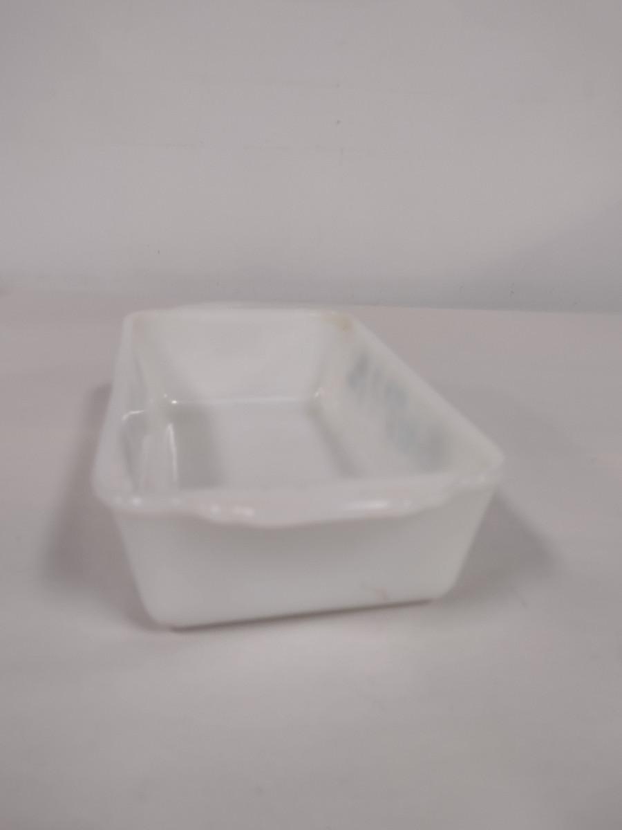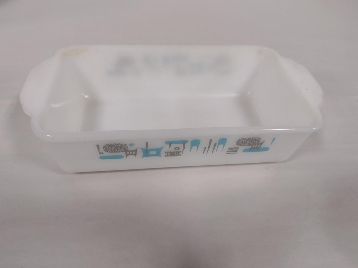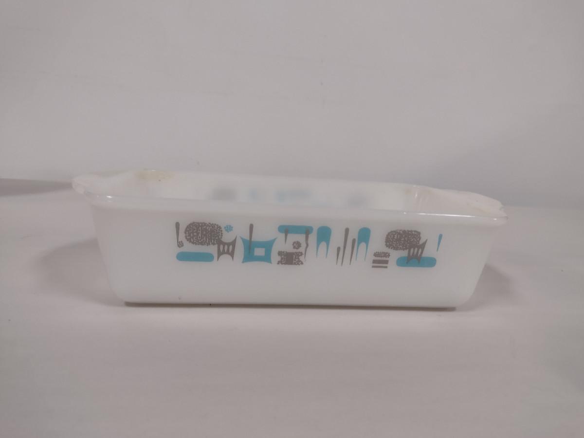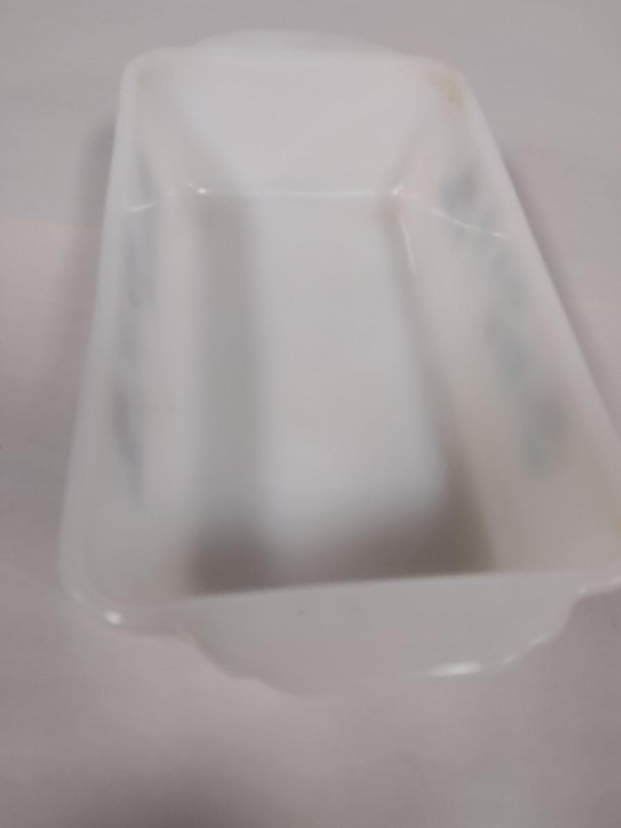 Vintage Royal China Milk Glass Bread Pan- Blue Heaven Pattern (Choice B). Item needs cleaning- has baked on residue.