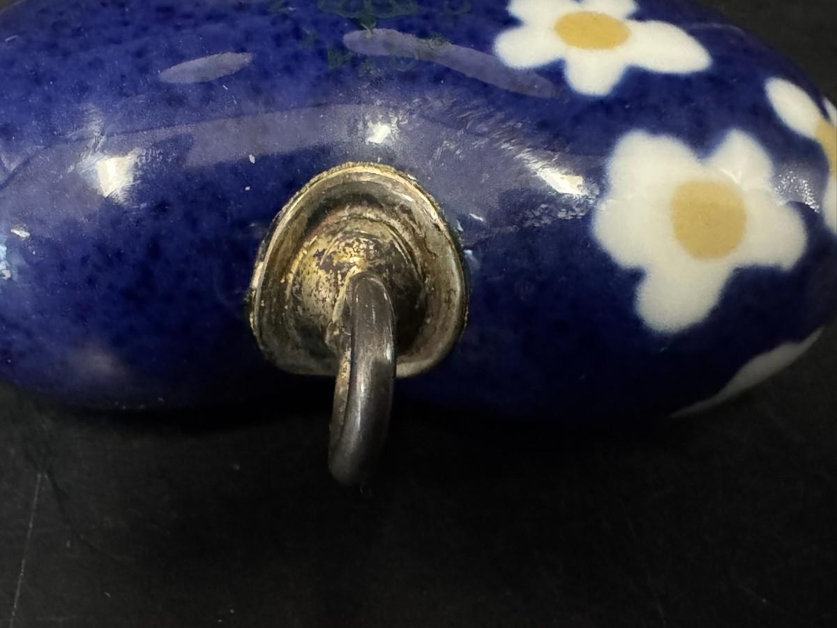 This piece is blue with yellow and white flowers. The finding is marked “925.” There are no obvious chips or cracks. Measurement: 2.5”H x 2.25”W. Pre-auction estimate: $100-$150. [JP]