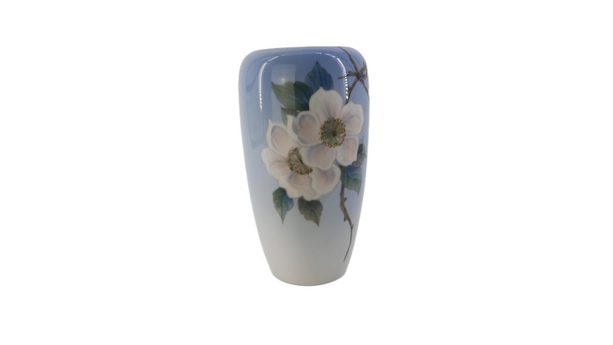 Vintage Royal Copenhagen Denmark porcelain vase with flowers and butterfly. Great condition, one small scratch found (see photo). Marked and signed on bottom. Measures L 5.5" x H 9.5". Weighs 1 lb 14 oz. (C19)