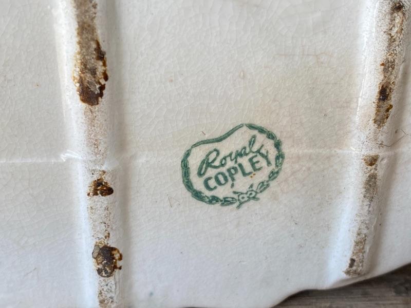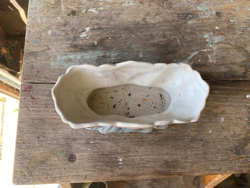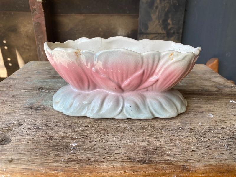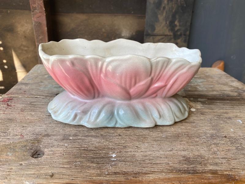 Vintage Royal Copley pottery planter. Oblong shaped lotus flower pattern. White, pink, and blue color. No chips, but there is crazing all over with some crack lines.
