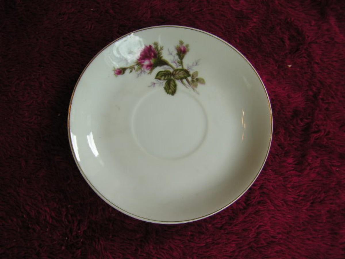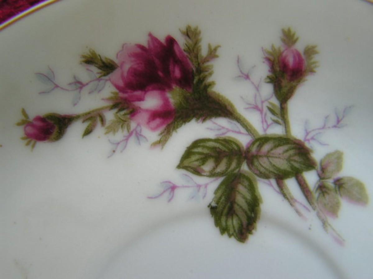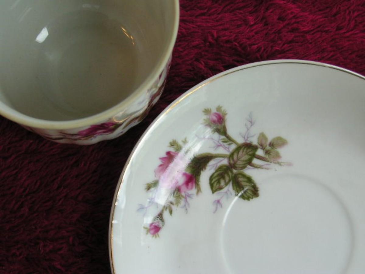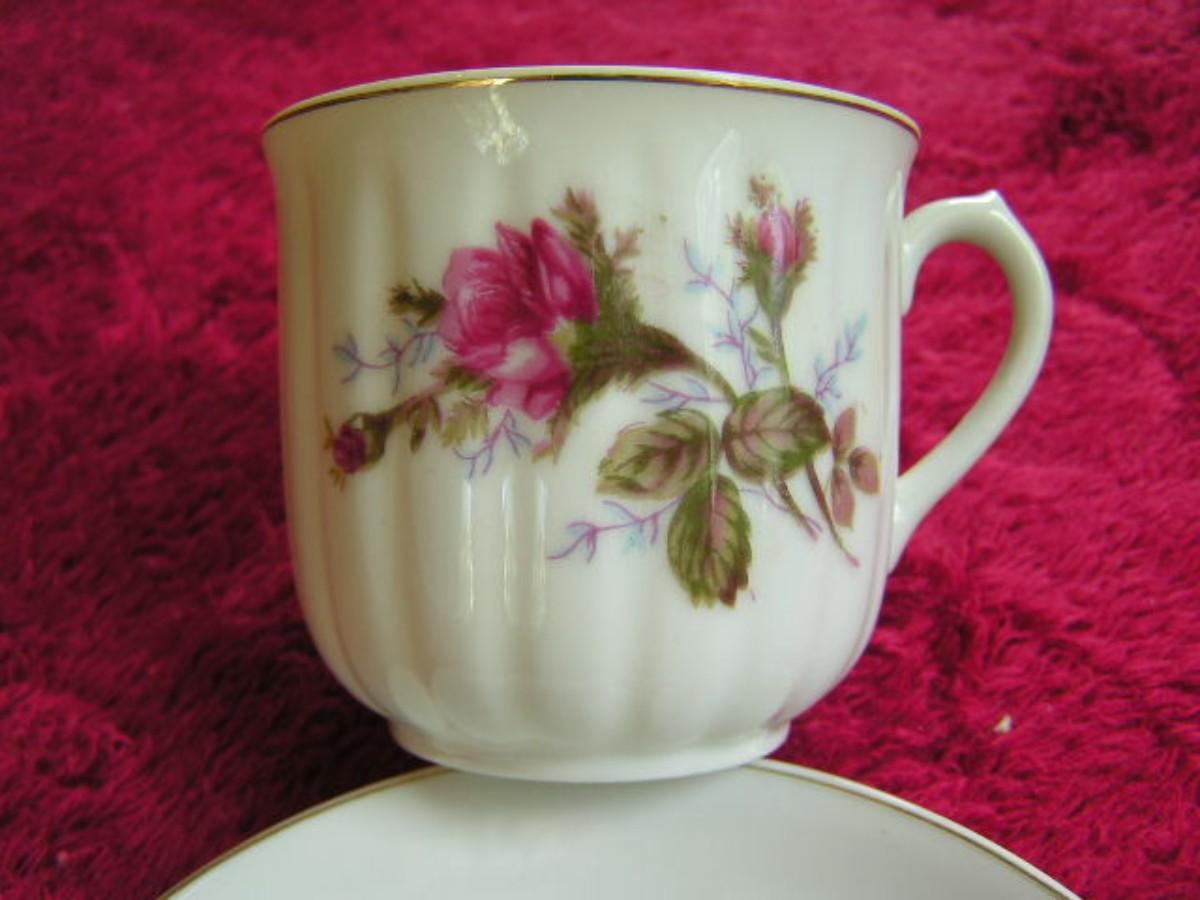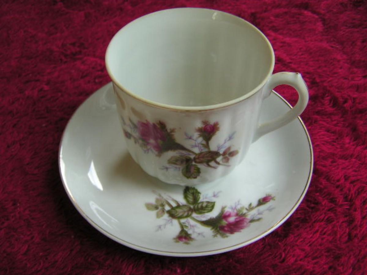 Vintage Royal Crafts Japan porcelain fine china teacup & saucer set, Moss Rose pattern. Gold trimmed.