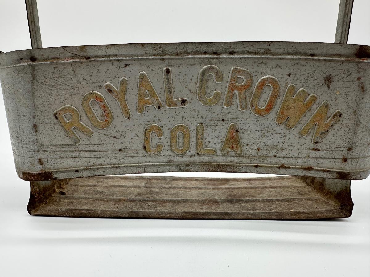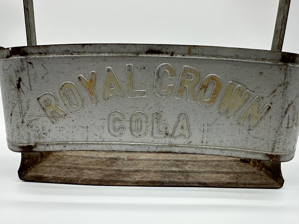 Original Royal Crown Cola (RC Cola) galvanized metal bottle carrier with bail handle. Embossed ROYAL CROWN COLA lettering on both sides. Classic soda advertising piece used for carrying glass bottles. Great display item for a bar, kitchen, soda collection, or vintage advertising decor.