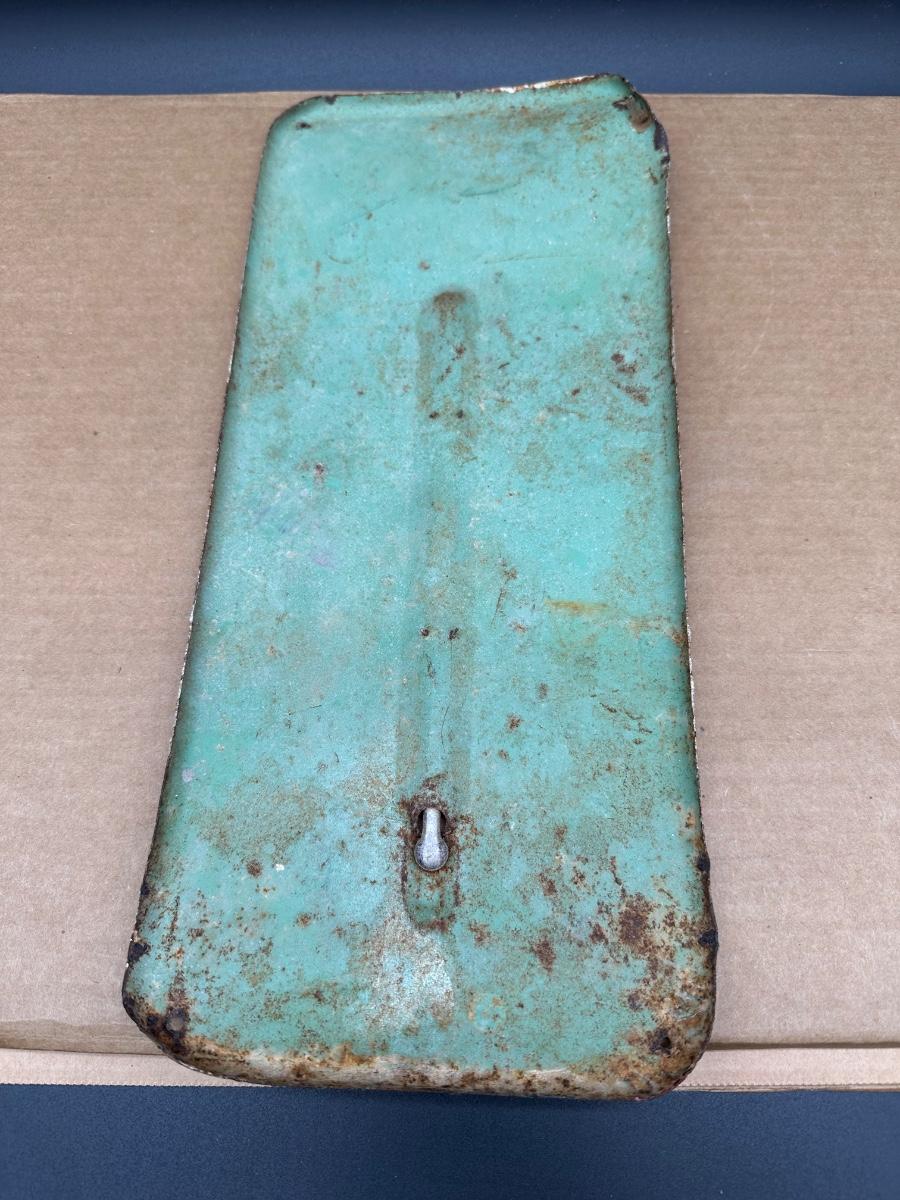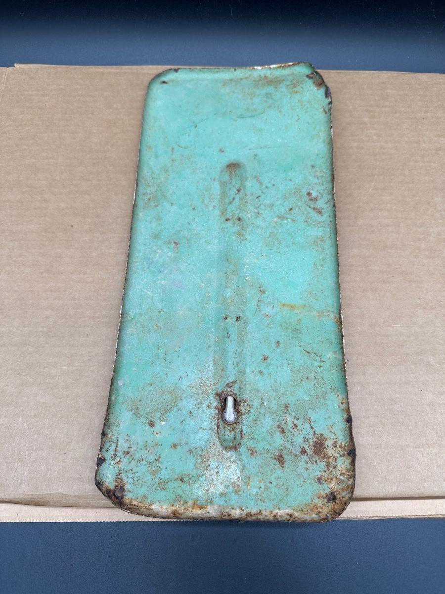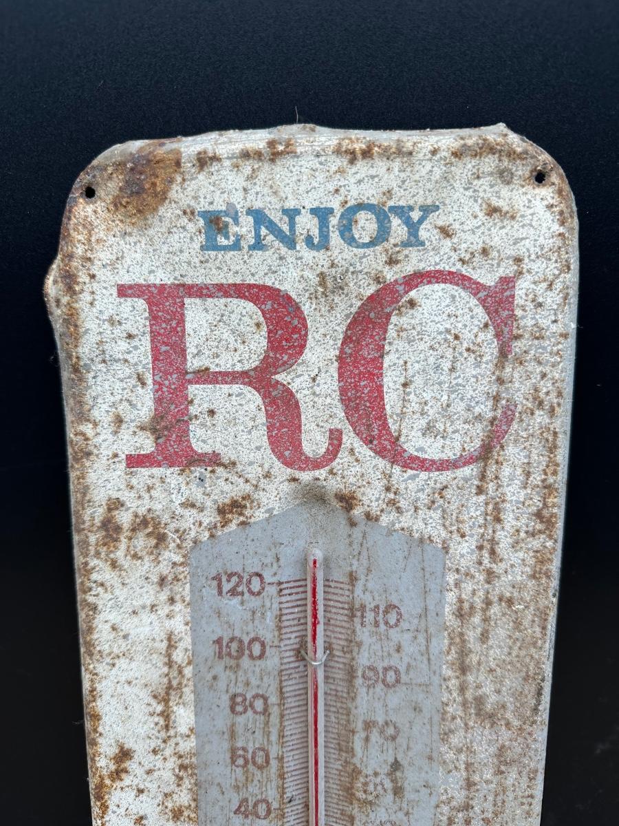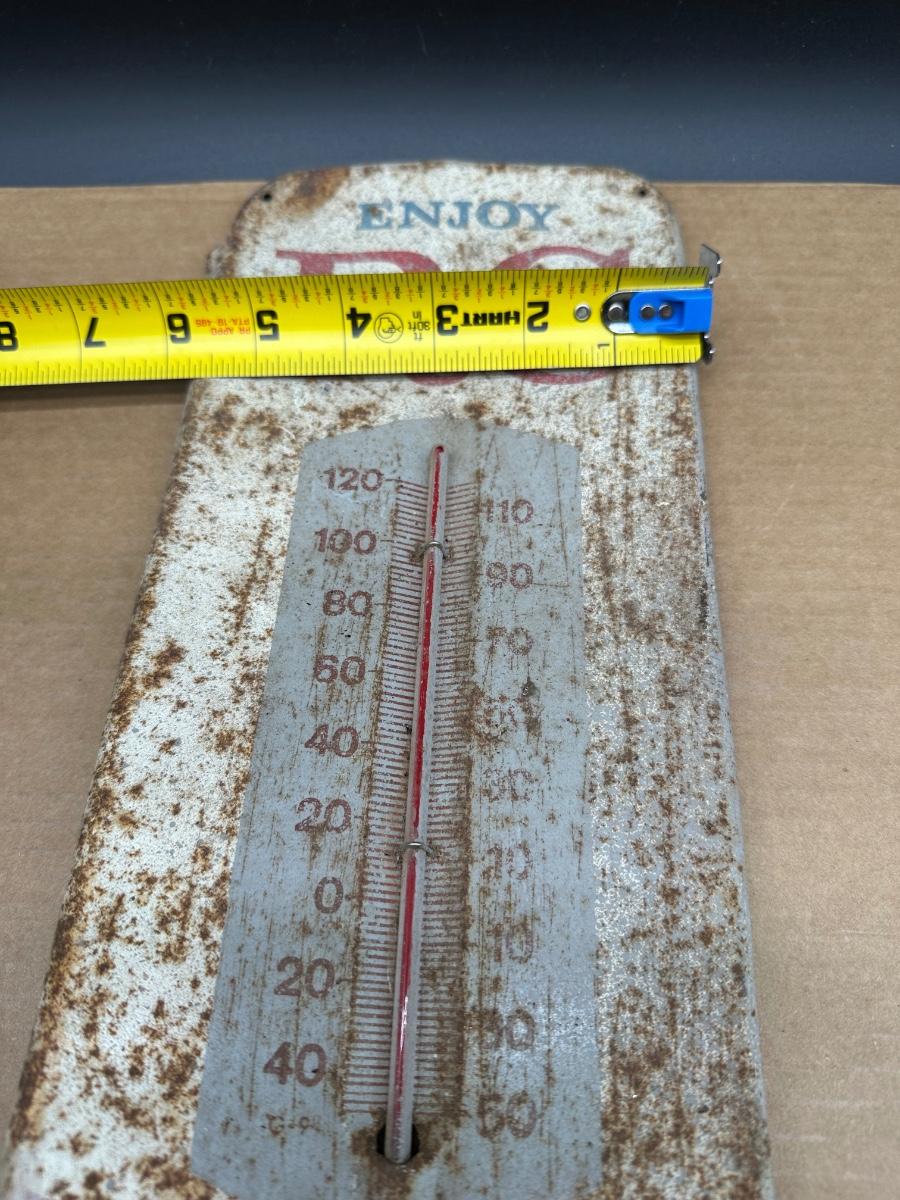 Original vintage Royal Crown (RC) Cola metal thermometer sign featuring classic “Enjoy RC” branding. Painted metal with embossed edges and an integrated glass thermometer tube. Heavy, authentic piece with strong age, rust, and patina—not a reproduction look.