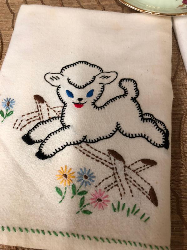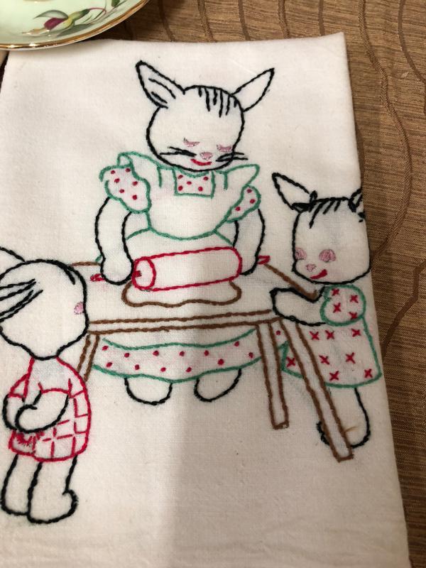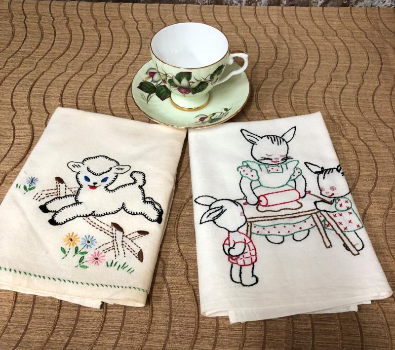 vintage ROYAL GRAFTON TEACUP & SAUCER w EMBROIDERED HAND TOWELS 1950s