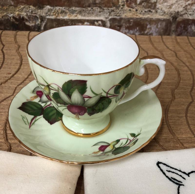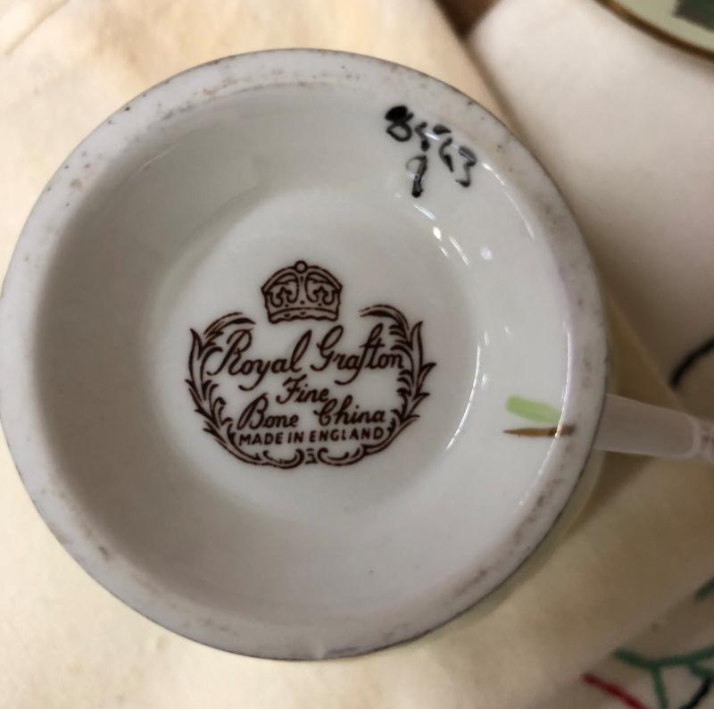 Excellent condition on this collectible teacup & saucer set by Royal Grafton of England and a pair of hand embroidered towels...Circa 1950's...