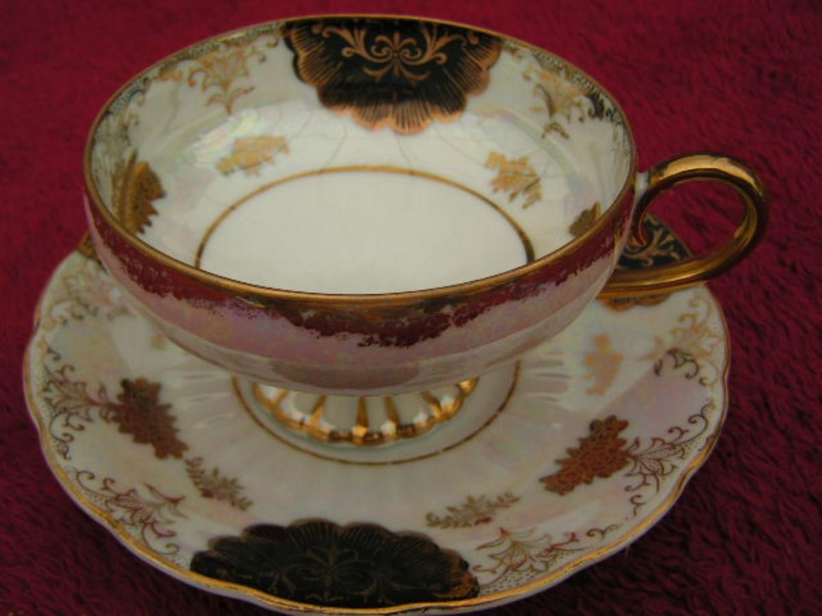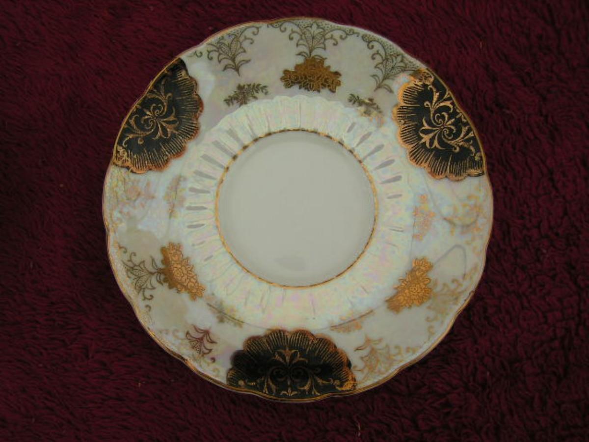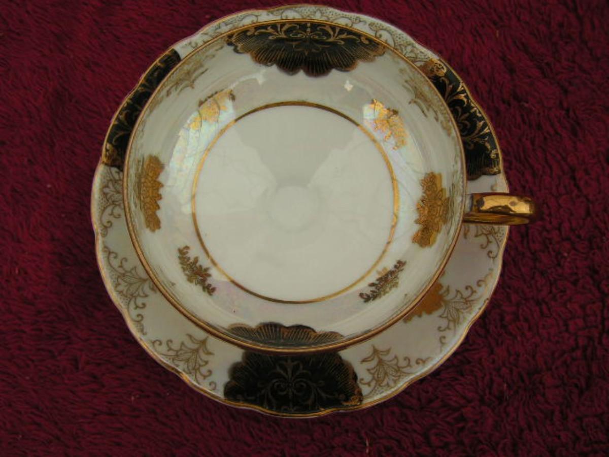 More tea sets like this elsewhere in this sale. Vintage Royal Halsey L M very fine bone china porcelain teacup & saucer set. Delicate elegant gold designs on unusual black fans and white background. Pearlescent finish over all. Made in Japan and imported by Lipper & Mann of New York, c.1940s-50s.