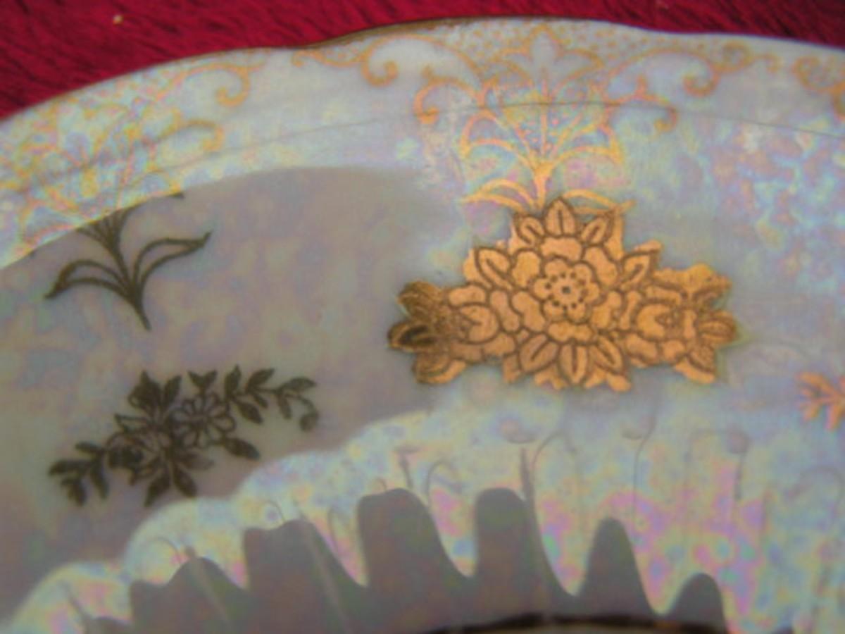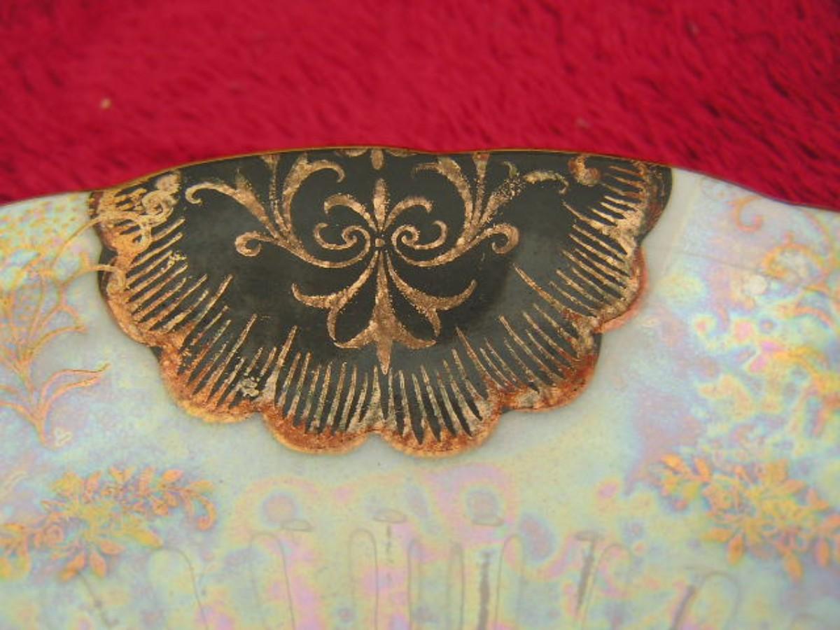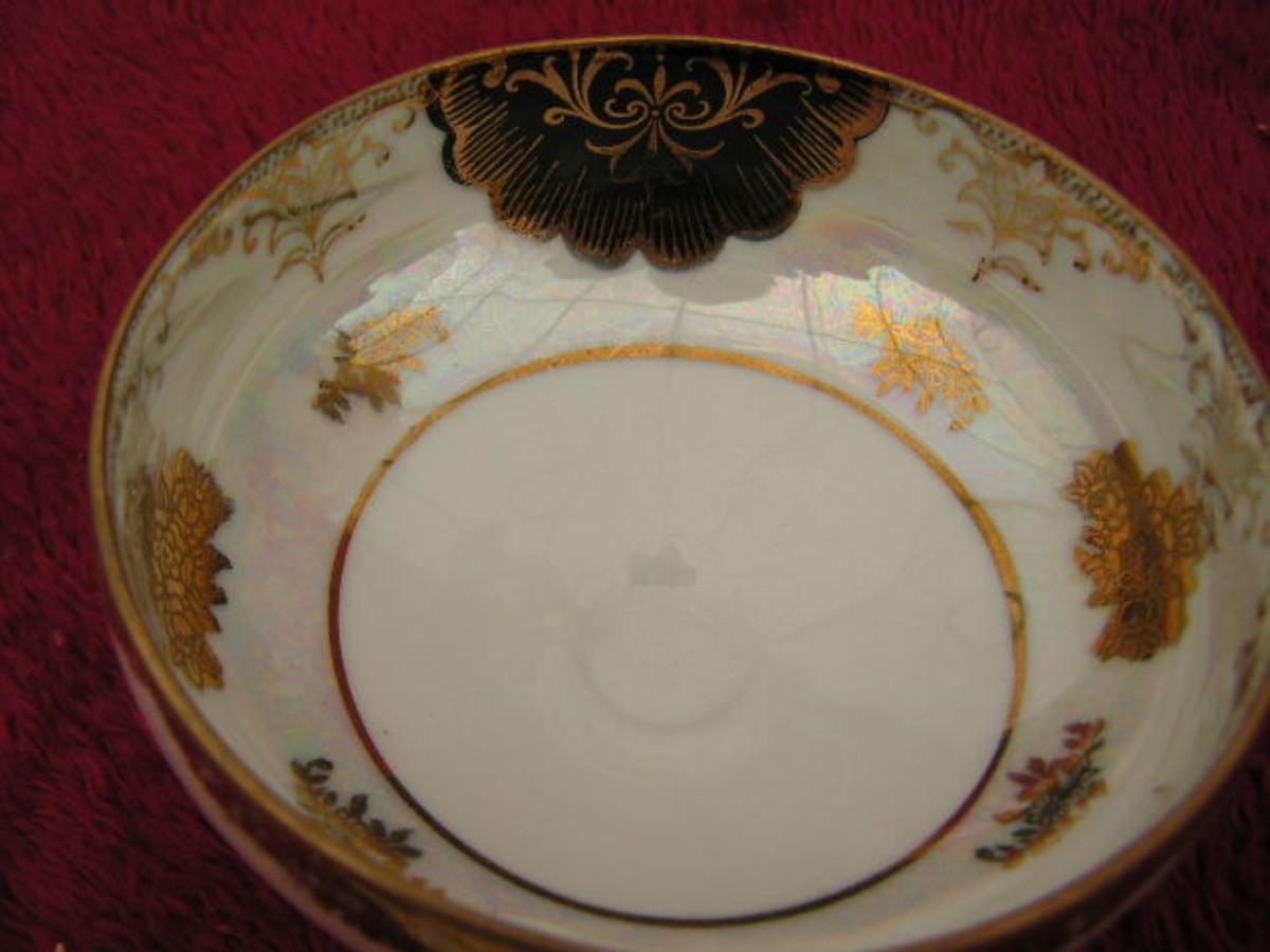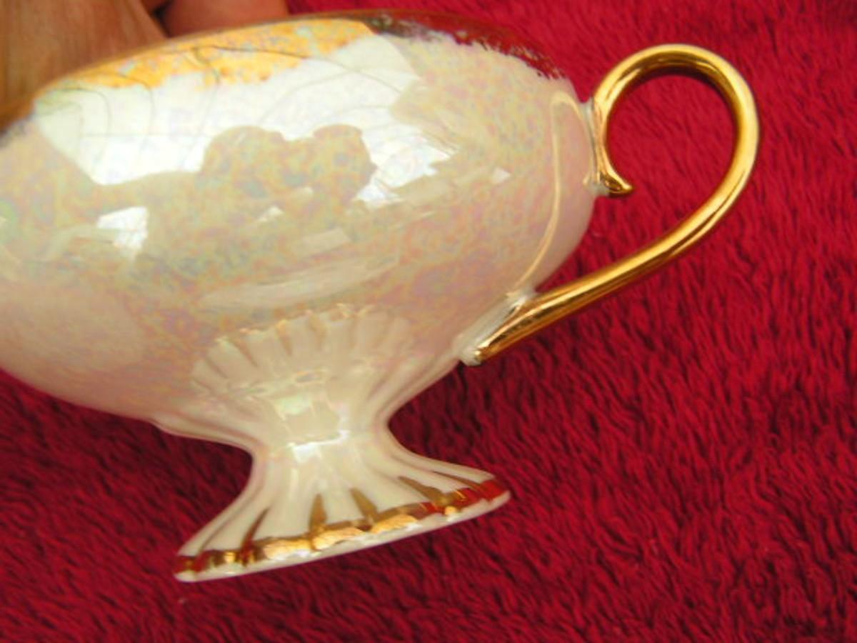 More tea sets like this elsewhere in this sale. Vintage Royal Halsey L M very fine bone china porcelain teacup & saucer set. Delicate elegant gold designs on unusual black fans and white background. Pearlescent finish over all. Made in Japan and imported by Lipper & Mann of New York, c.1940s-50s.