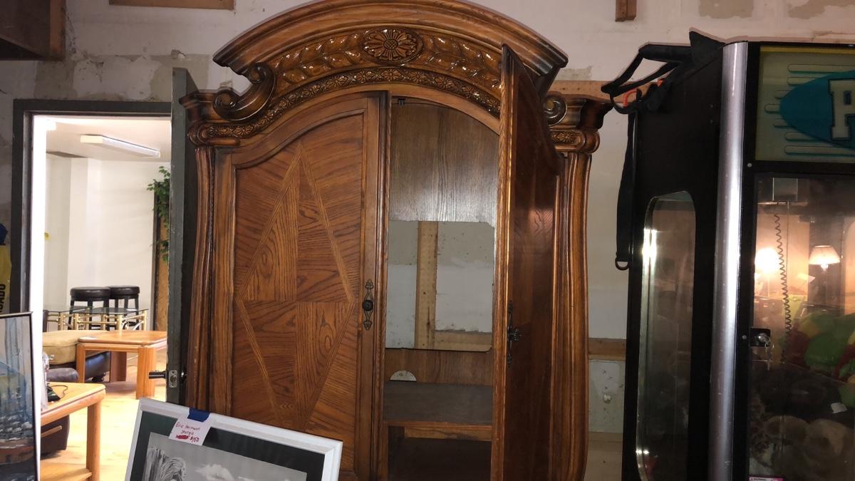 This is a heavy beautiful royal oak set. Set includes king bed, 2 nightstands and armoire/entertainment center