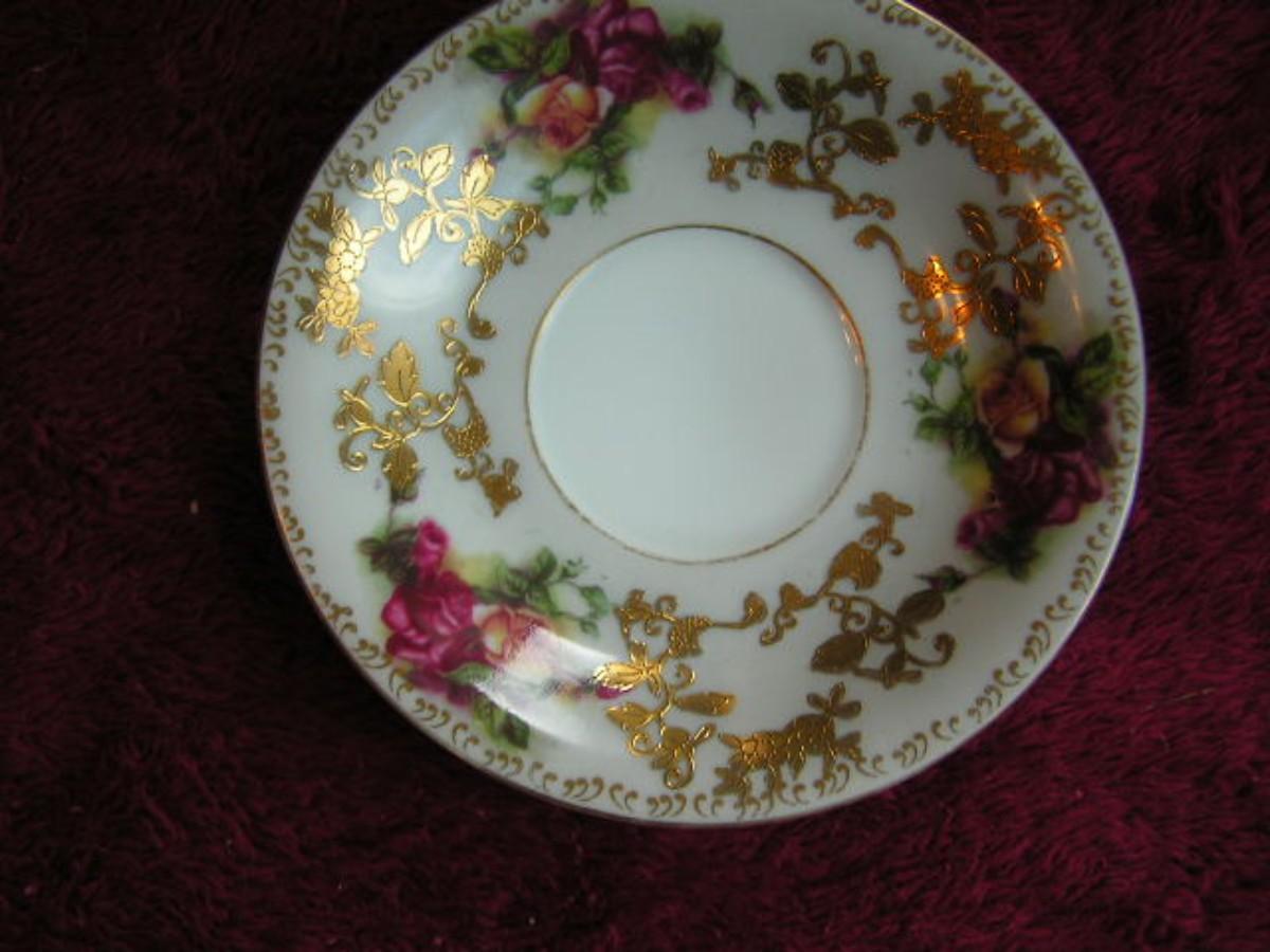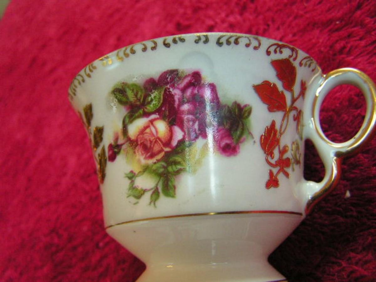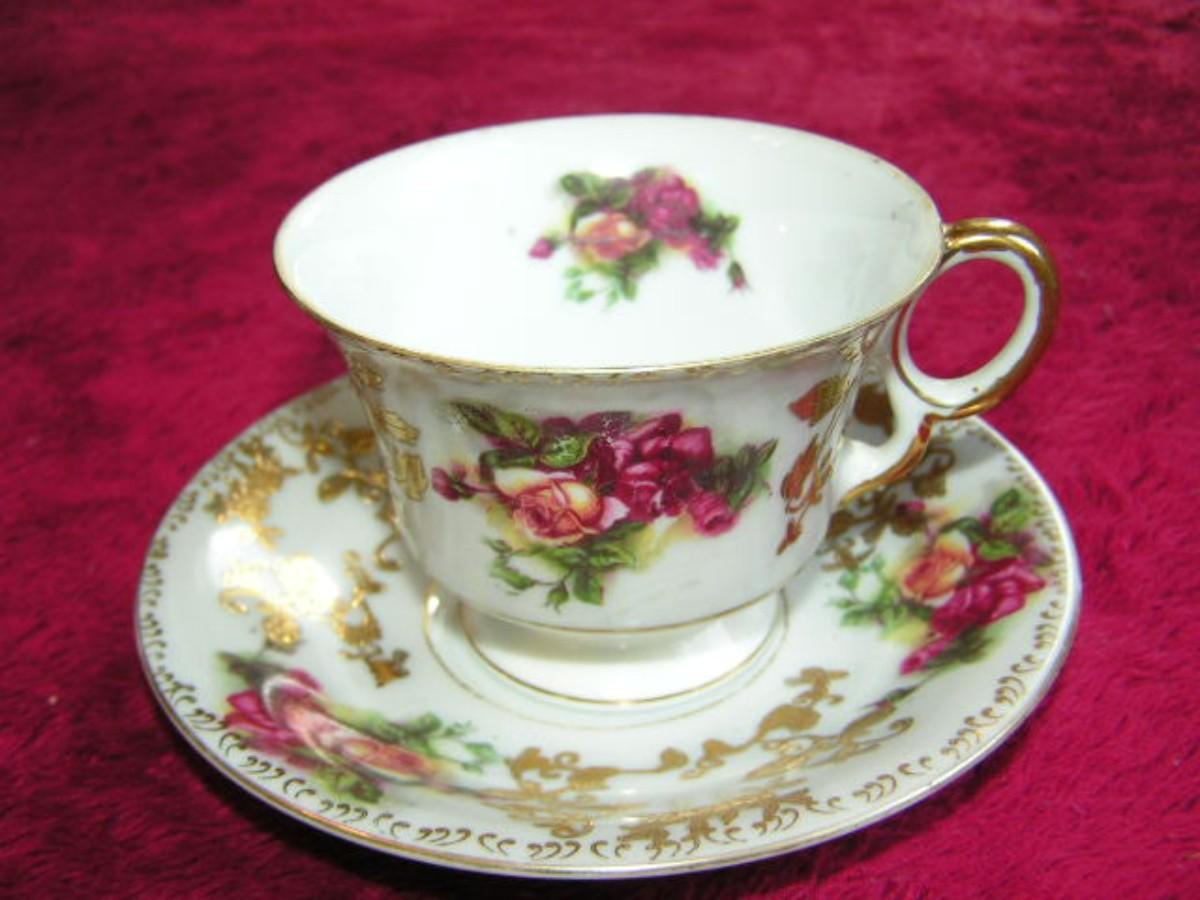 Vintage Royal Sealy China, Japan. Lusterware porcelain footed teacup w/saucer set. Roses and Gold. Intricate gold fauna w/pink roses. c.1940s-50s.