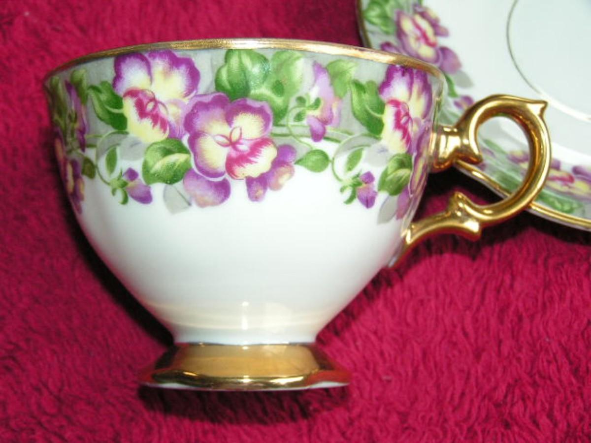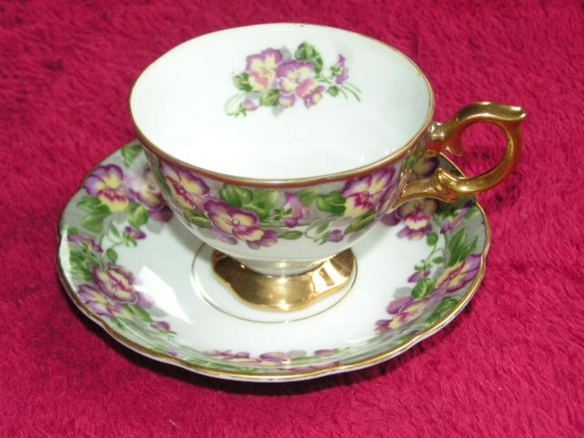 Vintage Royal Sealy China (Japan) footed teacup & saucer /w pansy design, gold trimmed