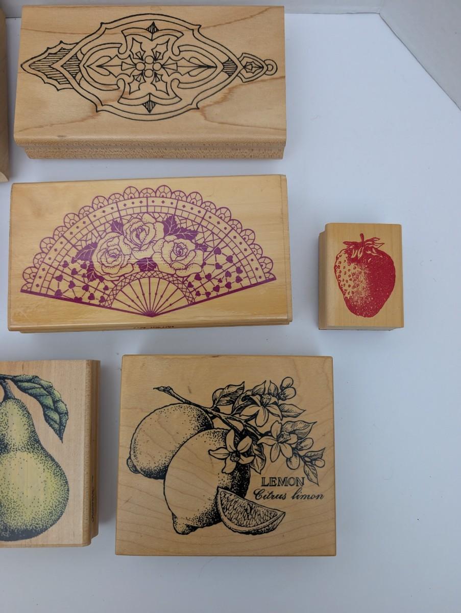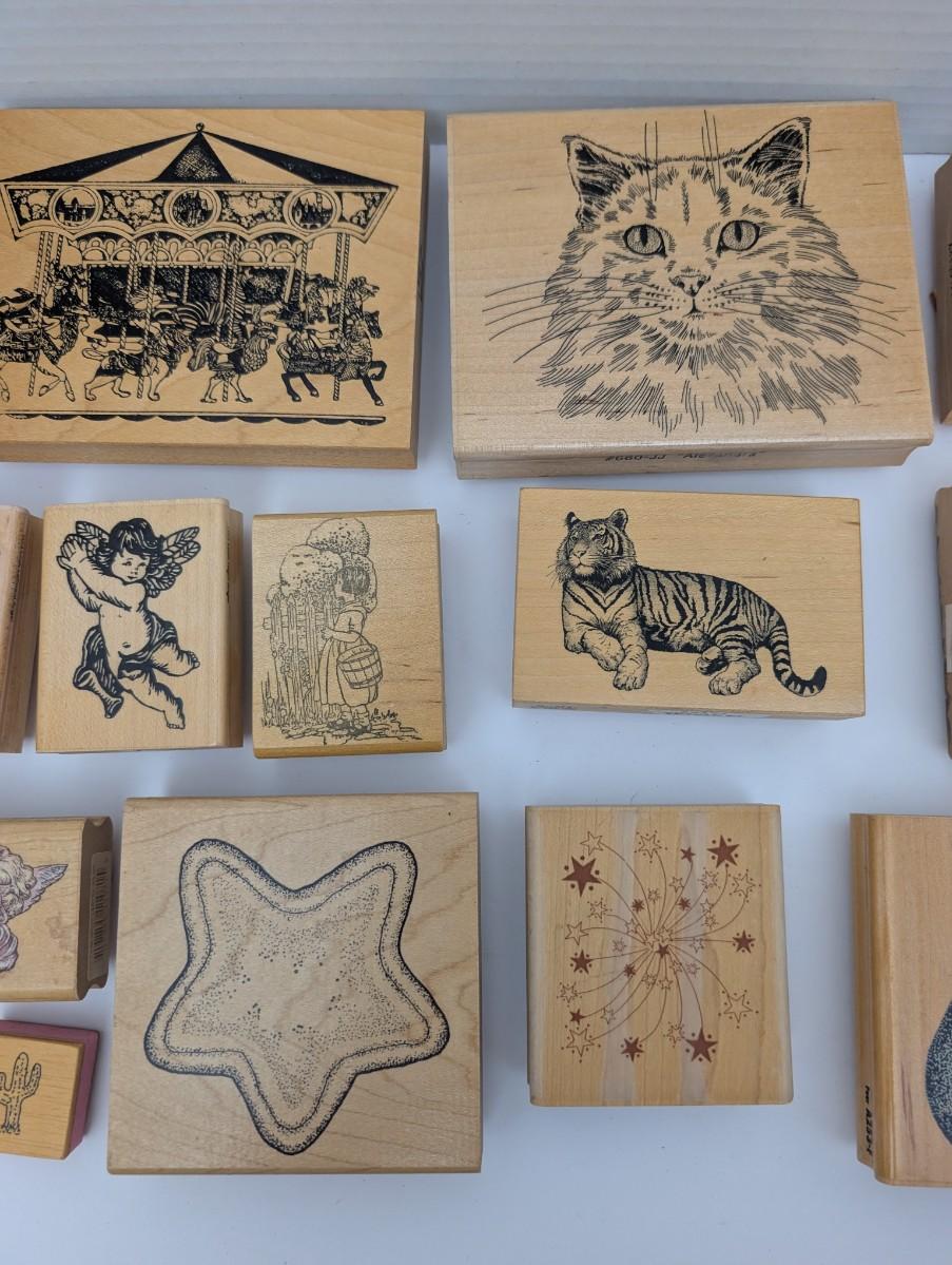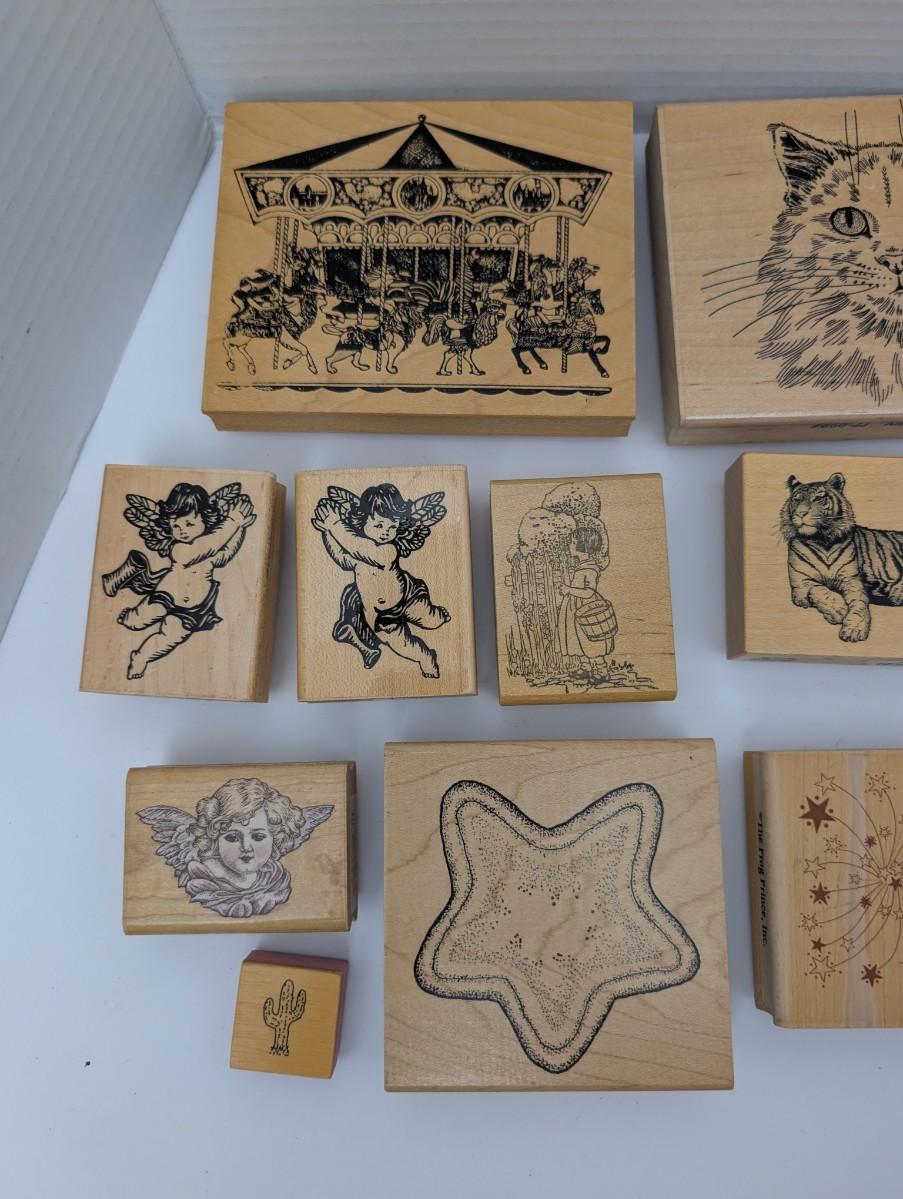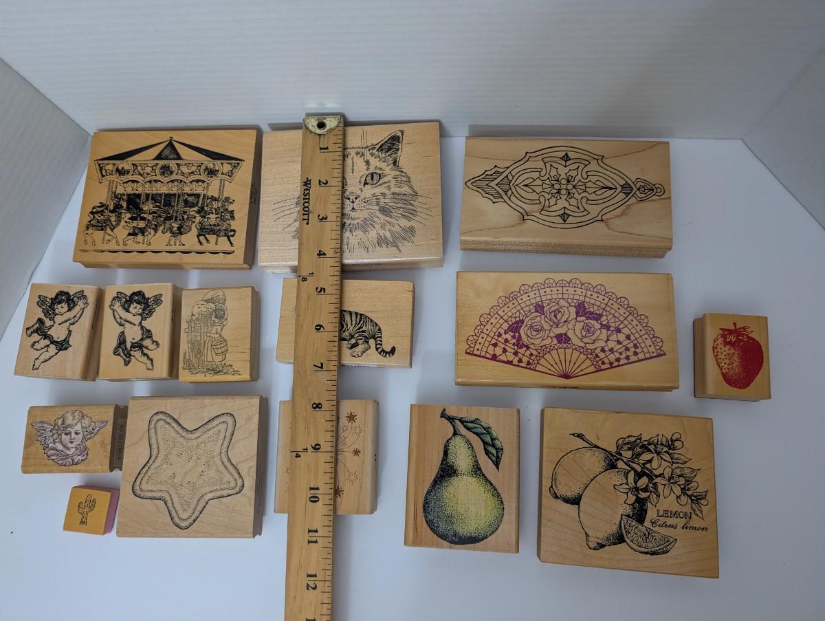 Assorted lot of vintage wooden rubber stamps with a variety of themes including a carousel, detailed cat portrait, ornate design, cherub angels, Victorian girl, tiger, lace fan with roses, strawberry, pear, lemon with blossoms, starfish, celestial design, and small cactus. Great for crafting, journaling, card making, and creative projects.