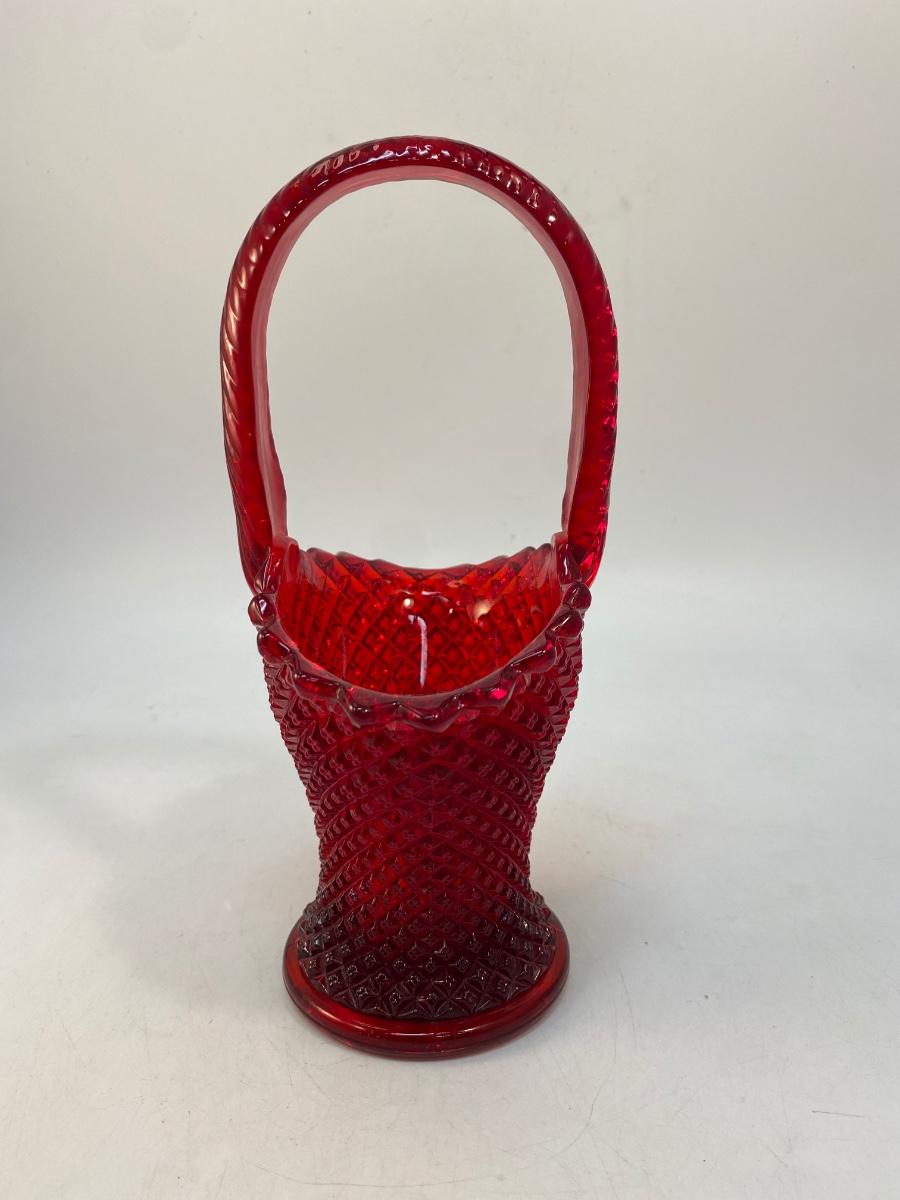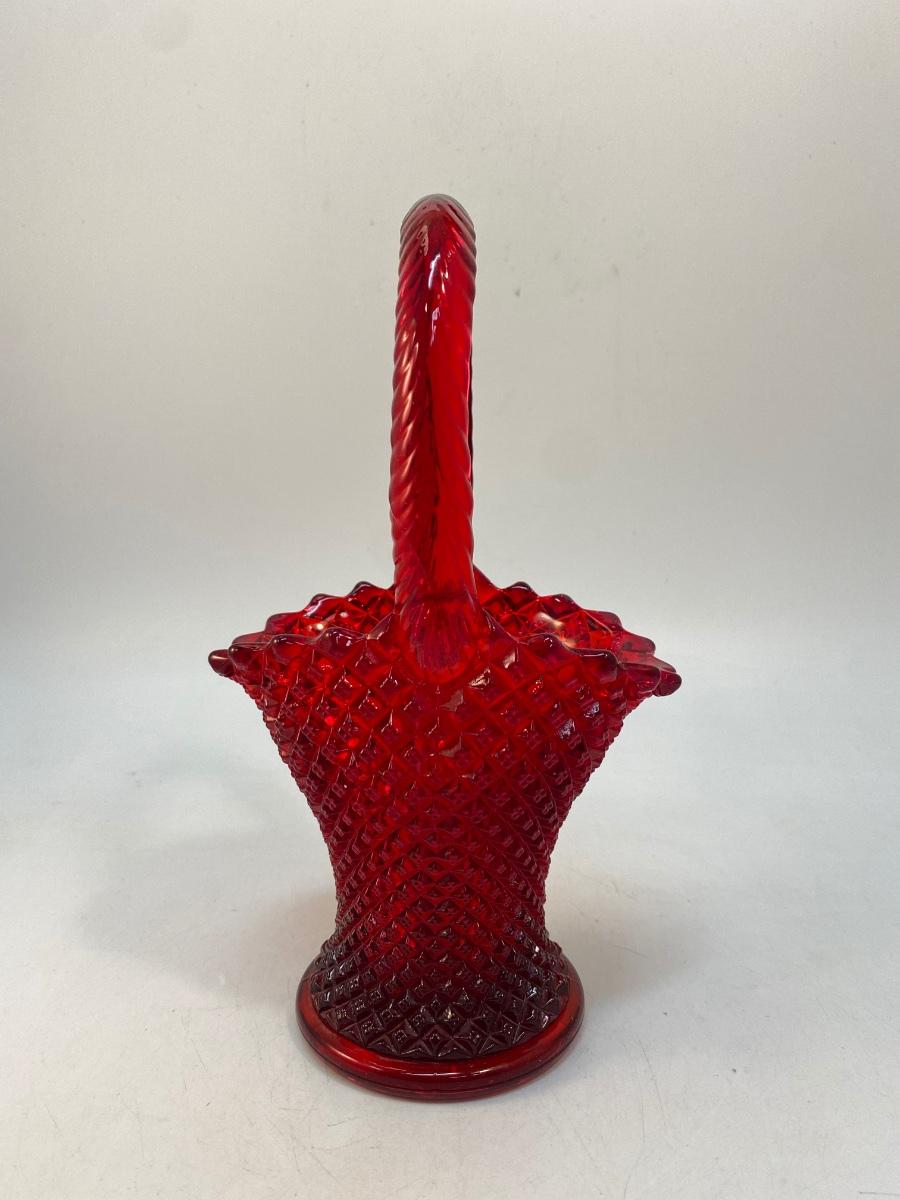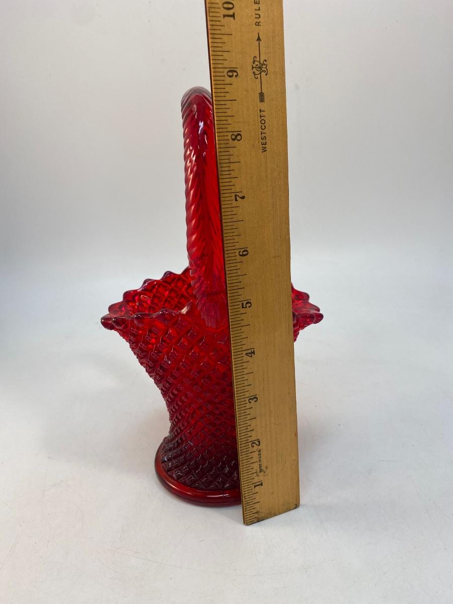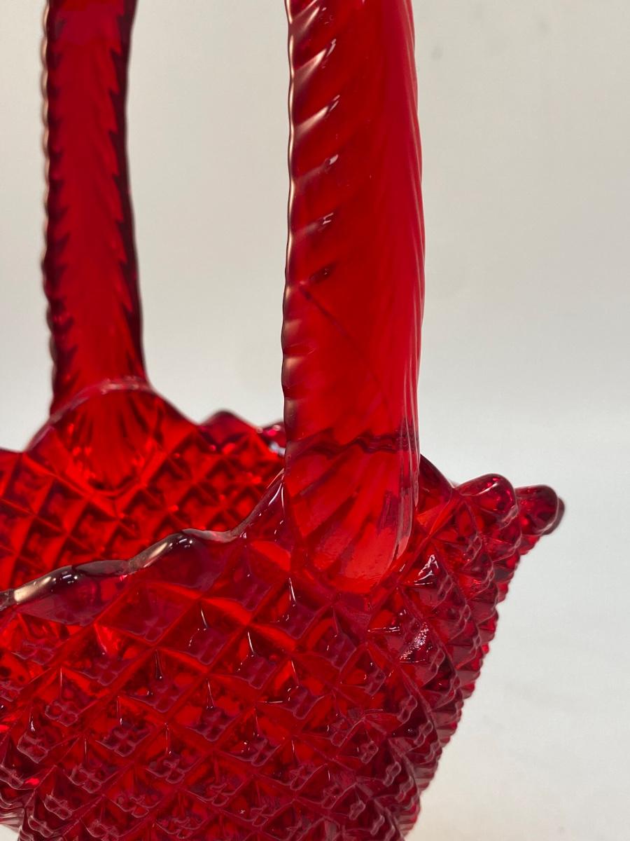 Vintage Ruby Red Westmoreland Glass English Hobnail Bridal Basket. Beautiful ruby red color. In good vintage condition. There is a flaw in handle that looks like a crack, but it is inside the glass, you cannot feel it. About 9" tall.