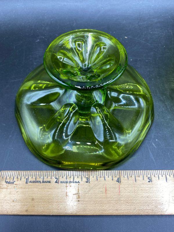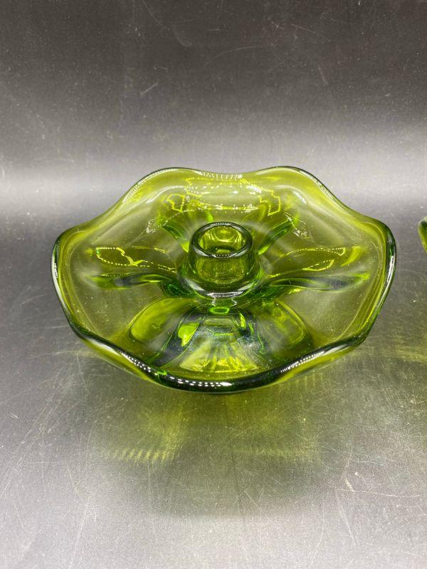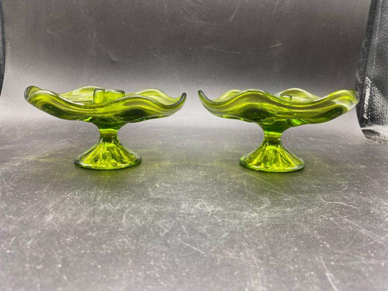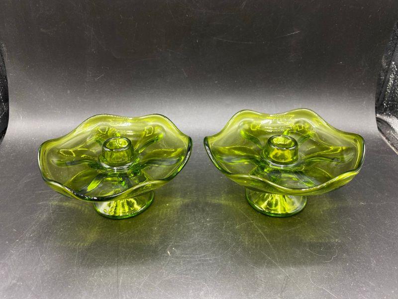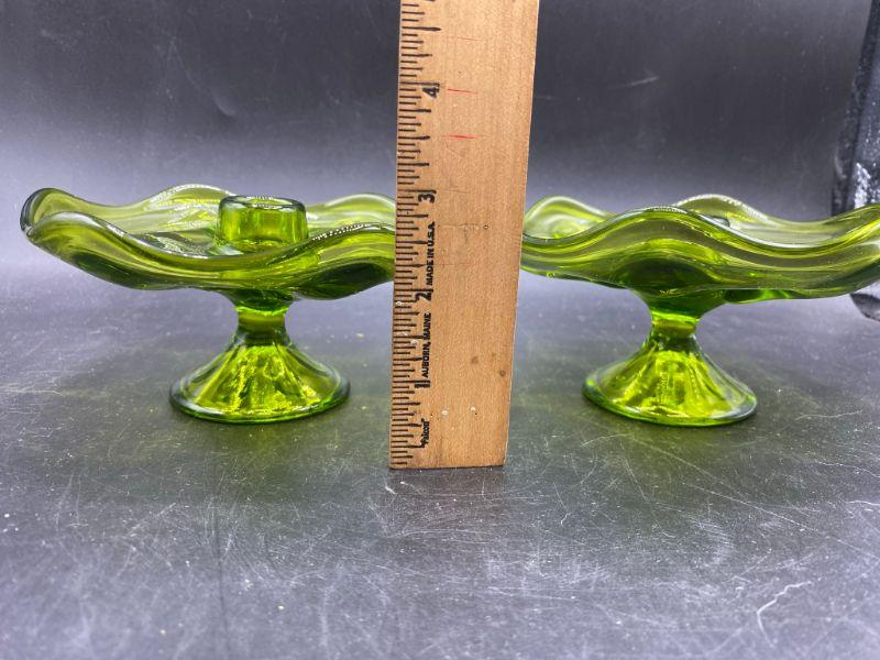 Pair of green glass candlestick holders. Ruffled edge. Bright emerald green glass. About 5" wide and 3" tall.