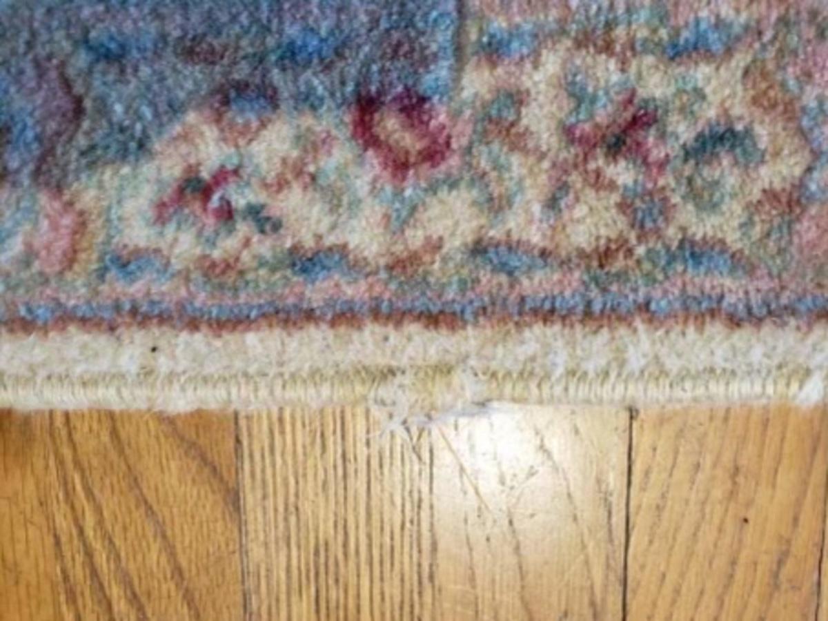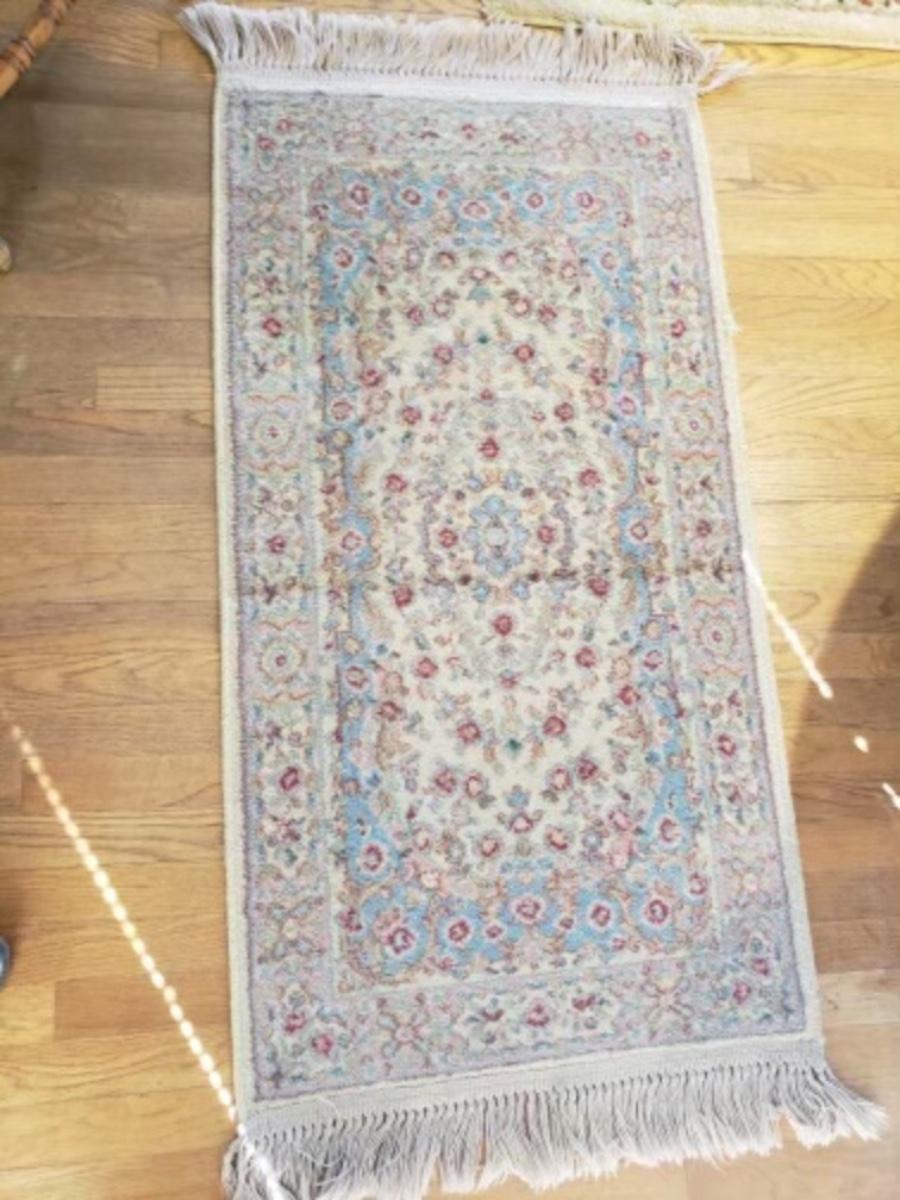 Vintage rug. Blue, red, and taupe colors. Some fraying on one side. 50"L x 26"W.