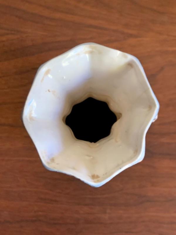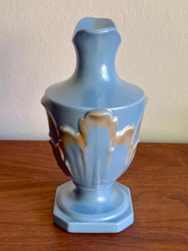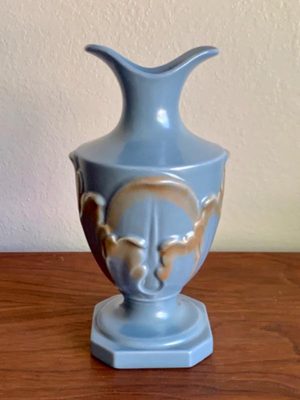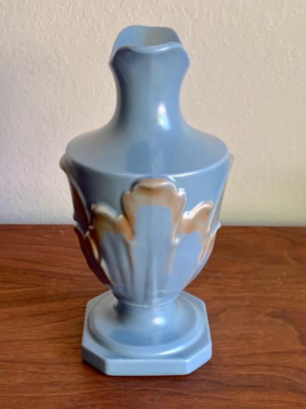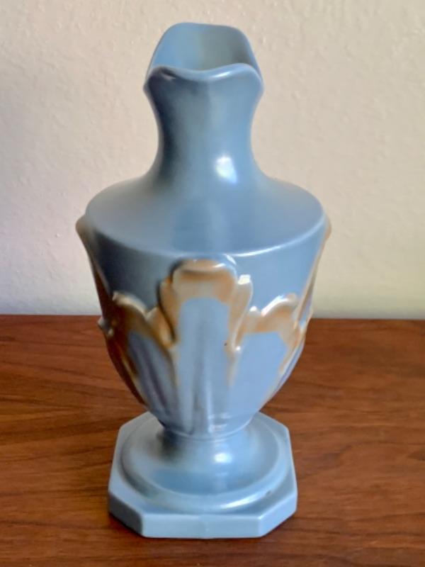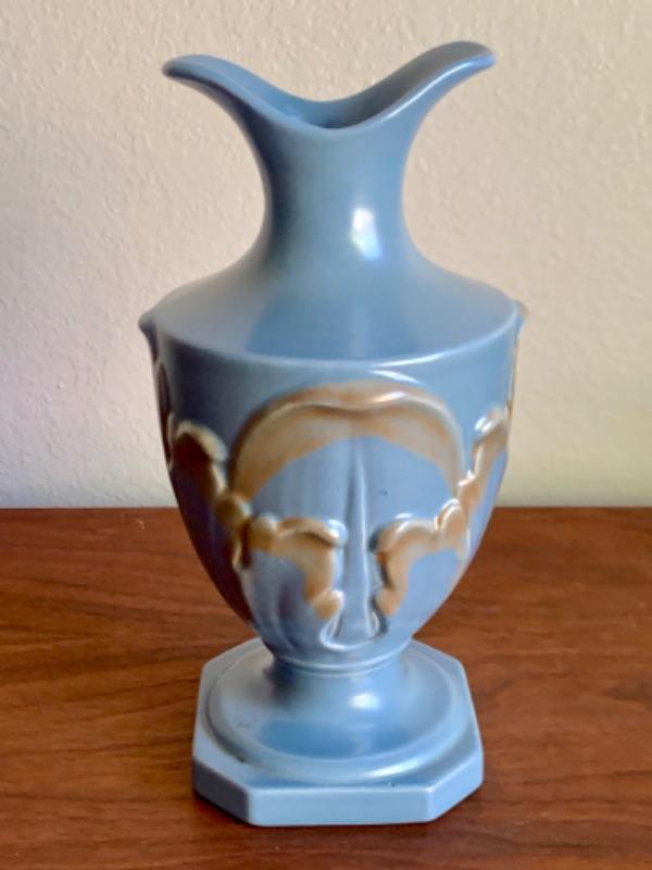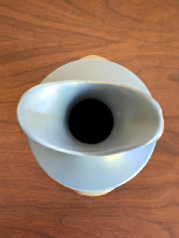 Blue Rum Rill double spout pitcher /vase with gold accents. Stamped 449. No chips, cracks or repairs noted. 9 1/4.”