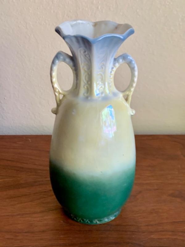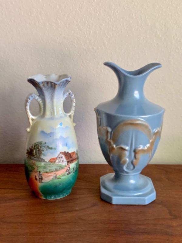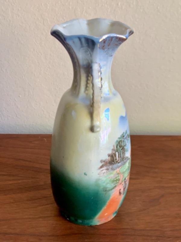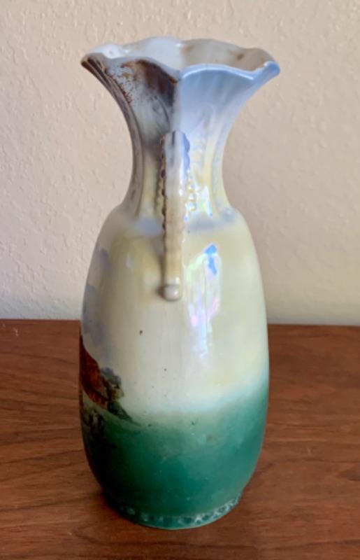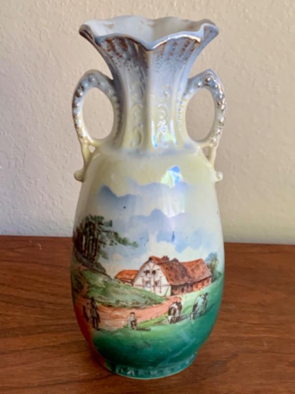 Double handled vase with hand painted farm scene. Unknown maker. Some light crazing, 8.”