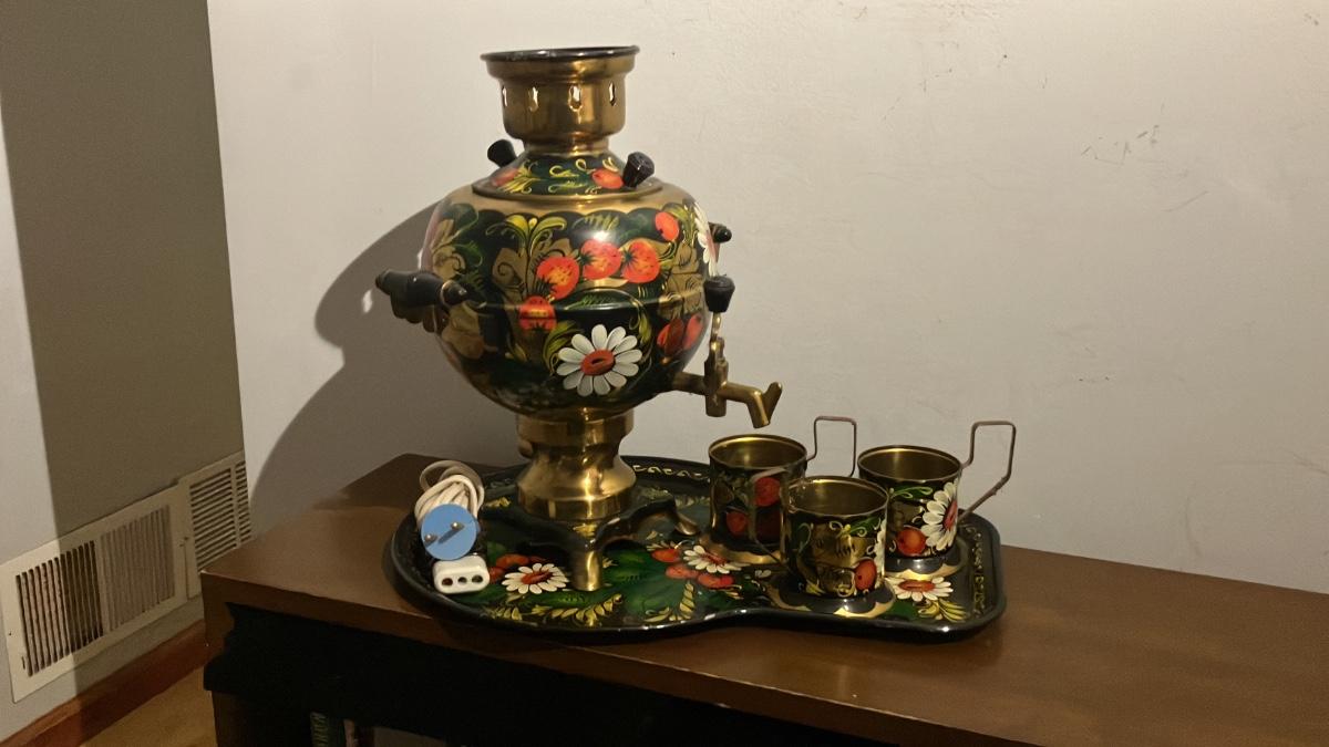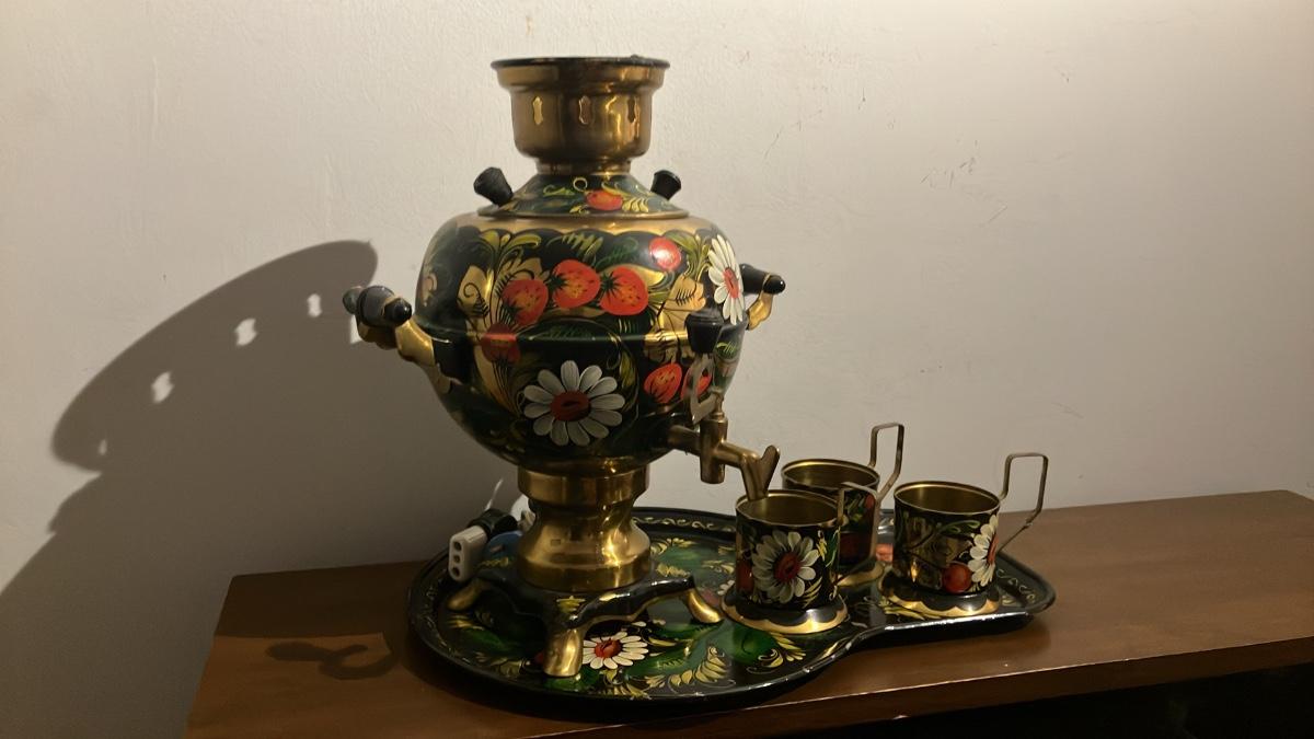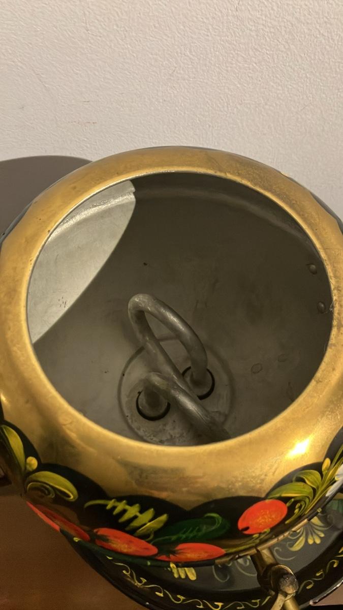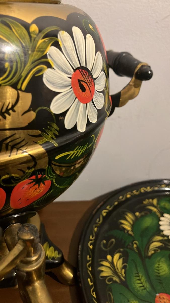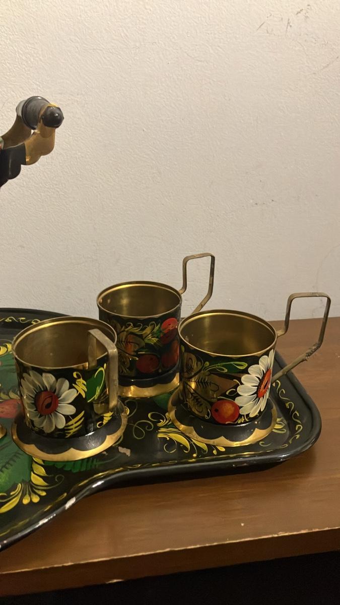 - Includes the samovar (14" high overall), matching painted tray (16" long x 12" wide), and 3–4 gold-handled brass cups