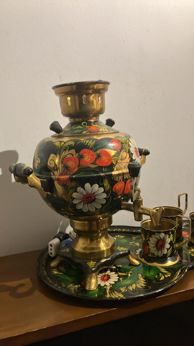 Beautiful vintage Russian (Soviet-era) electric samovar set, perfect for tea lovers, collectors of Russian folk art, or unique kitchen decor!