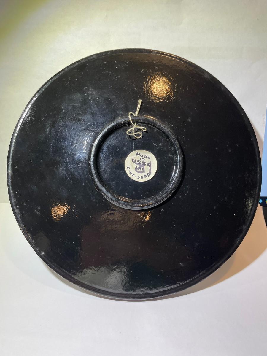 Vintage RUSSIAN Hand Painted Lacquered Wooden Plate Artwork 8.5" Diameter in Good Preowned Condition.