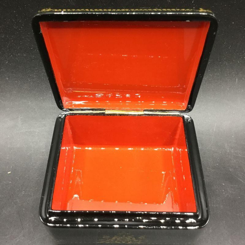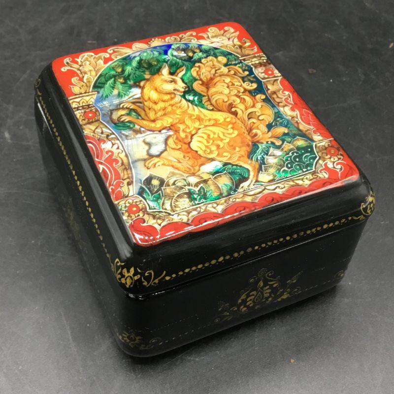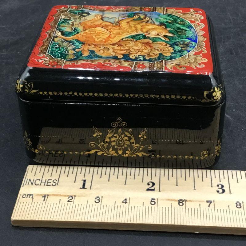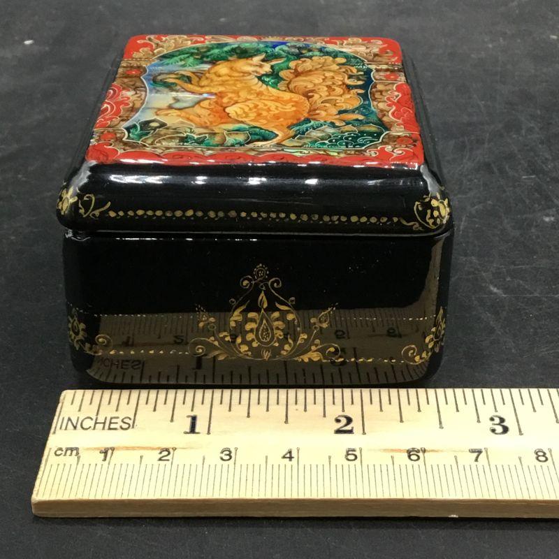 Vintage trinket box. Believe to be Russian. High gloss enamel painting of a squirrel on the lid. Measures about 2.5"x3" size. Some wear to the gold paint details. Bright red inside. Hinged lid.