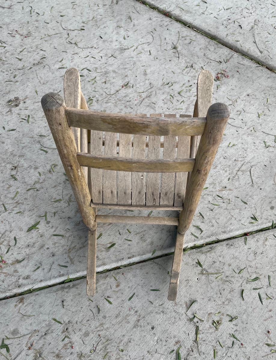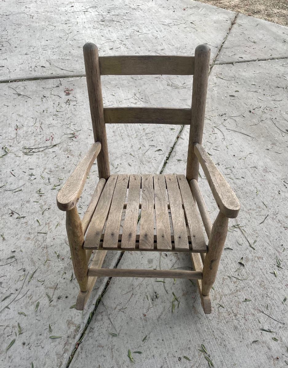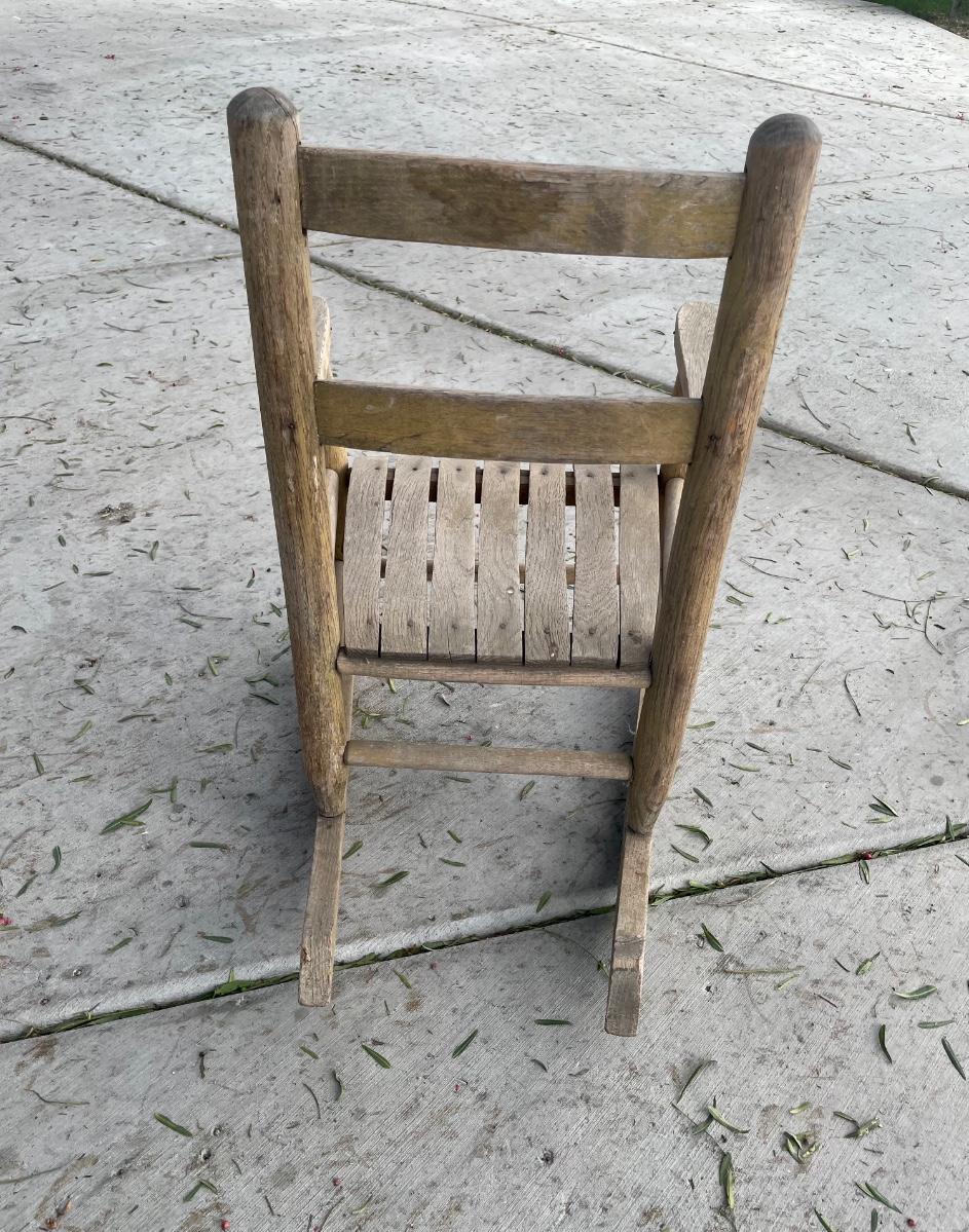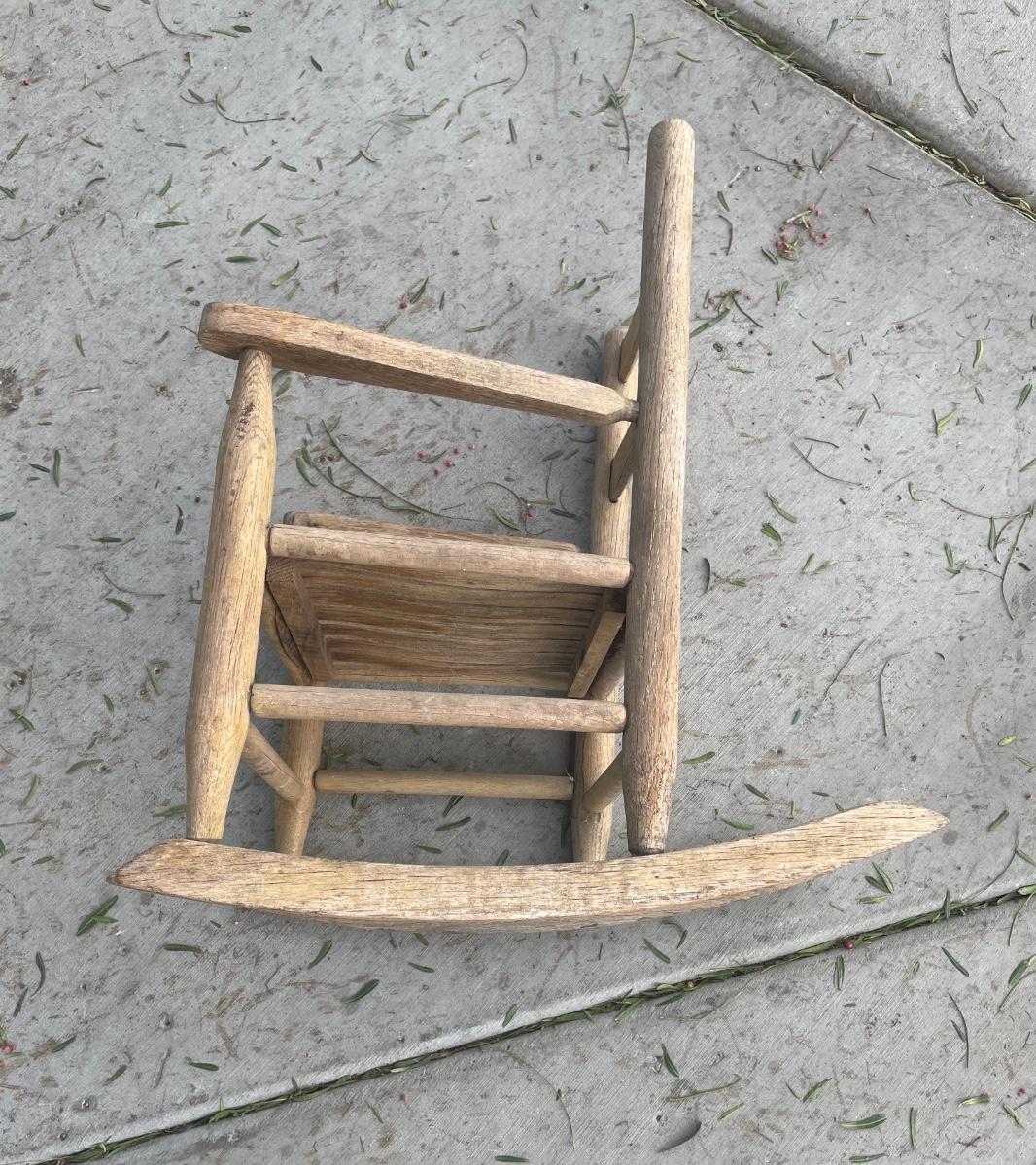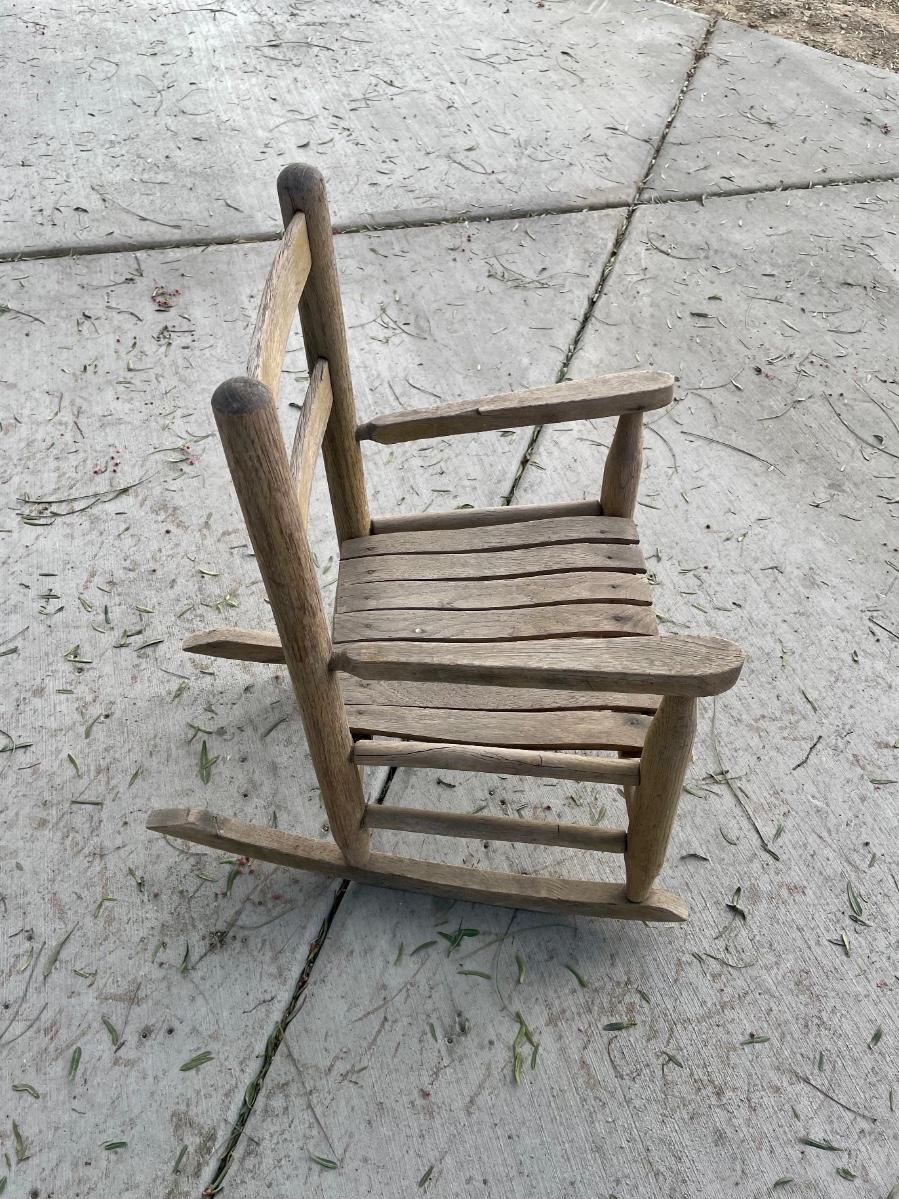 Wood child’s rocking chair. Wood appears weathered from sitting outside. Approx. 24” tall. WILL BRING TO WAREHOUSE IF ONLY ITEM ON INVOICE FROM LOCATION. WILL SCHEDULE PICK UP AFTER JULY 4TH.