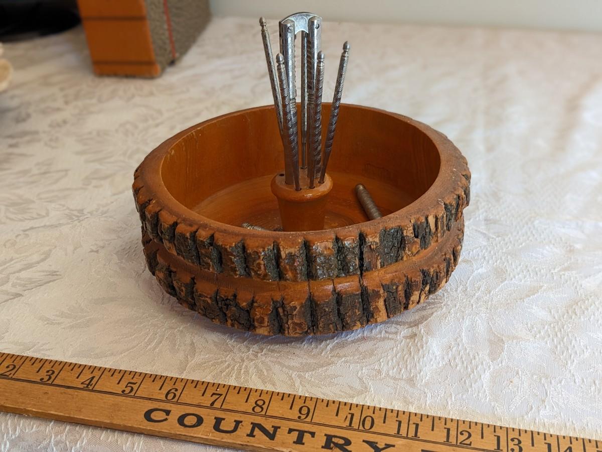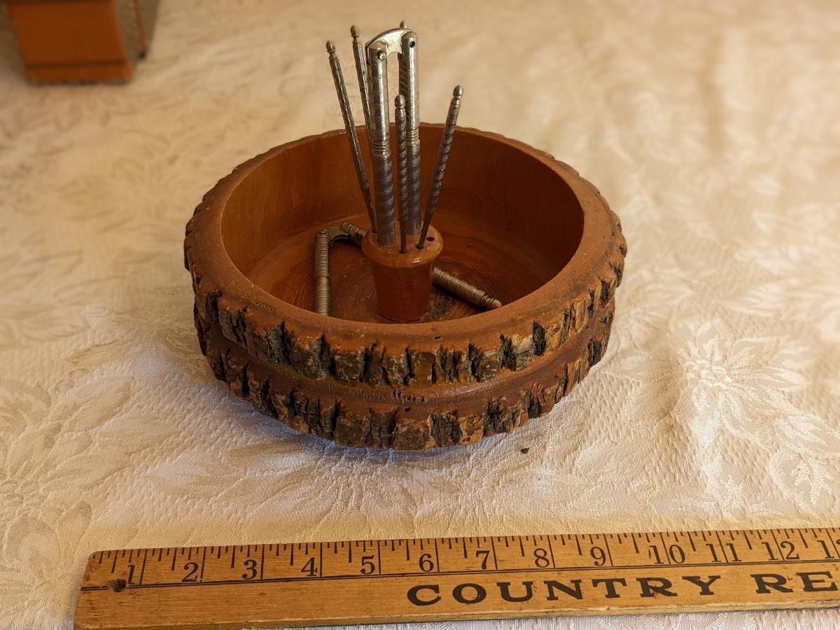 Vintage Rustic Ellwood Genuine Pine Round Nut Cracker Bowl + Tools