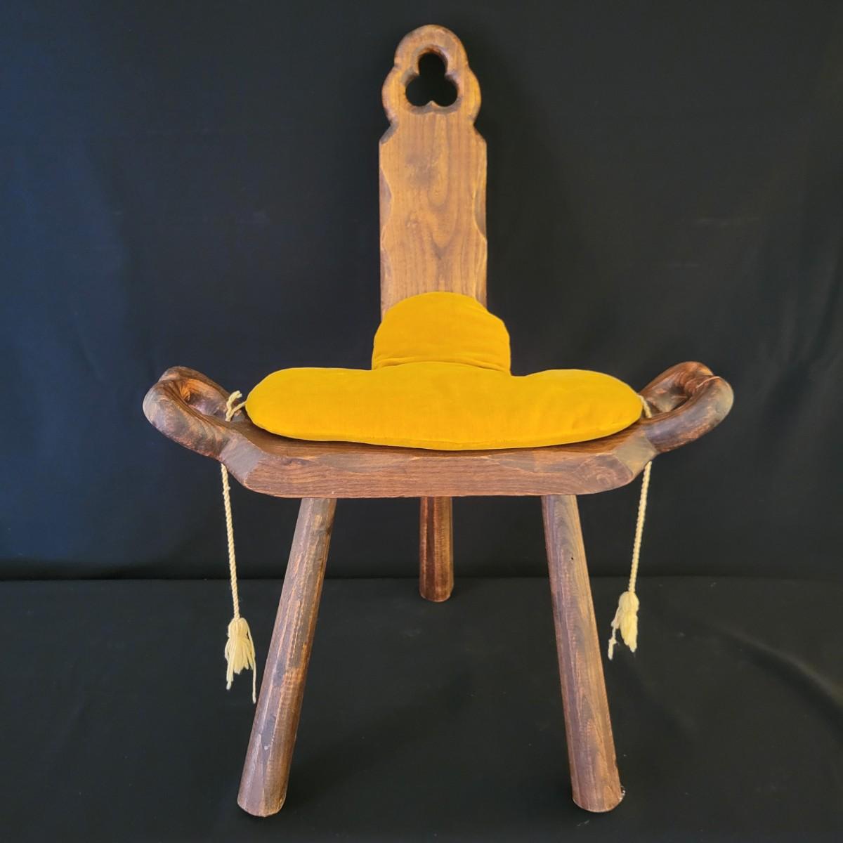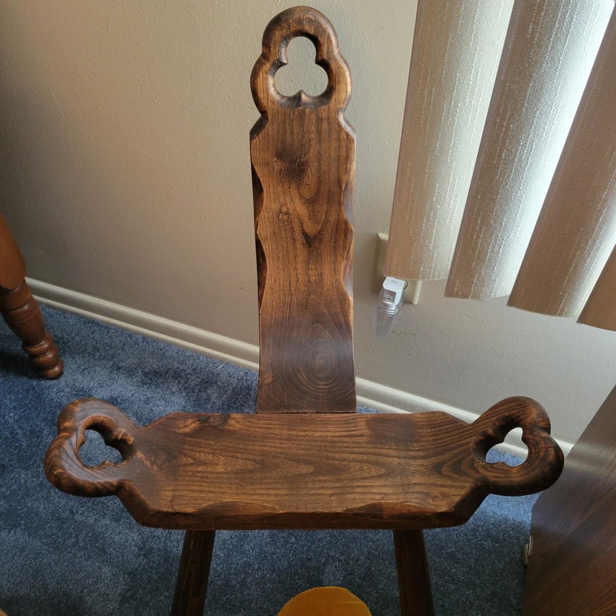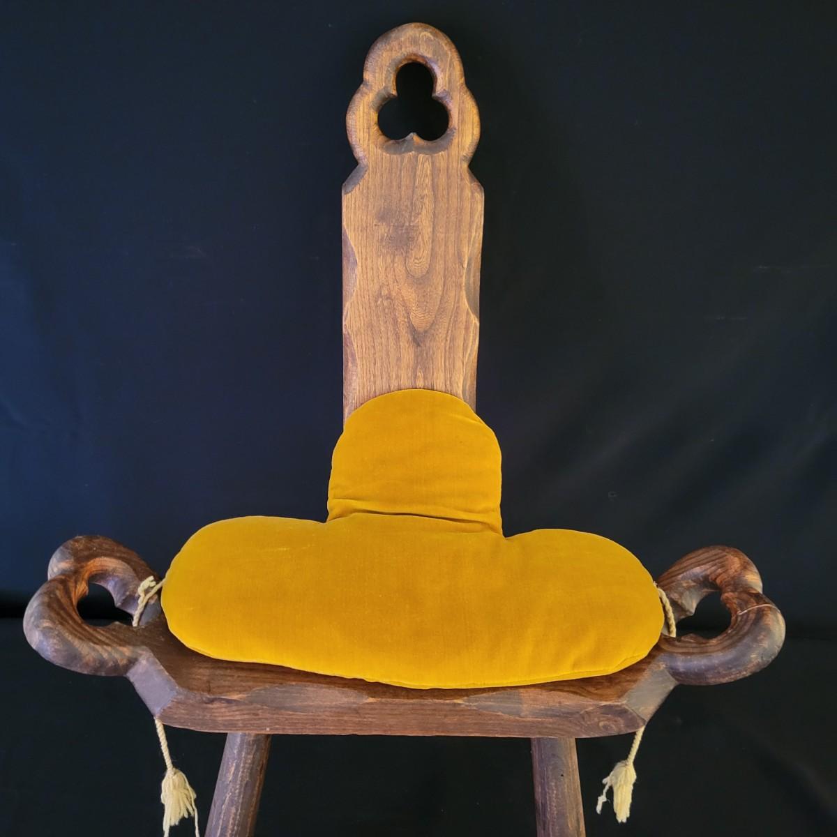 An interesting antique birthing stool in a carved oak with a golden velvet cushion. It measures approximately 20" x 15" x 27"H with a seat height of 15.5". Shipping available. Shipping can be costly. We suggest contacting our preferred local shipping provider, Postage Express, with dimensions and getting an estimate before bidding: (828) 670-5501 or postageexpress@yahoo.com.
