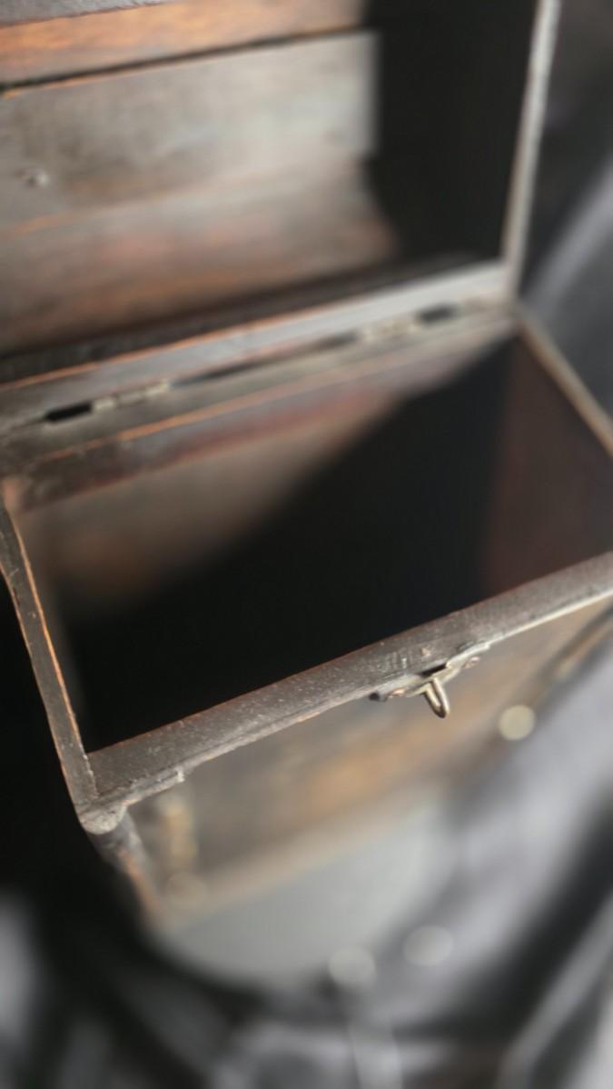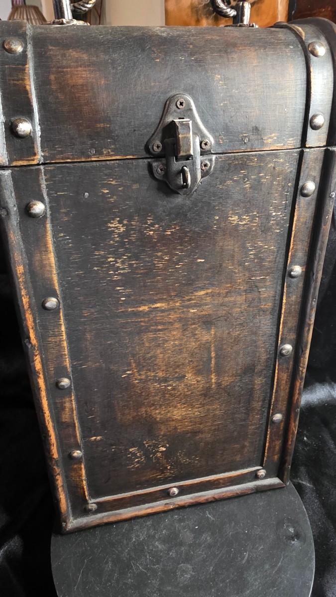 The front clasp, simple yet purposeful, invites the imagination to wonder what might have been tucked inside long ago — letters, keepsakes, a special bottle meant for a milestone moment. Opening the hinged top reveals a spacious interior, perfect for storing decor, gifting a vintage-style presentation, or simply standing as a statement piece that draws the eye with its richly distressed charm.