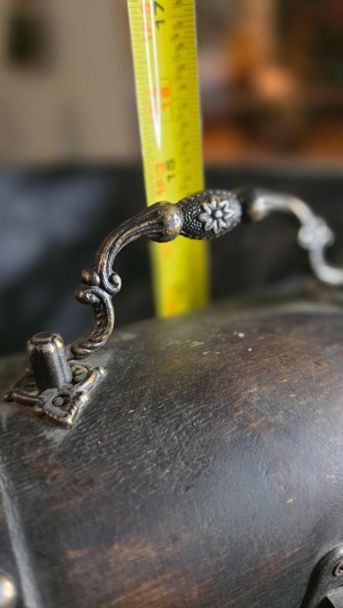 There’s a quiet mystery to a piece like this — the kind of object that looks as though it has traveled across decades, collecting stories along the way. This tall, narrow wooden trunk carries the warm, timeworn patina of something once cherished, its surface marked with the golden brushstrokes of age and the softened texture of old-world craftsmanship. The domed lid and riveted metal banding evoke the spirit of a classic treasure chest, while the ornate cast-metal handle adds a flourish of antique elegance, each detail blooming with character.