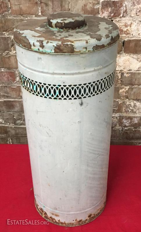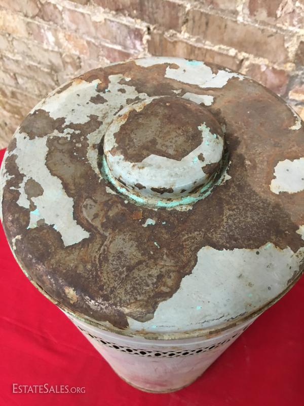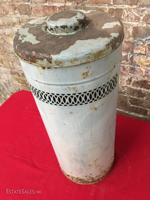 Old garbage can i think? blue chippy paint w/lid 21" tall 9" across.