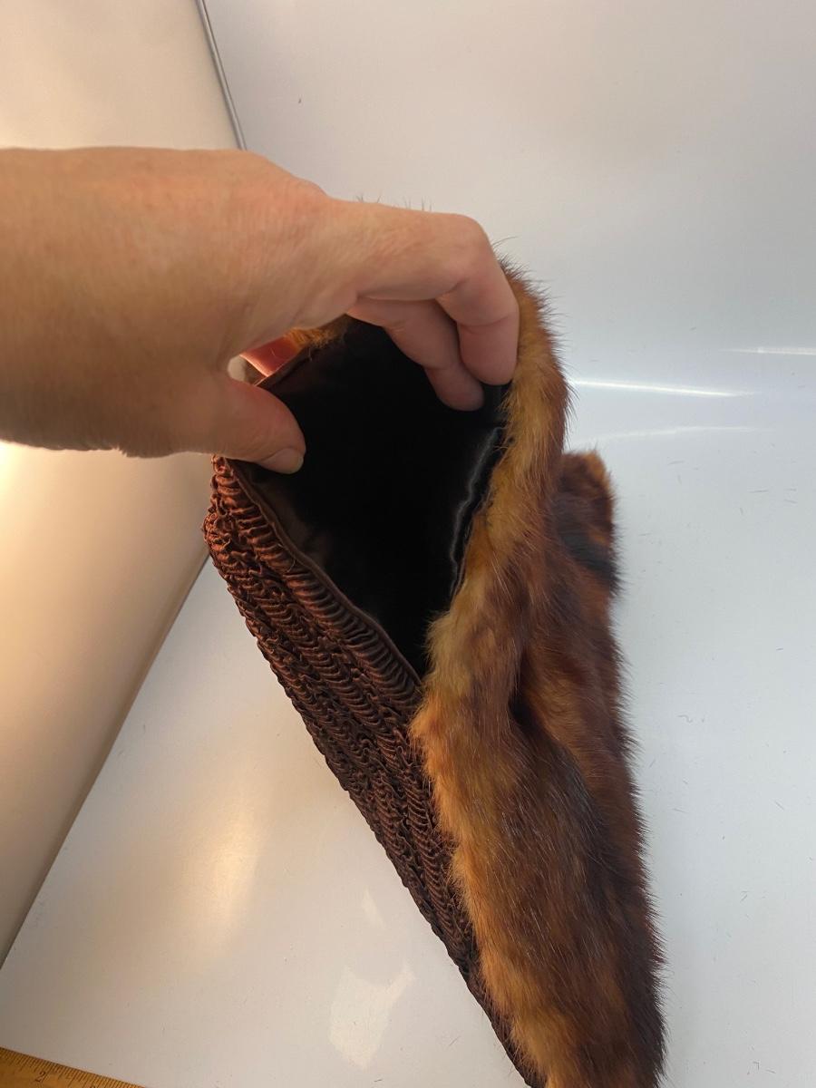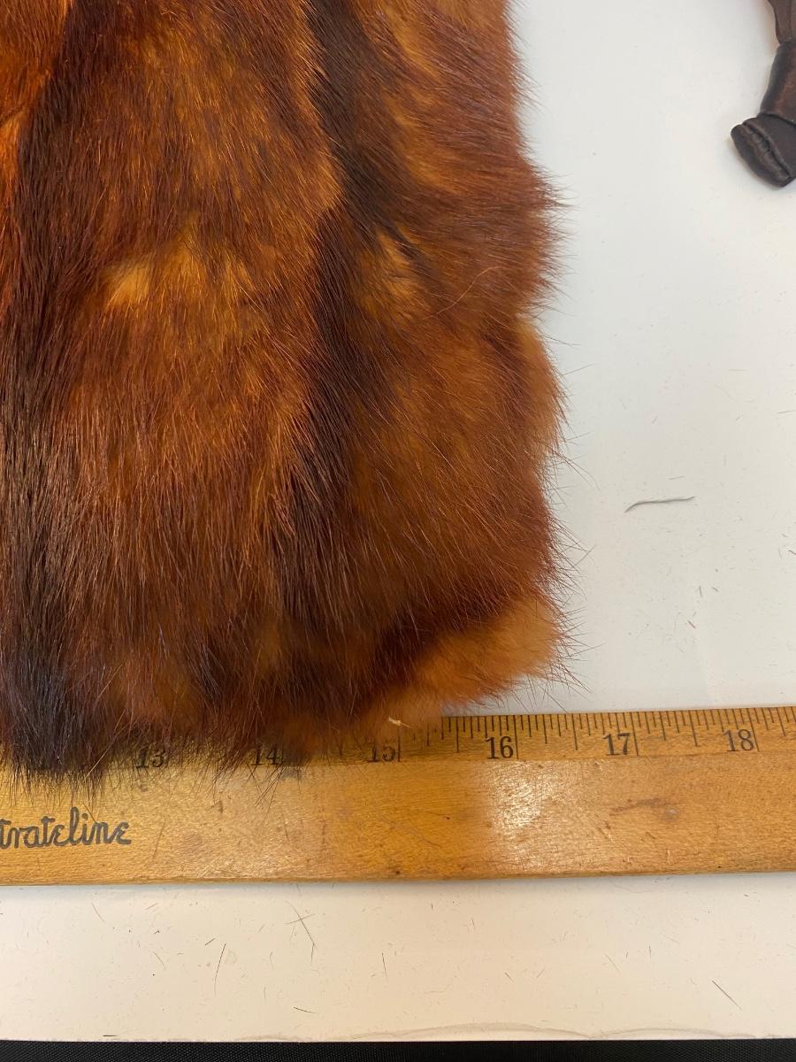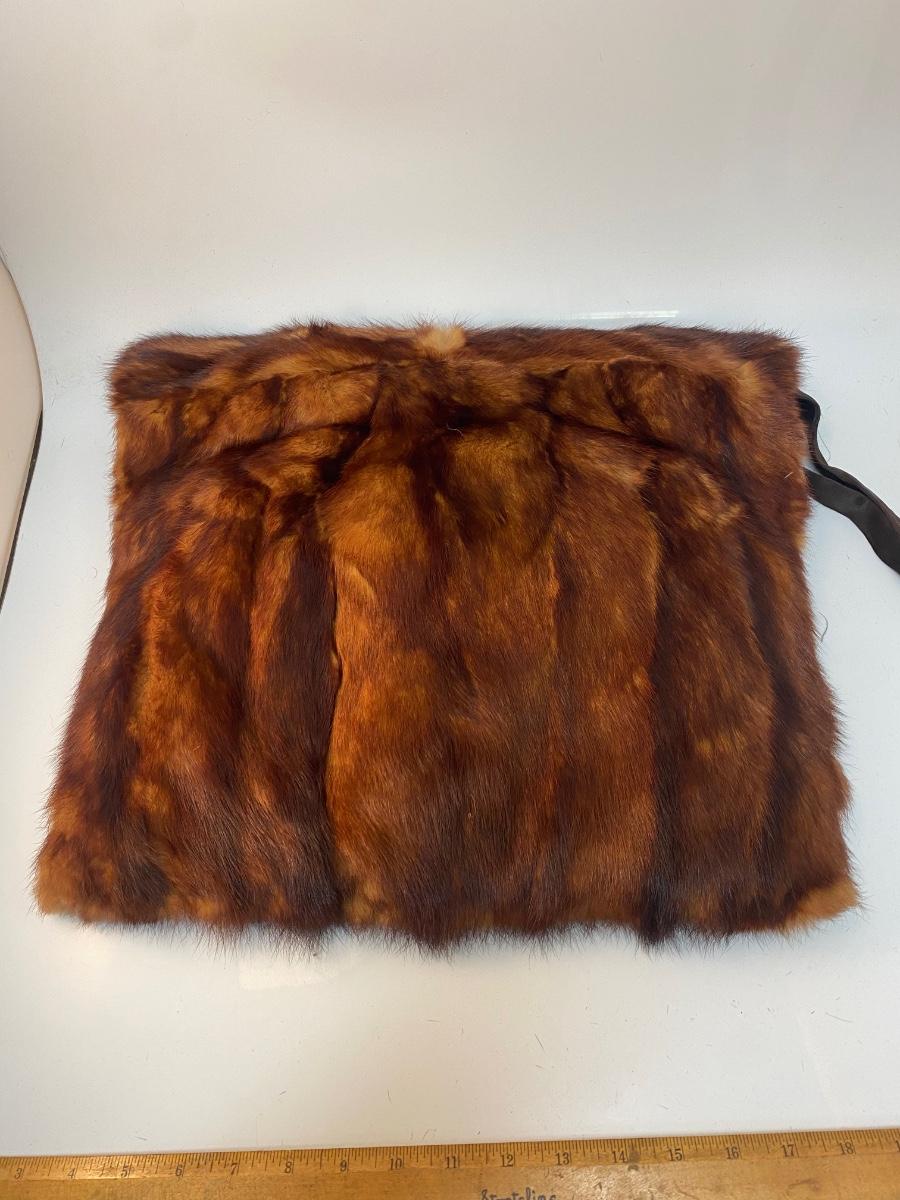 Vintage Rusty Red Brown Mink Fur Hand Warmer Muff. Genuine fur in good condition. Zipper pocket on the back side, but zipper is stuck. About 16" size.
