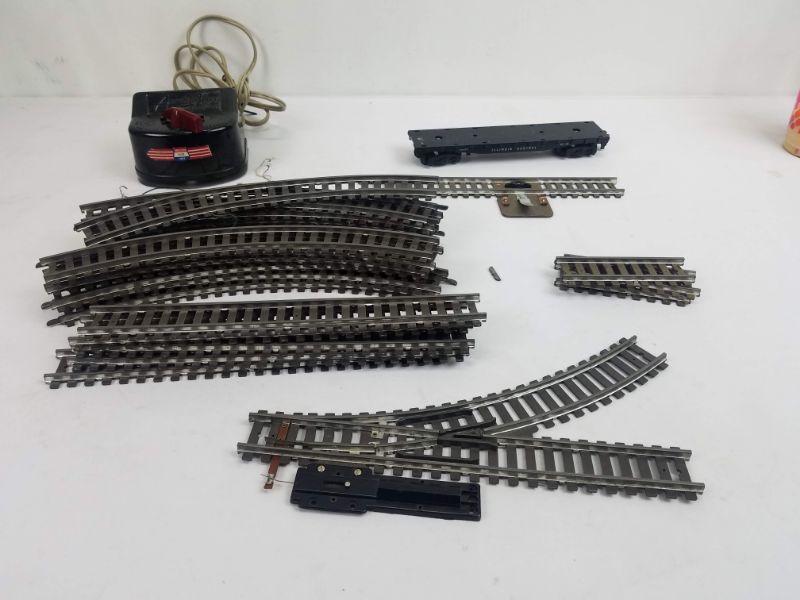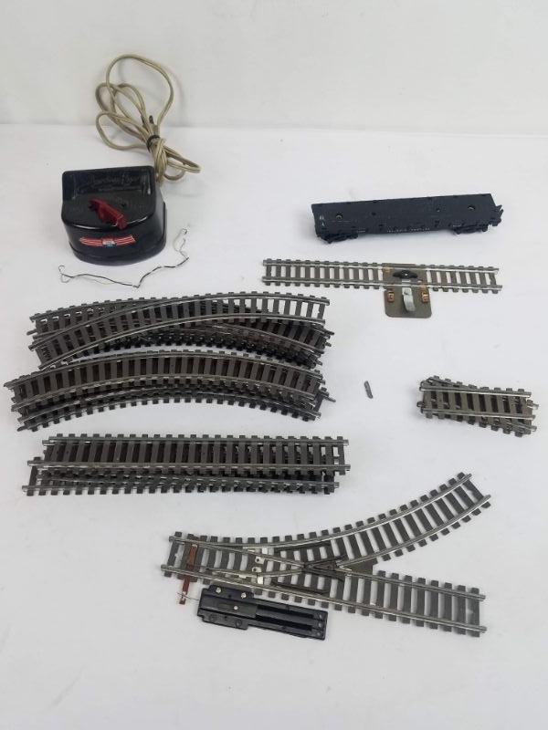 Vintage S Scale Train Rail. 13 Curves, 5 long, 3 Short, 1 Long with power connector, 1 switch, 1 Transformer, Connector Pieces & Other Misc