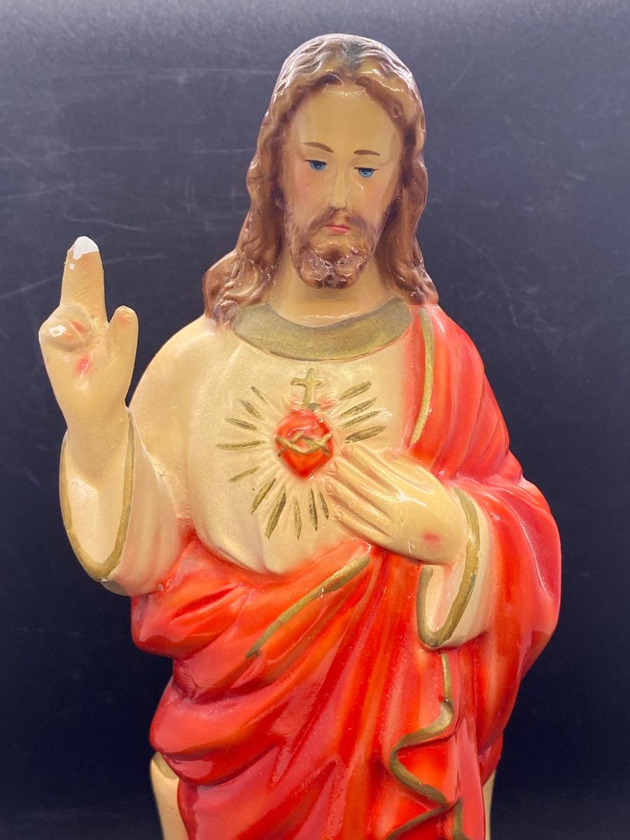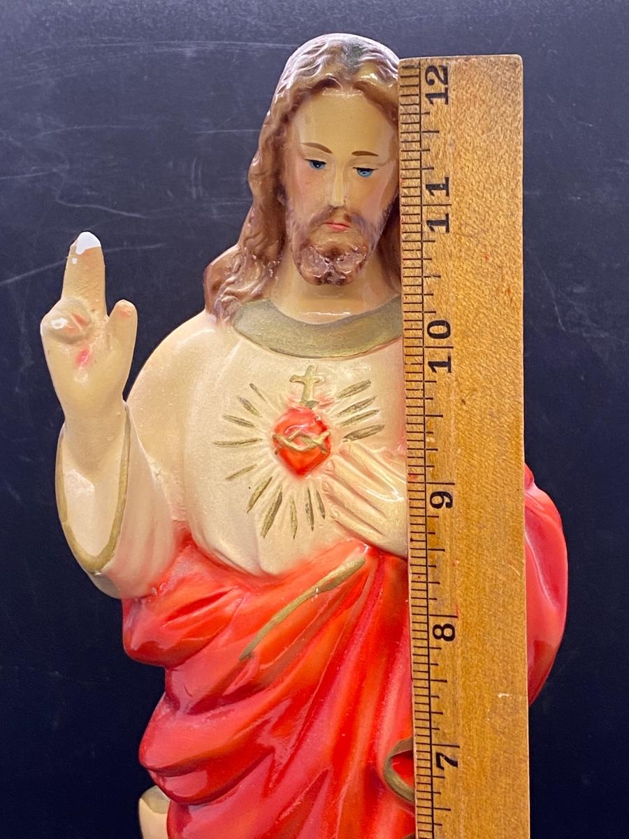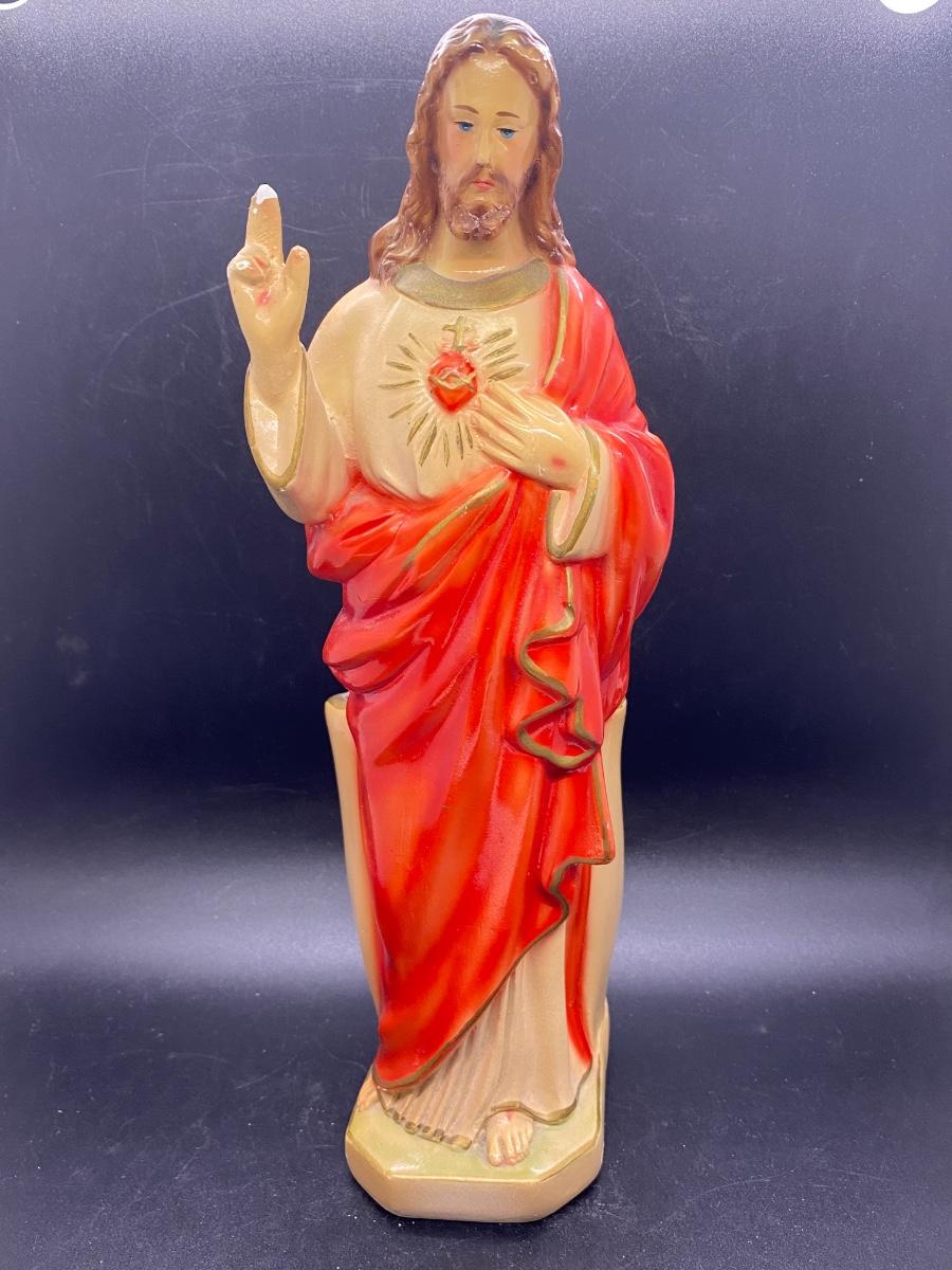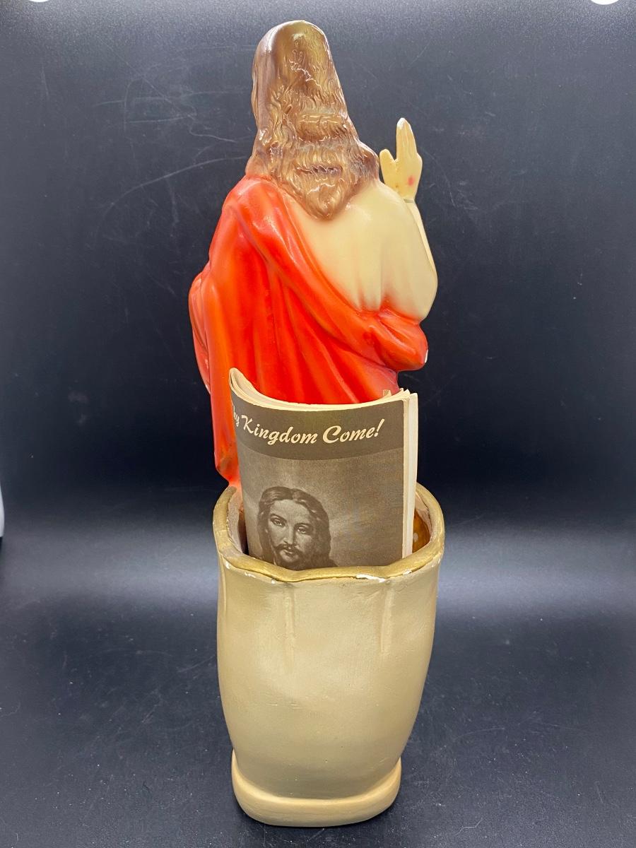 Vintage Sacred Heart of Jesus ceramic planter figurine. About 12" tall. There are a few minor chips in paint. Has a vintage religious booklet included.