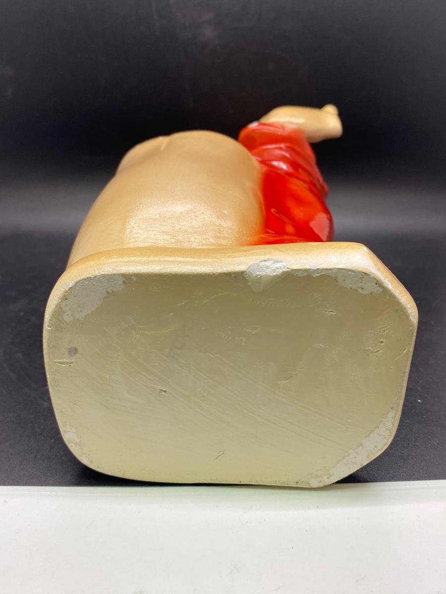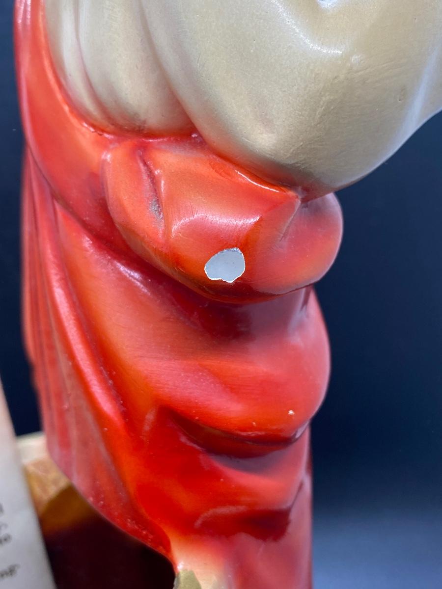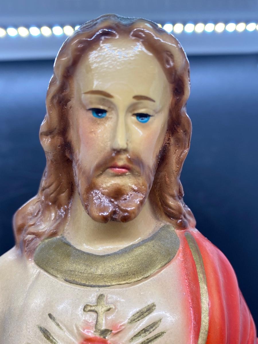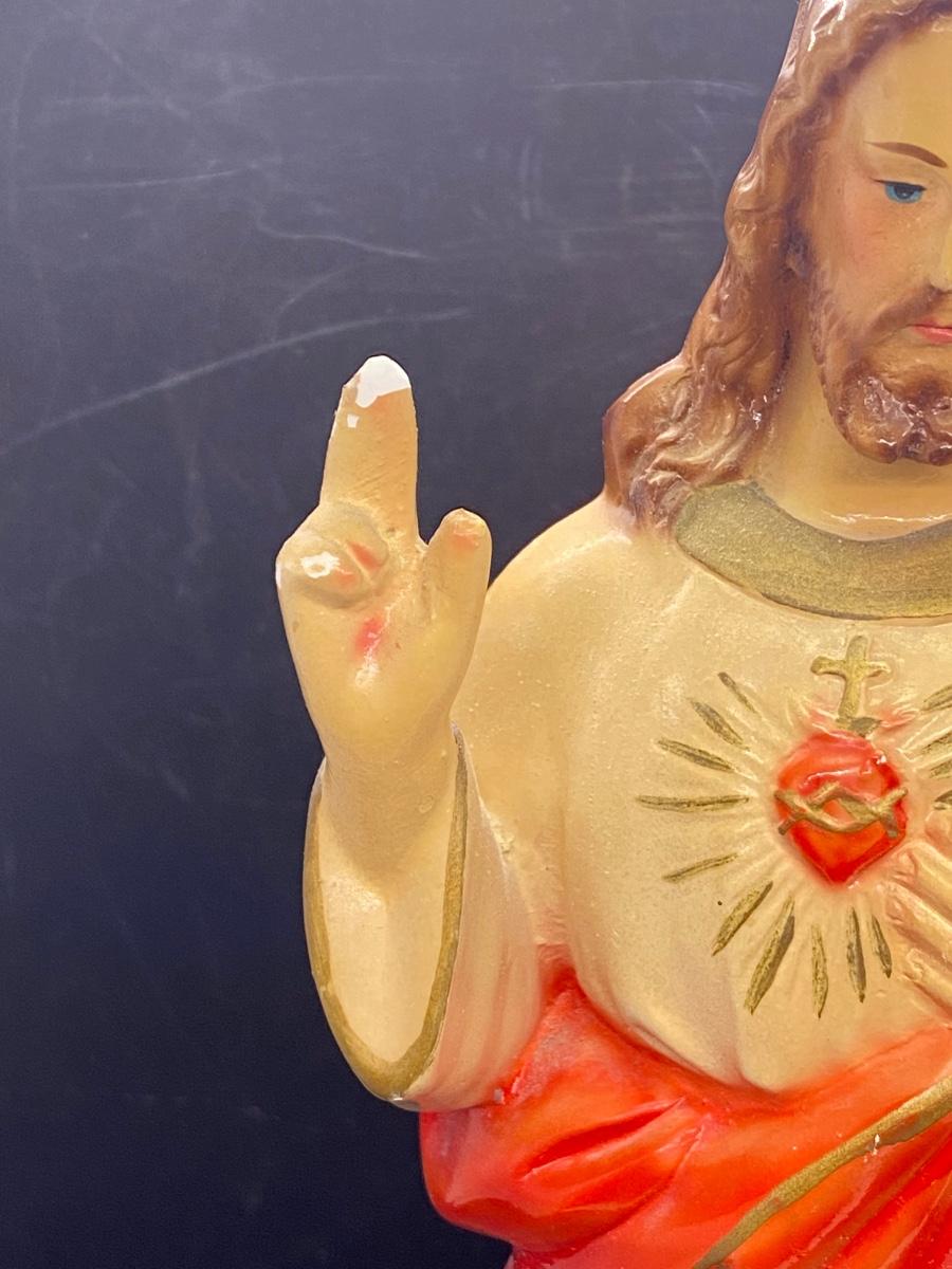 Vintage Sacred Heart of Jesus ceramic planter figurine. About 12" tall. There are a few minor chips in paint. Has a vintage religious booklet included.