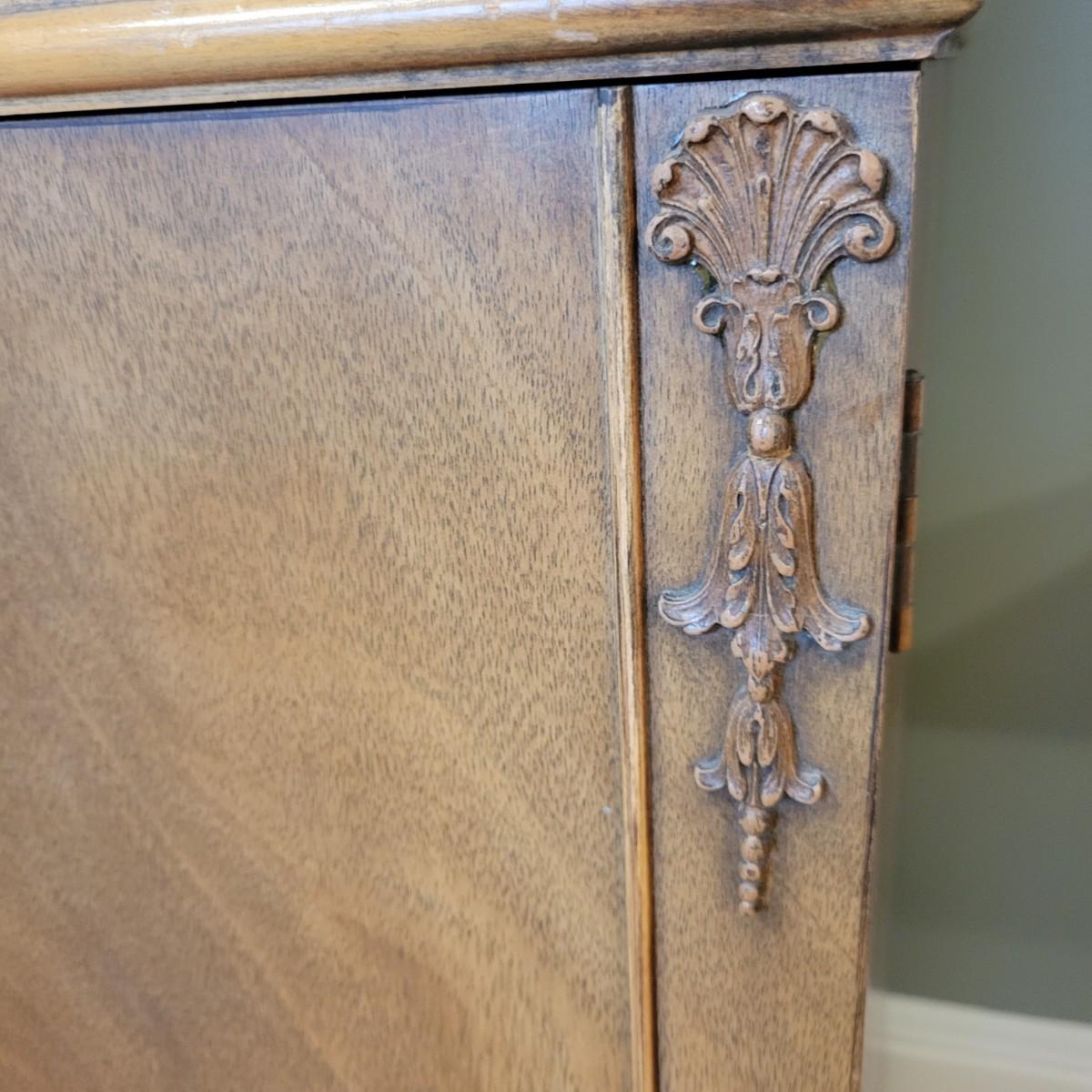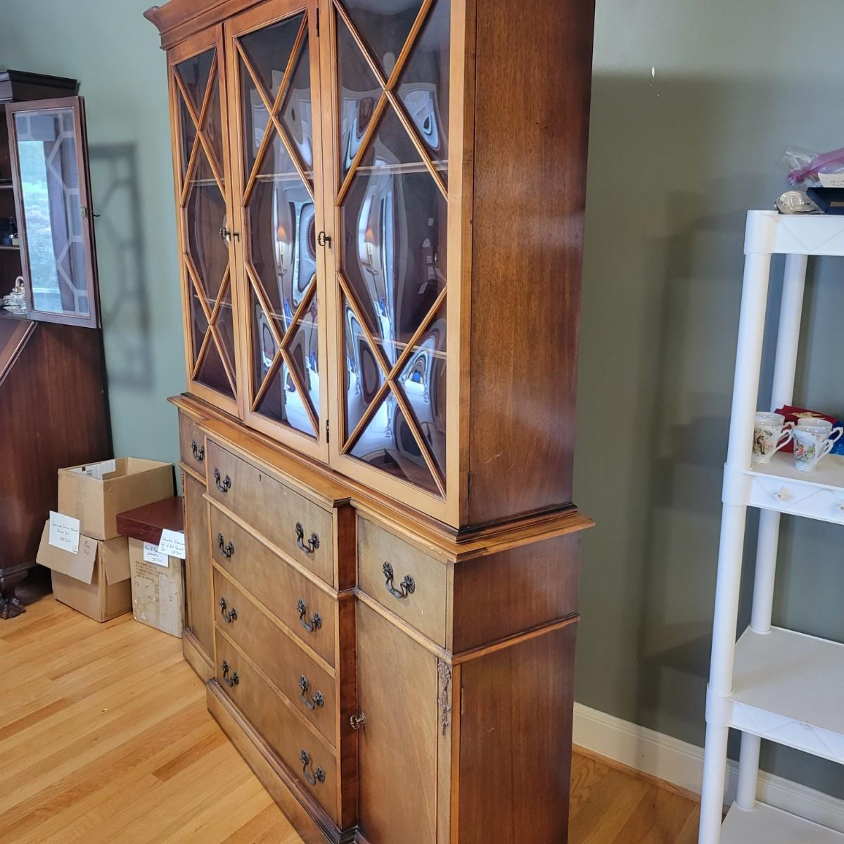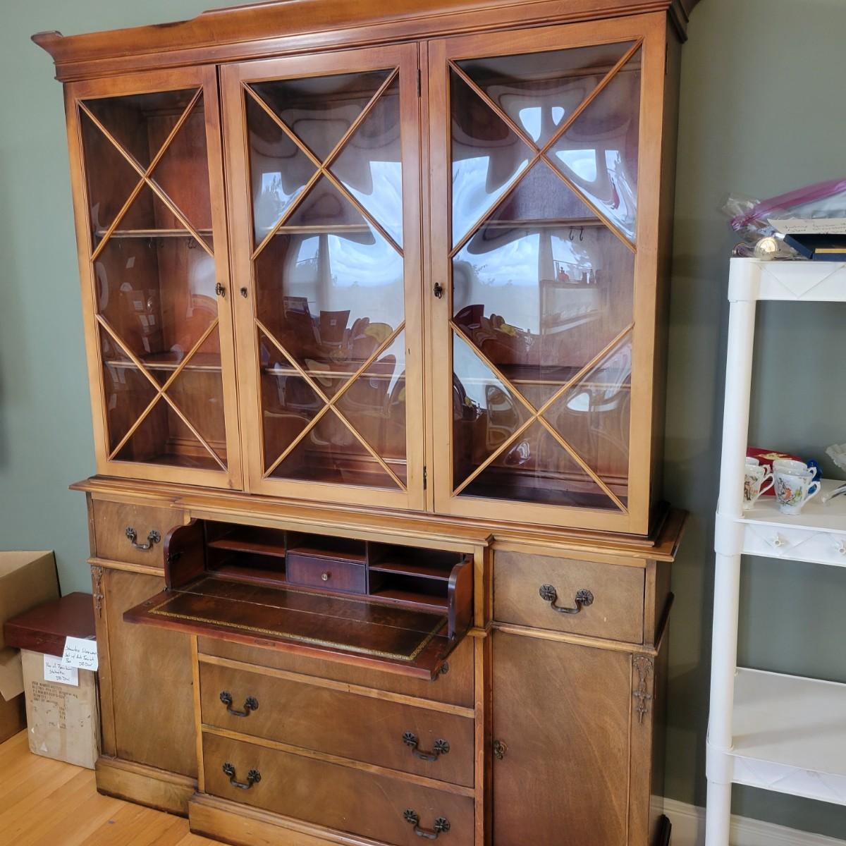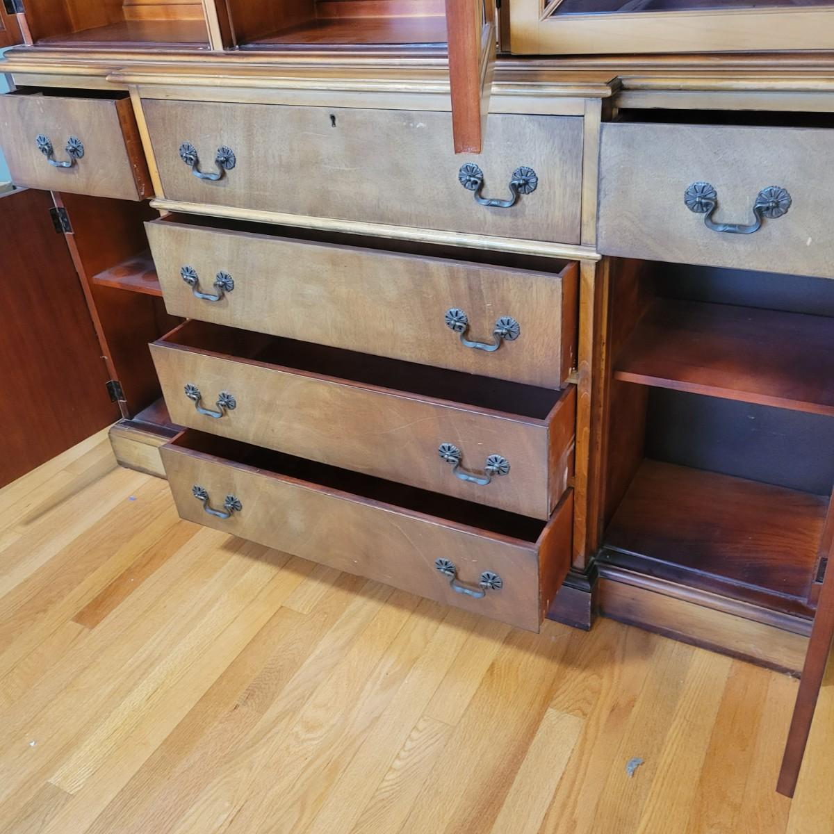 A vintage dining room breakfront hutch manufactured by Saginaw Furniture Co, Inc that is in good condition with some damage. Two pieces of hardware are broken, one of the wood carvings is chipped and there are scratches on the piece from use. The top center drawer pulls out to make a writing desk. This hutch features curved glass, adjustable shelves, dovetailed drawers and more. Measures approximately 60" x 14" x 78". The hutch and base are joined with a multitude of flathead screws and will likely need to be separated to move. The winning bidder needs to bring help to move the item as it is heavy and will need to go down some stairs to get to your car. Local pickup only