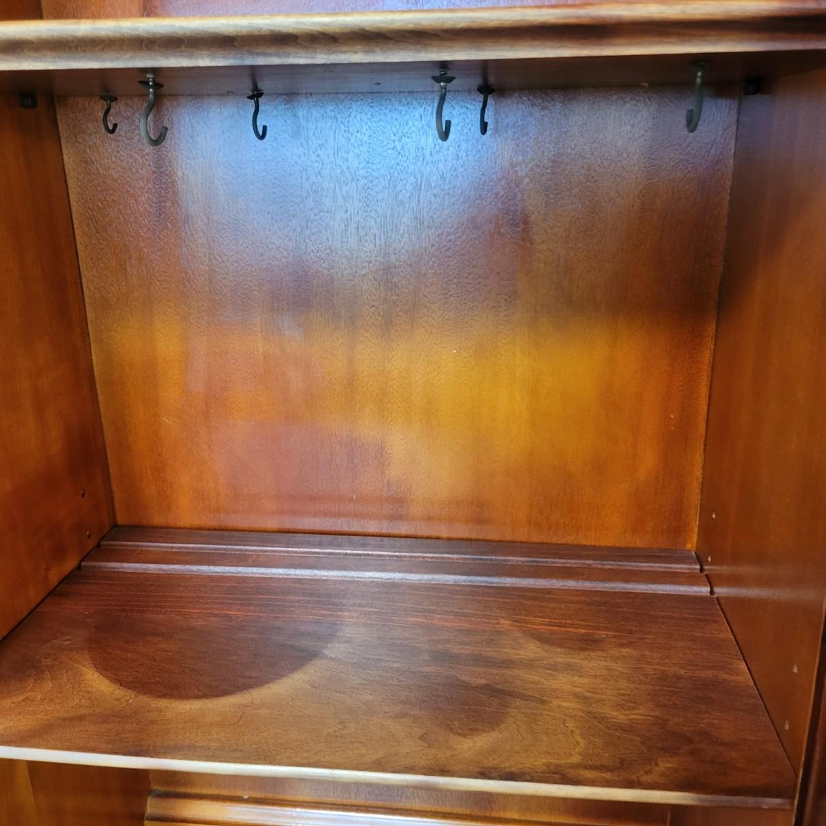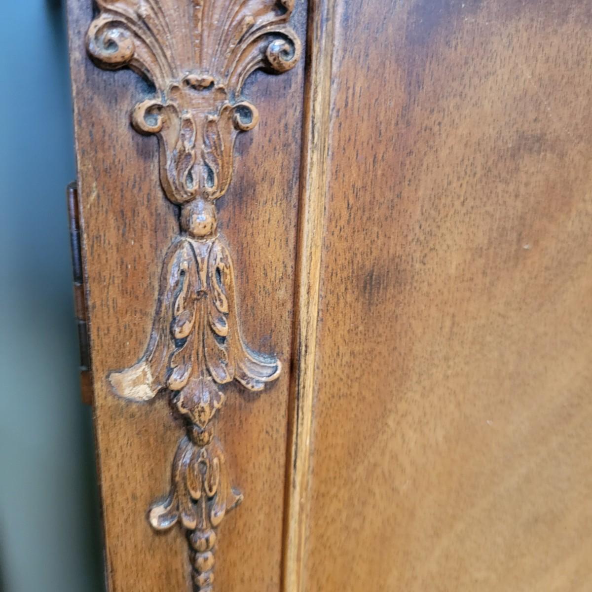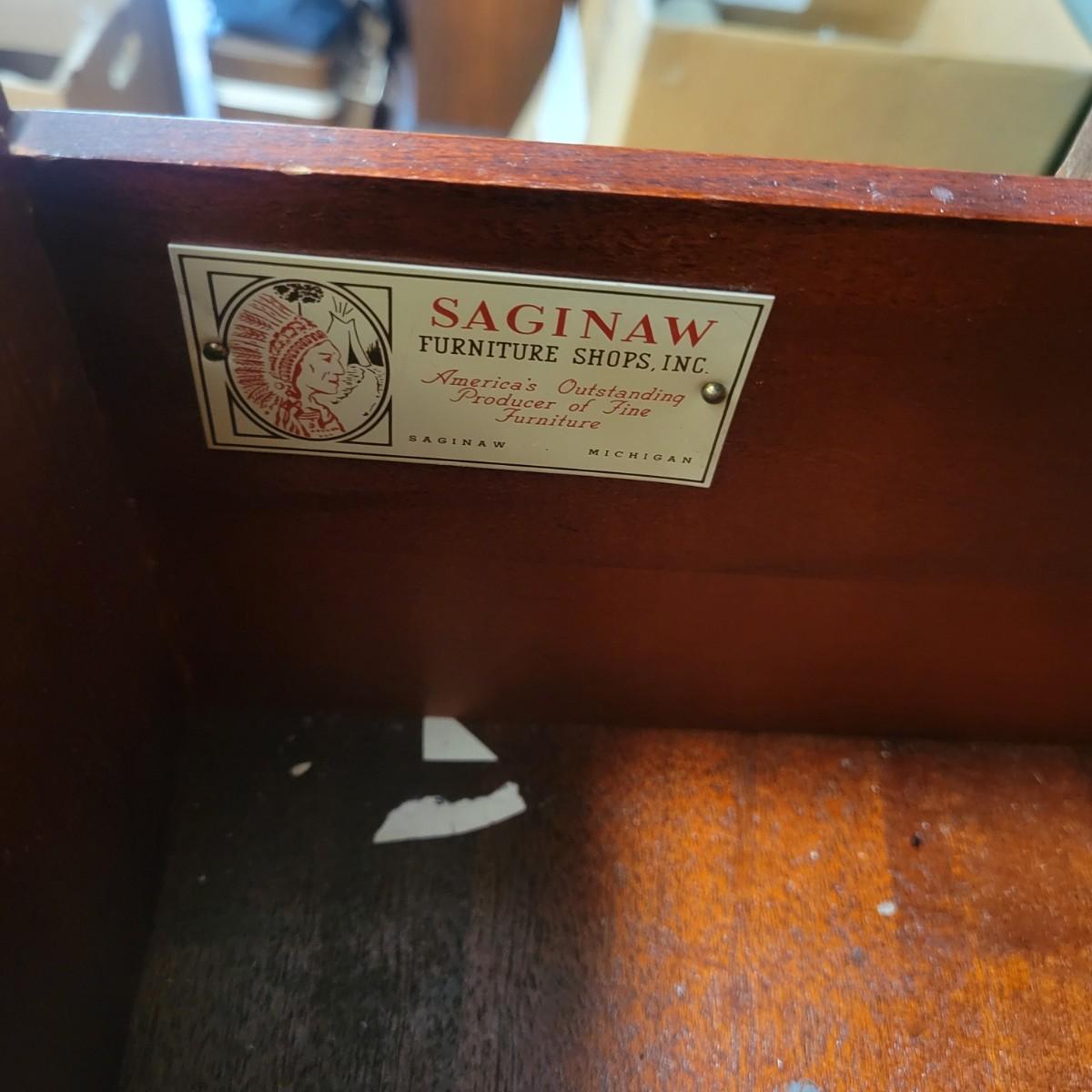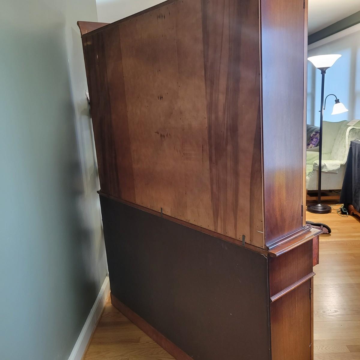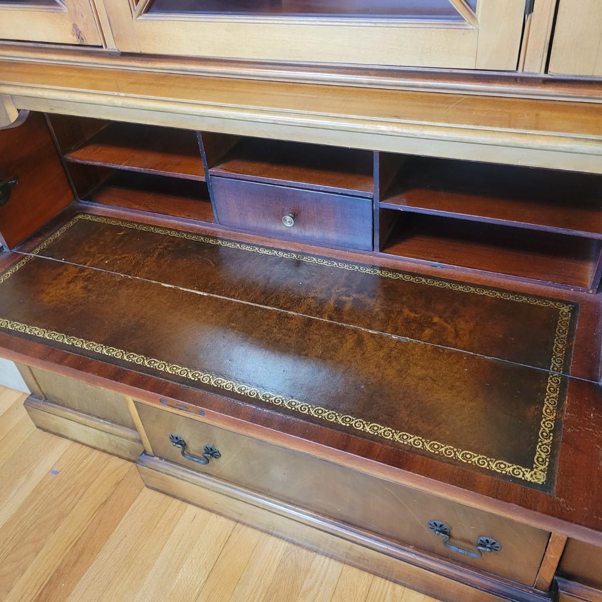 A vintage dining room breakfront hutch manufactured by Saginaw Furniture Co, Inc that is in good condition with some damage. Two pieces of hardware are broken, one of the wood carvings is chipped and there are scratches on the piece from use. The top center drawer pulls out to make a writing desk. This hutch features curved glass, adjustable shelves, dovetailed drawers and more. Measures approximately 60" x 14" x 78". The hutch and base are joined with a multitude of flathead screws and will likely need to be separated to move. The winning bidder needs to bring help to move the item as it is heavy and will need to go down some stairs to get to your car. Local pickup only