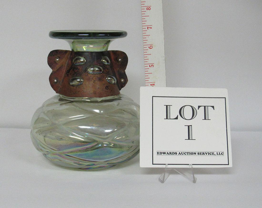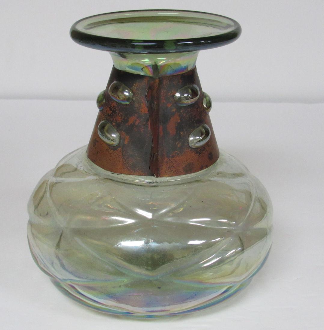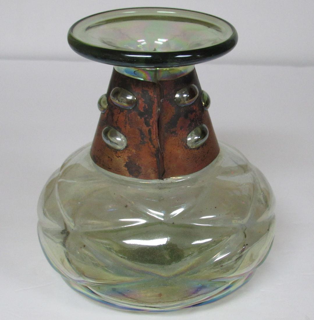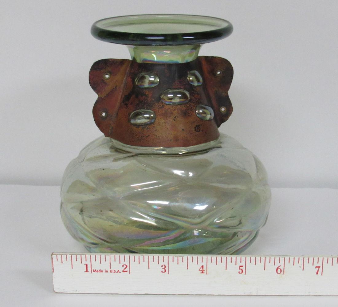 I don't see any chips or cracks. There is dirt on the bottom inside, did not try to clean. The copper collar is so neat where the bubbles in the neck of the vase come through the piercings in the copper. The bottom has a quilted pattern, and the whole thing has been iridized. It is a very pale green color. Shipping is available at shipping cost plus $5.00 handling fee on up to 8 lots, $10.00 handling fee on 9 or more lots or two boxes.