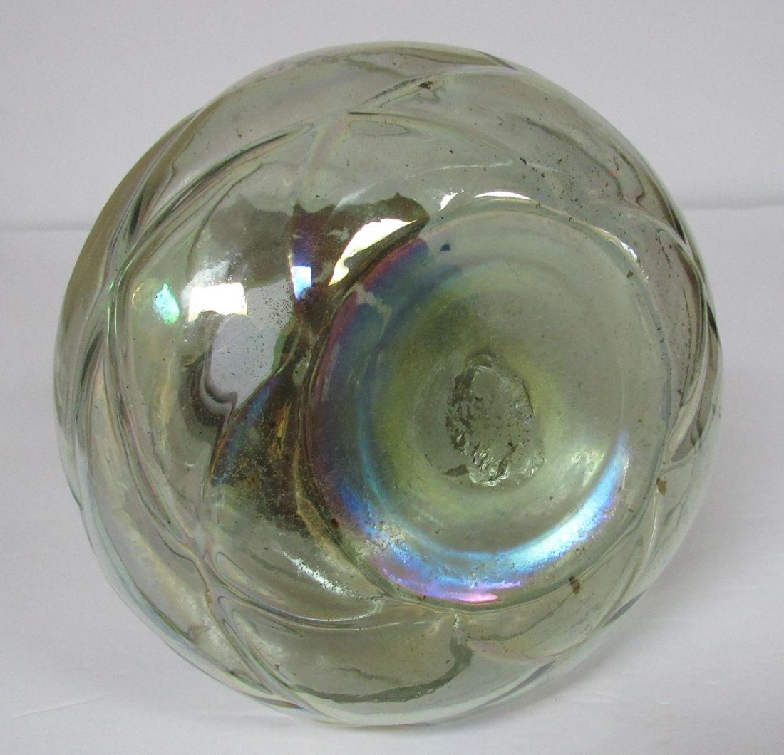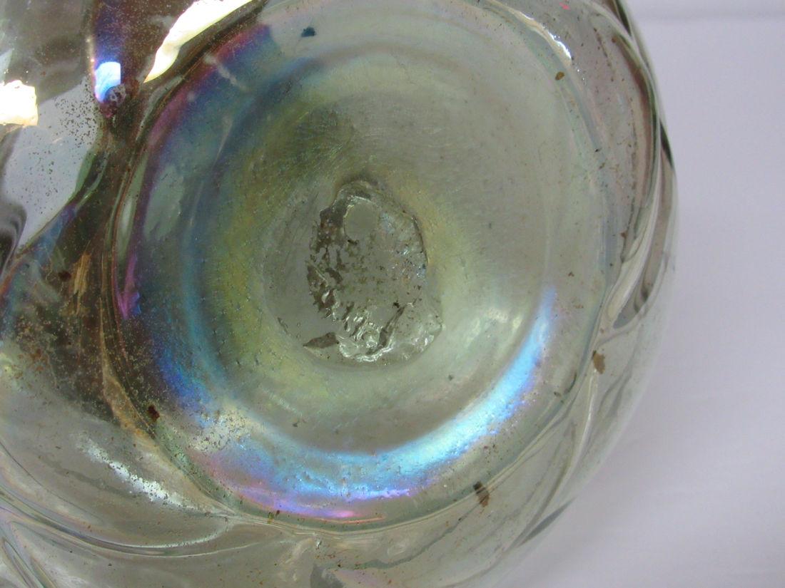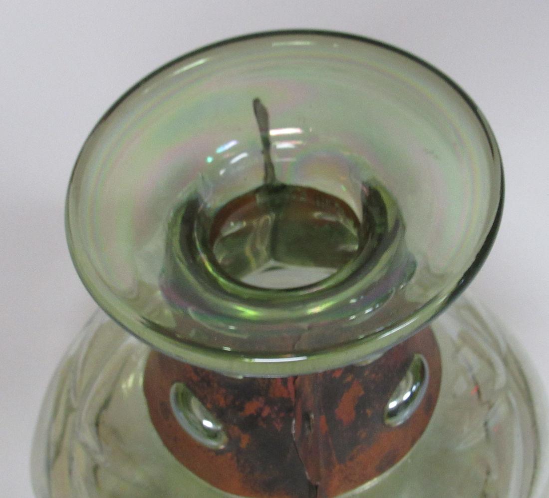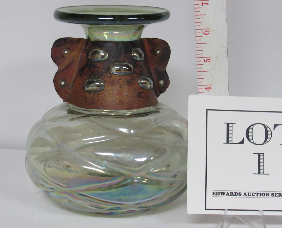 I don't see any chips or cracks. There is dirt on the bottom inside, did not try to clean. The copper collar is so neat where the bubbles in the neck of the vase come through the piercings in the copper. The bottom has a quilted pattern, and the whole thing has been iridized. It is a very pale green color. Shipping is available at shipping cost plus $5.00 handling fee on up to 8 lots, $10.00 handling fee on 9 or more lots or two boxes.