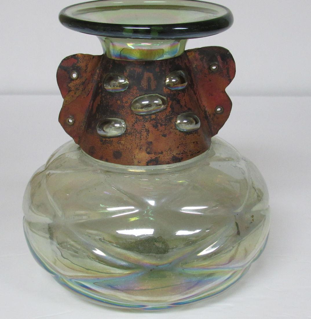 Vintage Bohemian/Czechoslovakian Art Glass Vase With Copper Collar, Great Pontil On Bottom, Iridized