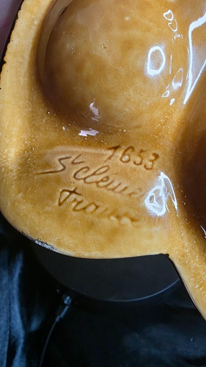 Saint-Clément, a historic French pottery house known for faience, majolica, and finely-crafted tableware, produced pieces with a balance of rustic elegance and continental flair. Model 1653 follows this tradition: thoughtful in shape, rich in glaze, and sturdy in construction. The base is marked with the Saint-Clément imprint and the model number, confirming its origin and adding collectible value. Some examples also feature personal dedications or artist initials, often inscribed under the glaze, making each plate subtly unique.