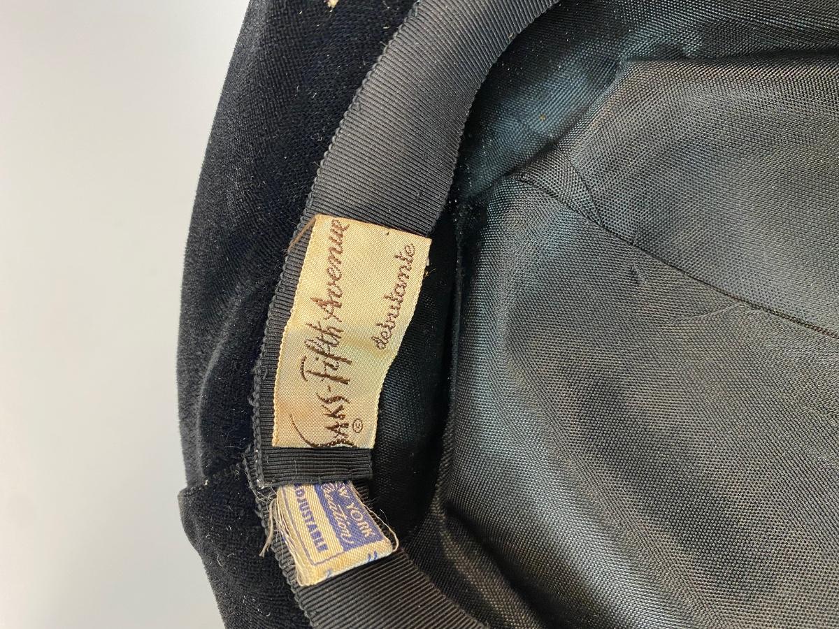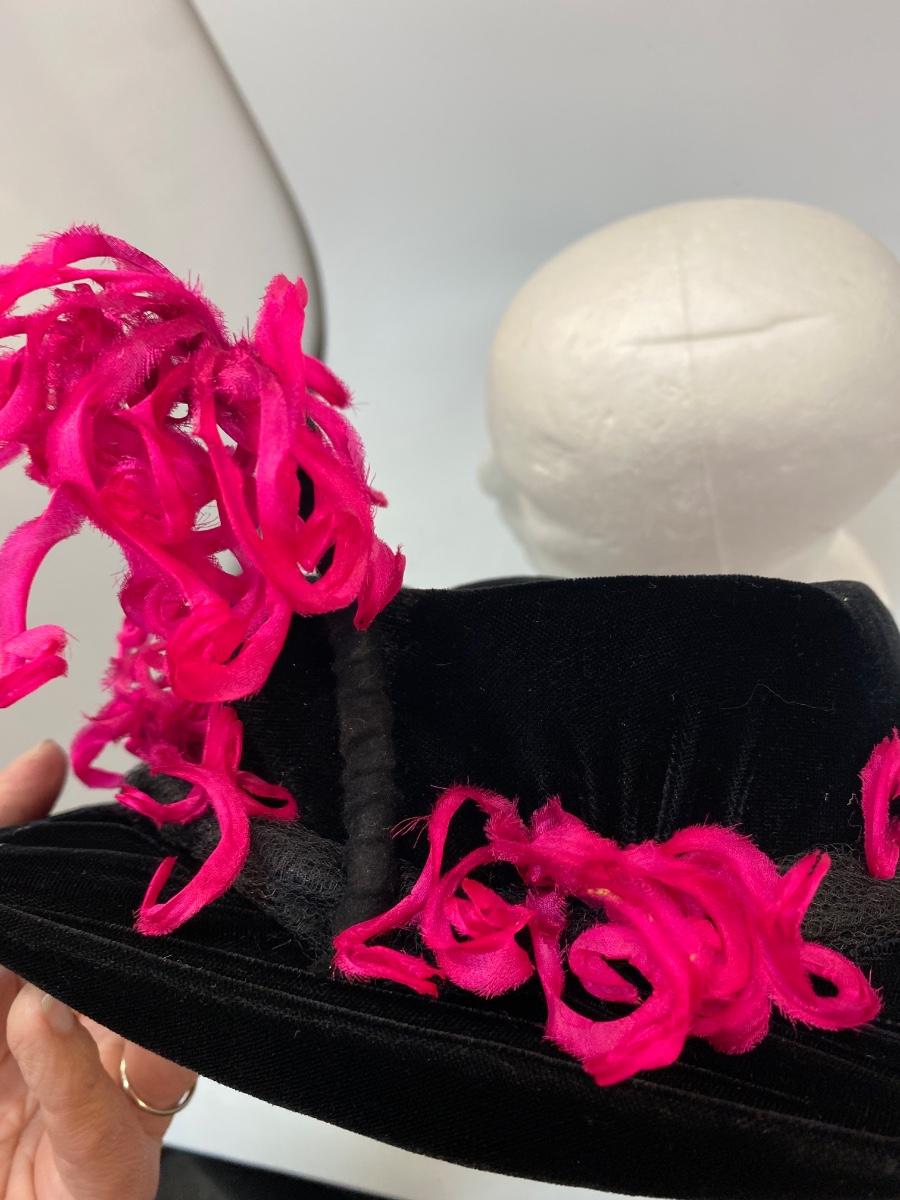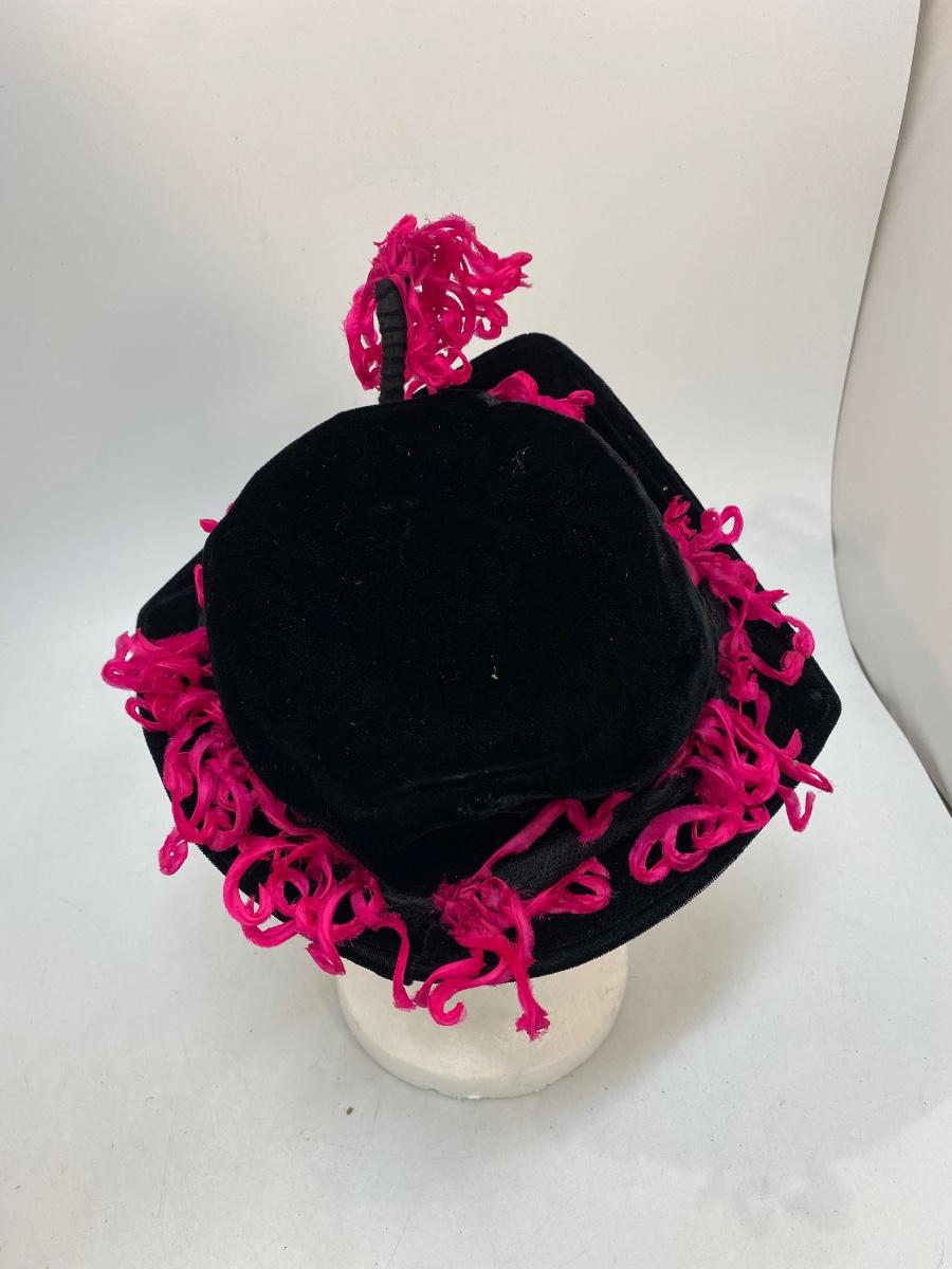Vintage Saks Fifth Avenue Debutante Black Velvet & Hot Pink Frill Hat Cap