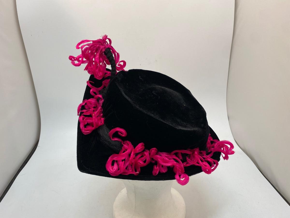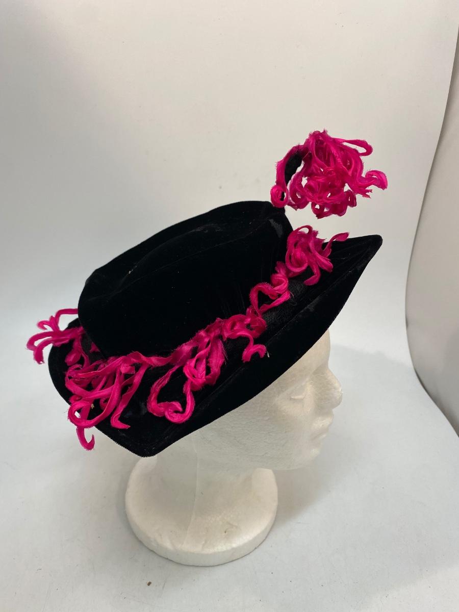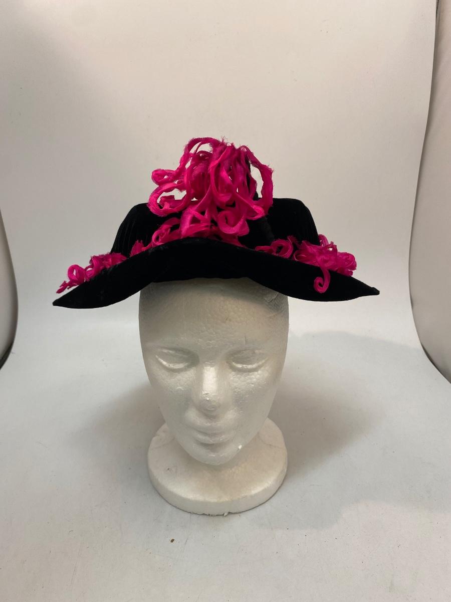 Vintage Saks Fifth Avenue Debutante Black Velvet & Hot Pink Frill Hat Cap. Interesting vintage hat has a semi pointed front with a rounded back. Hot pink frilly ribbon adds some pop of color. Has maker label inside. Sits more like a fascinator or hatinator.