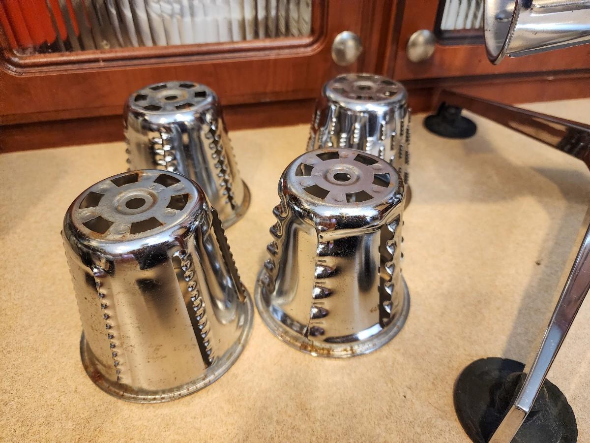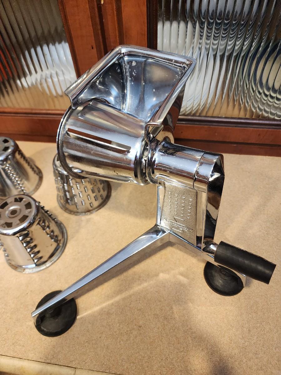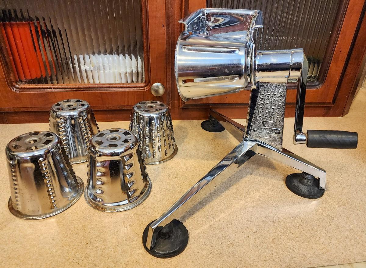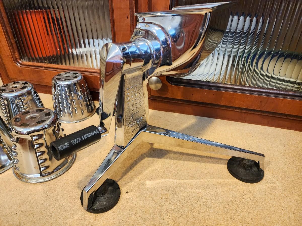 This handy, simple-to-use food processor is the original Saladmaster product. It became an icon of the mid-century American kitchen for its ingenious design and superior functionality “” allowing you to slice and grate all types of foods, including vegetables, fruits, nuts, cheeses, and meats. The heavily chrome-plated base and hopper is guaranteed not to chip, peel, or pit, giving you a lifetime of superb service. The five micro-keen cutting cones are constructed of high quality stainless steel and consist of a shredder, stringer, French fryer, thin slicer, and waffle cutter.