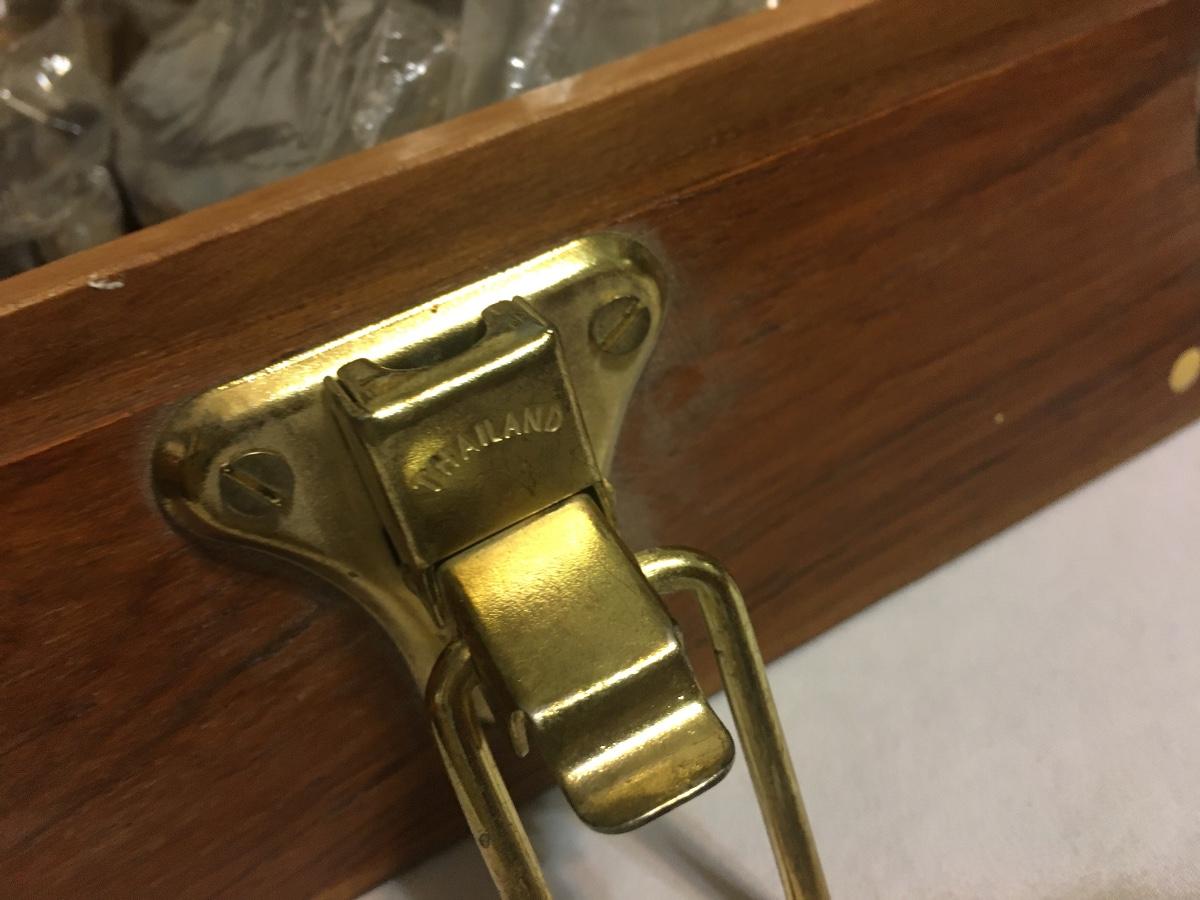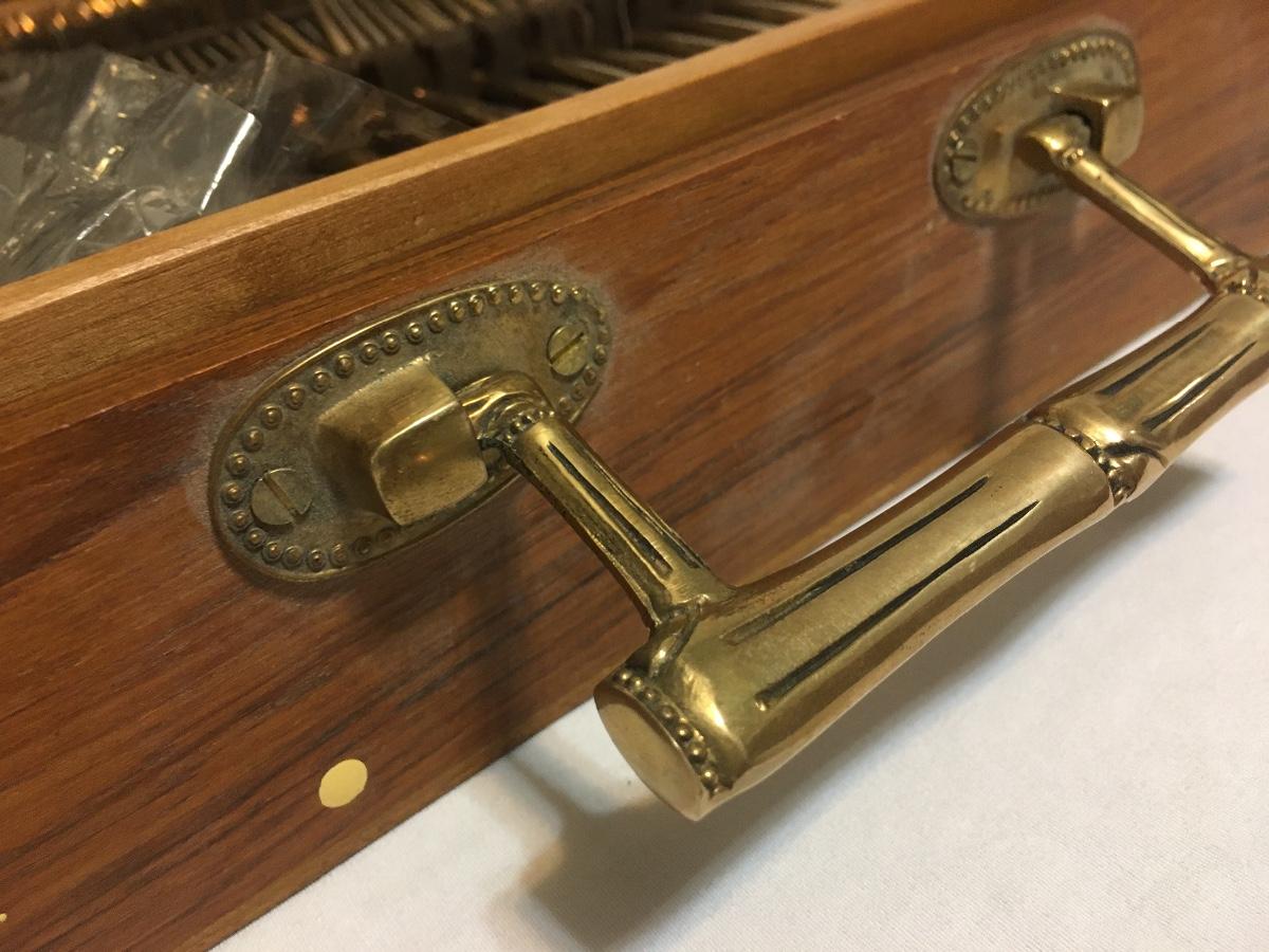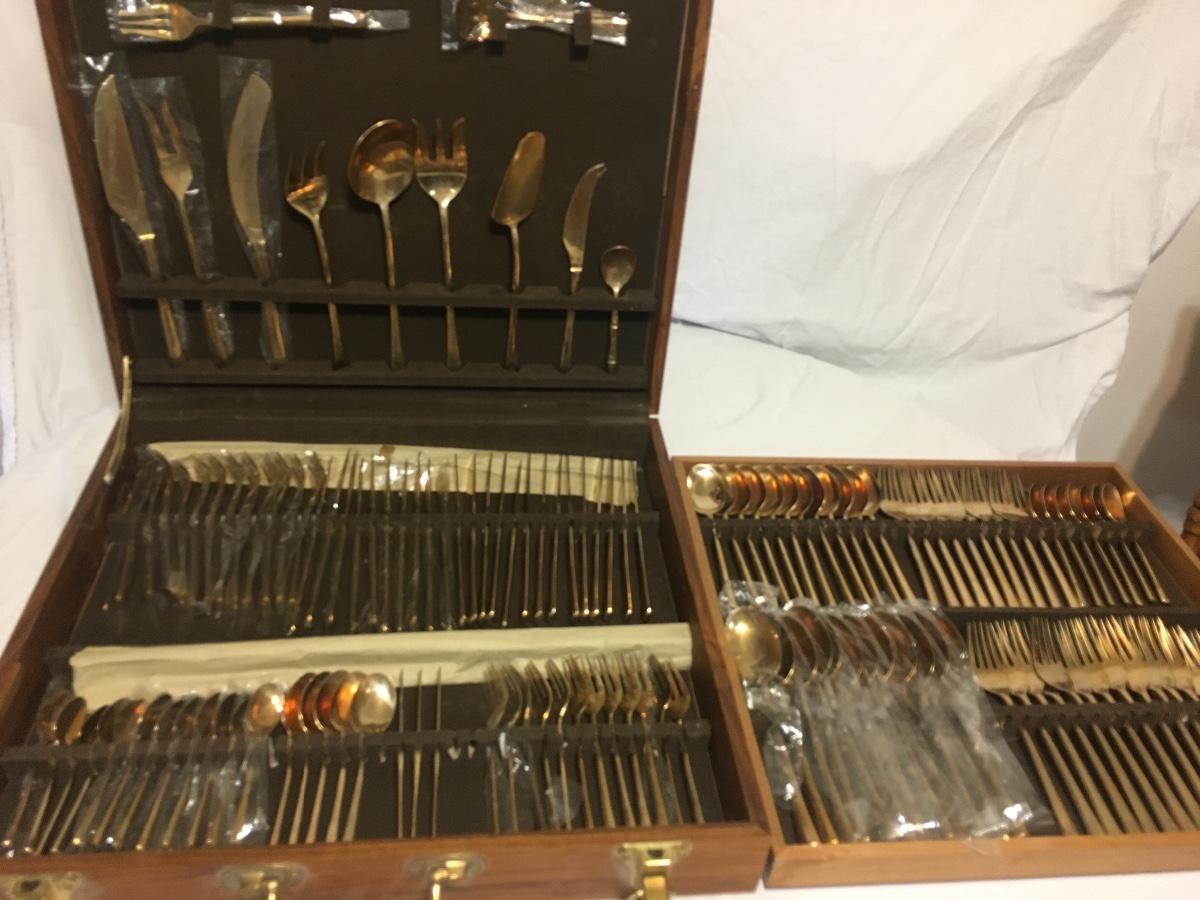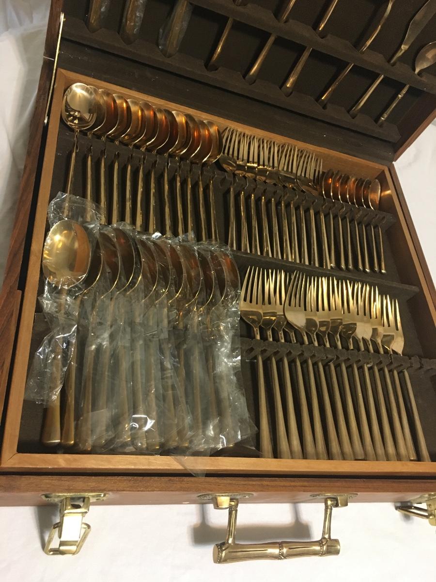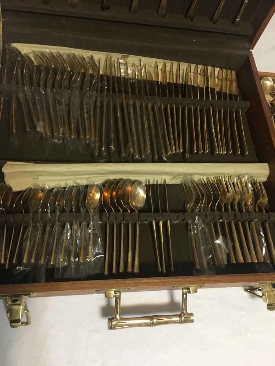 Vintage Salesman Sample case 134 pc Stainless Nickel Bronze Set in Gorgeous Wood Bronze Case