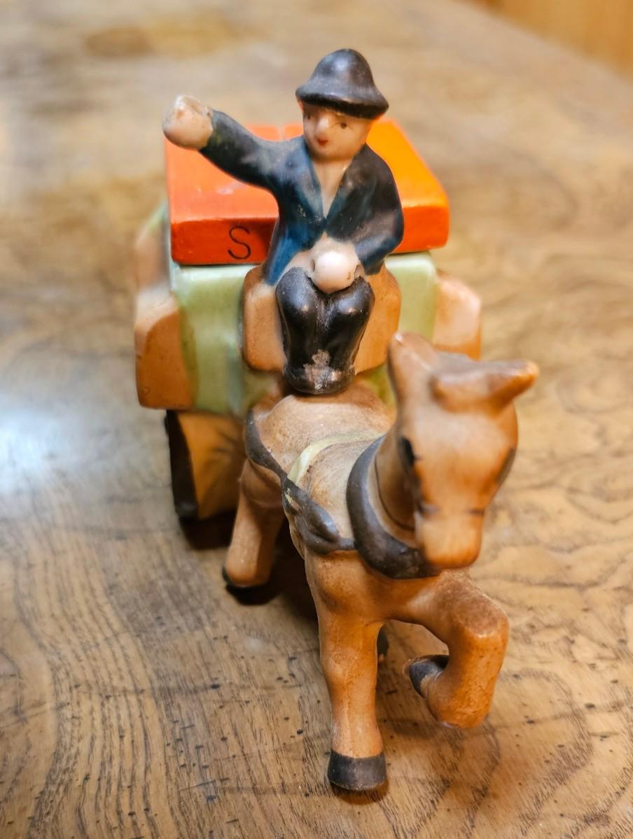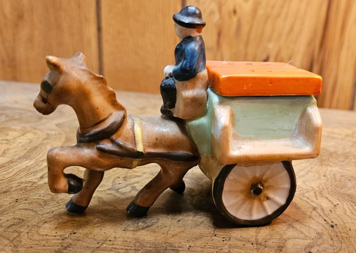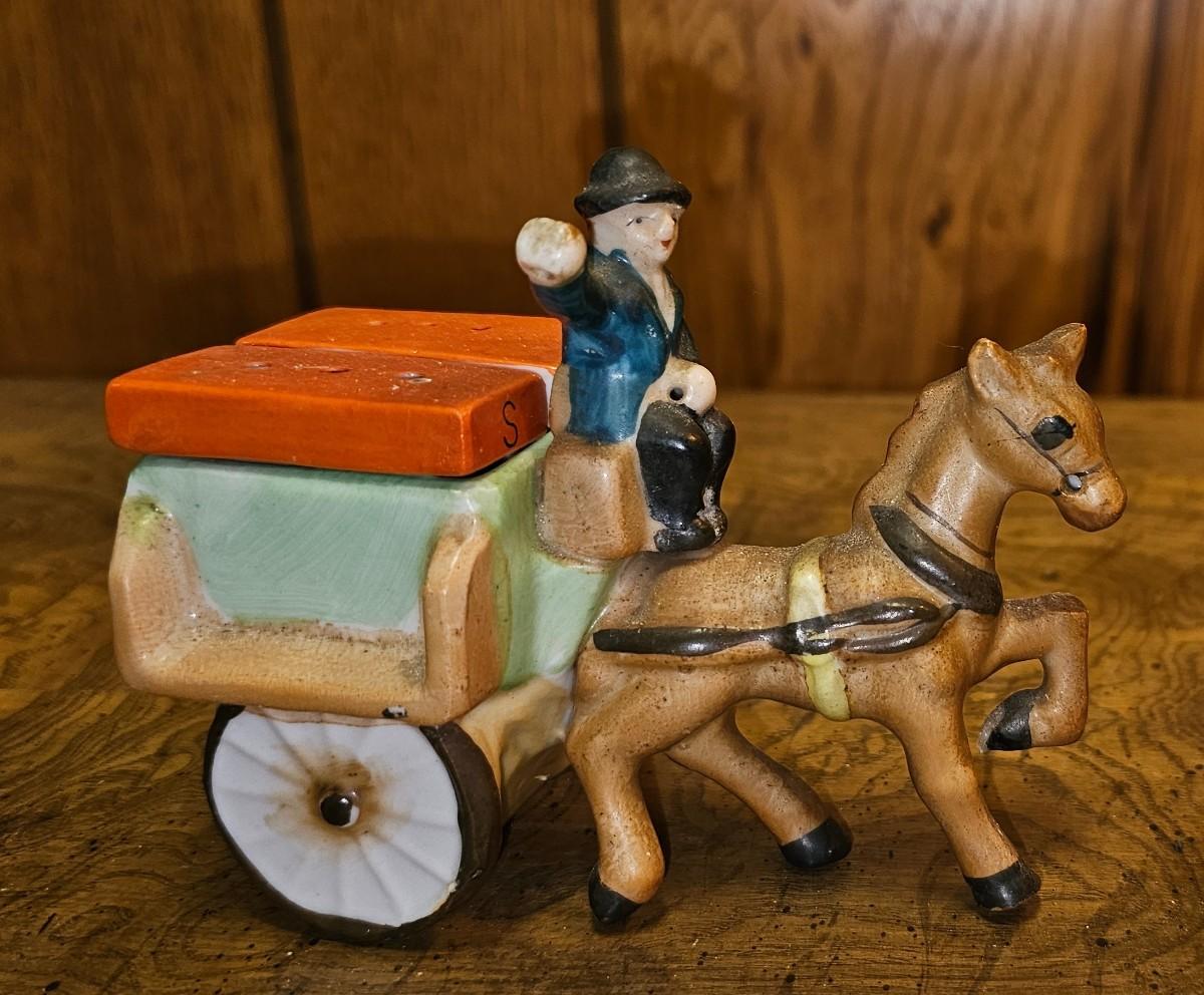 Vintage novelty salt and pepper set, an Irish jaunting cart. Traditional horse and cart, shire horse with a bowler hatted gentleman holding the reins. Salt and pepper pots are orange rectangular containers, sitting side by side, fitting into the cart. Entire horse & carriage measure approx 4 and a half " in length, just under 4" in height, and 2" in width. Both salt & pepper pots approx 1 and half " in length, 1" in height, both with original cork stoppers. . Very good condition.