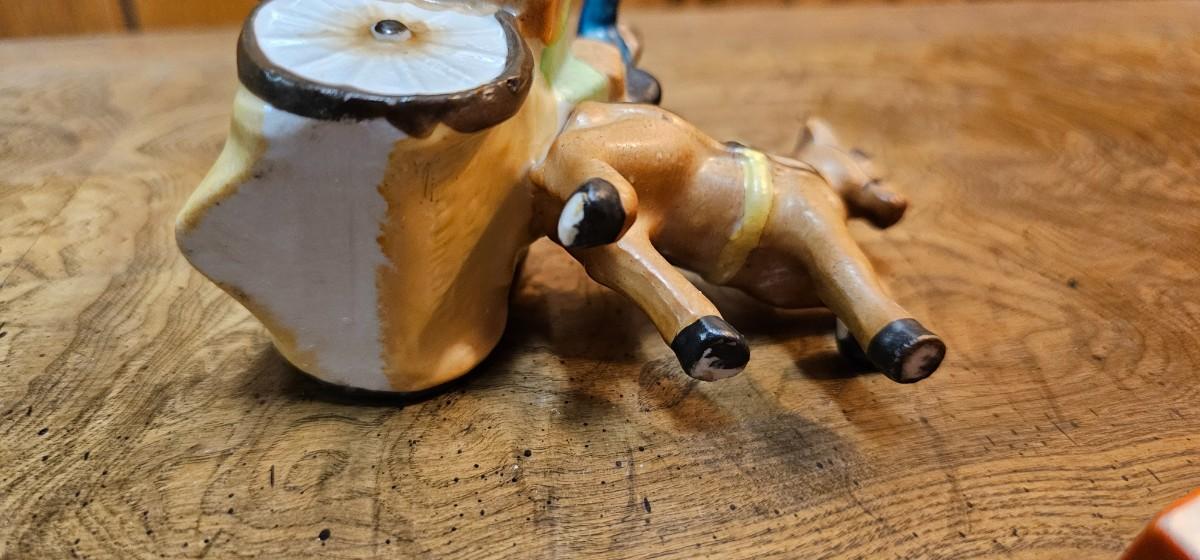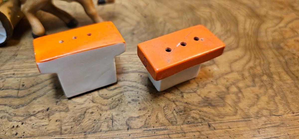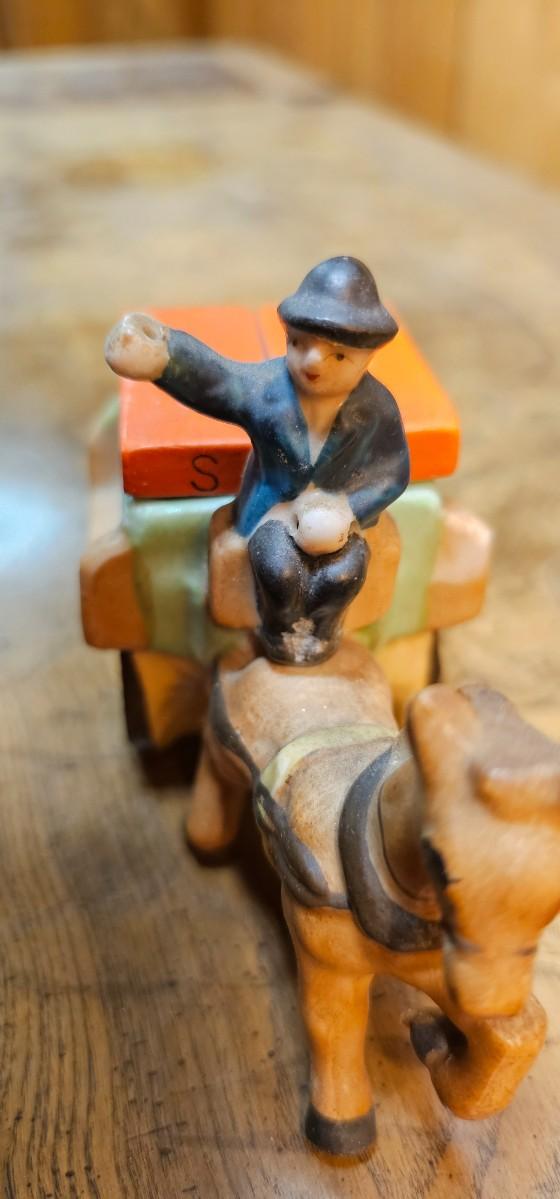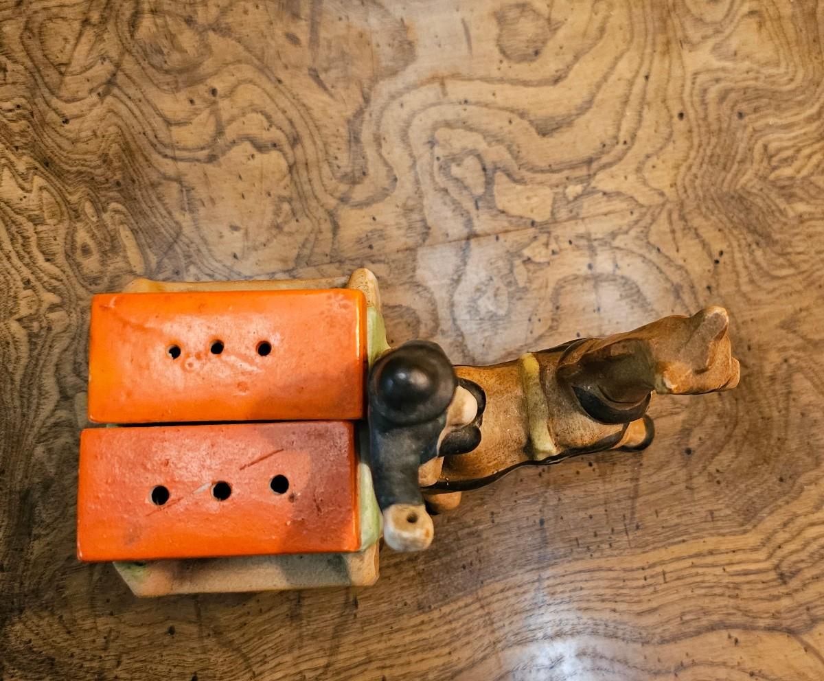 Vintage novelty salt and pepper set, an Irish jaunting cart. Traditional horse and cart, shire horse with a bowler hatted gentleman holding the reins. Salt and pepper pots are orange rectangular containers, sitting side by side, fitting into the cart. Entire horse & carriage measure approx 4 and a half " in length, just under 4" in height, and 2" in width. Both salt & pepper pots approx 1 and half " in length, 1" in height, both with original cork stoppers. . Very good condition.