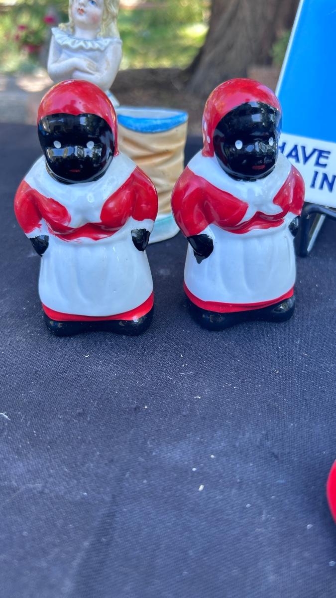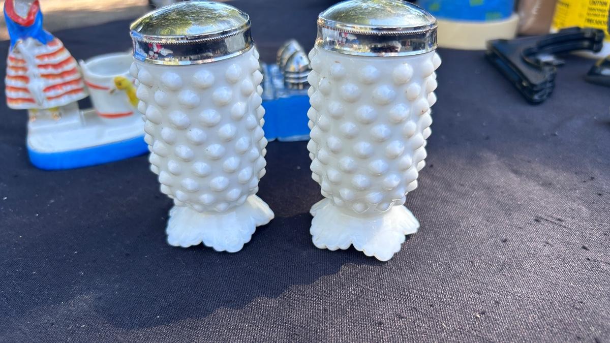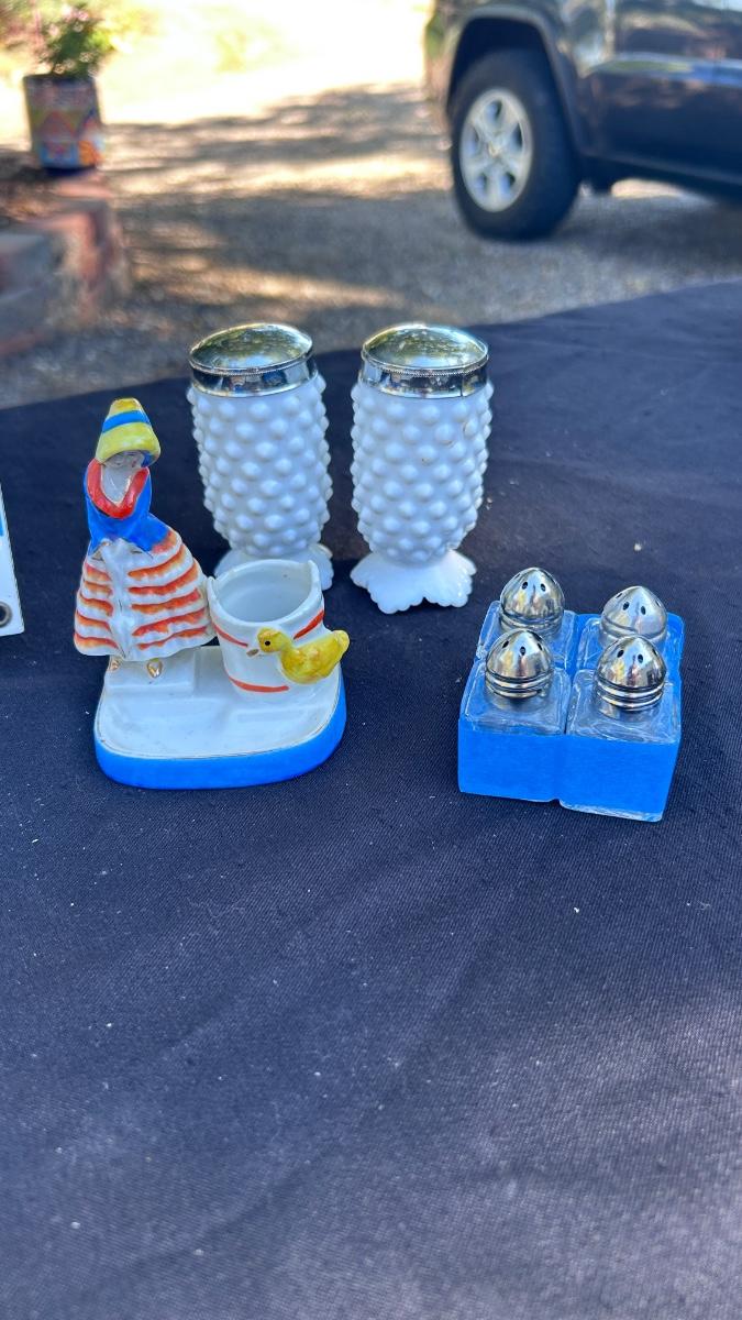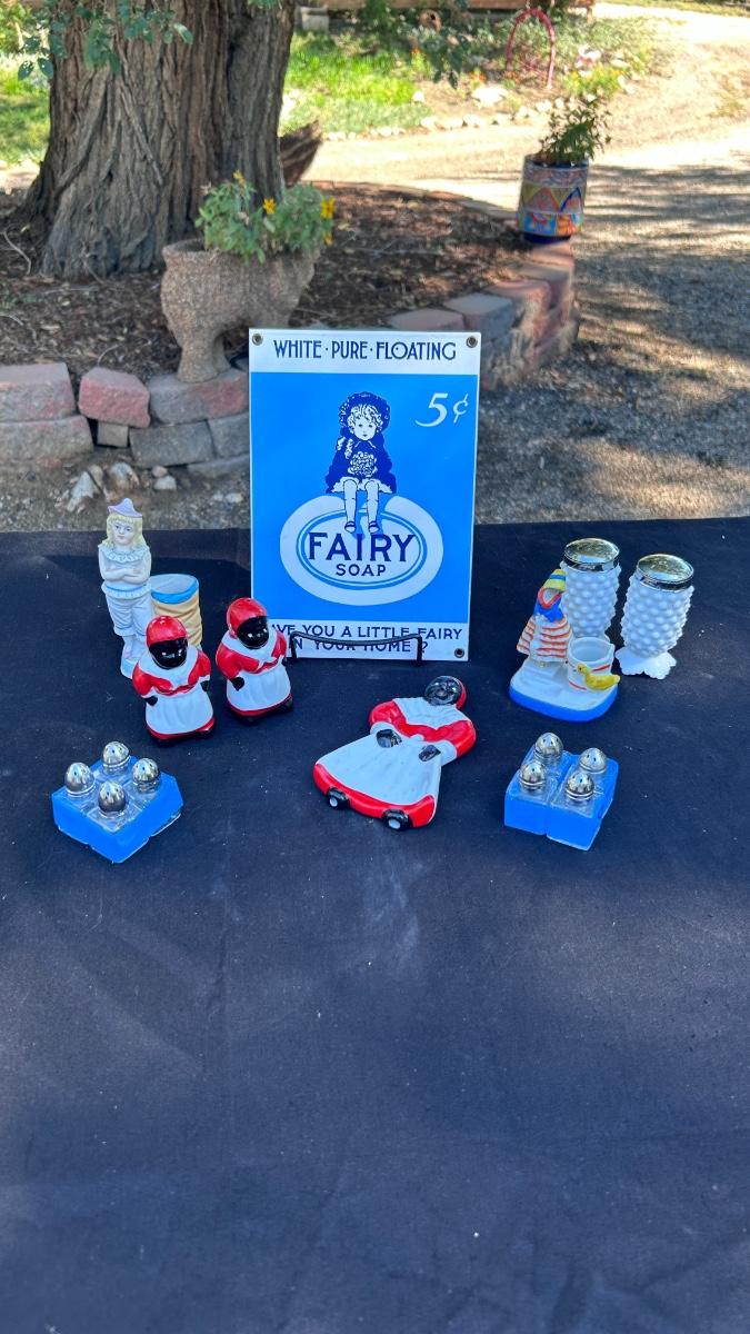 VINTAGE SALT AND PEPPER SHAKERS, TOOTHPICK HOLDERS, AND TIN SIGN